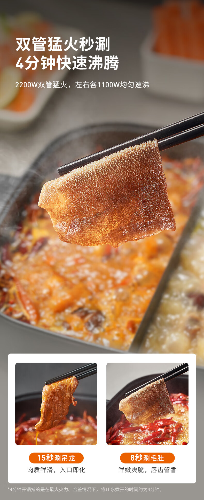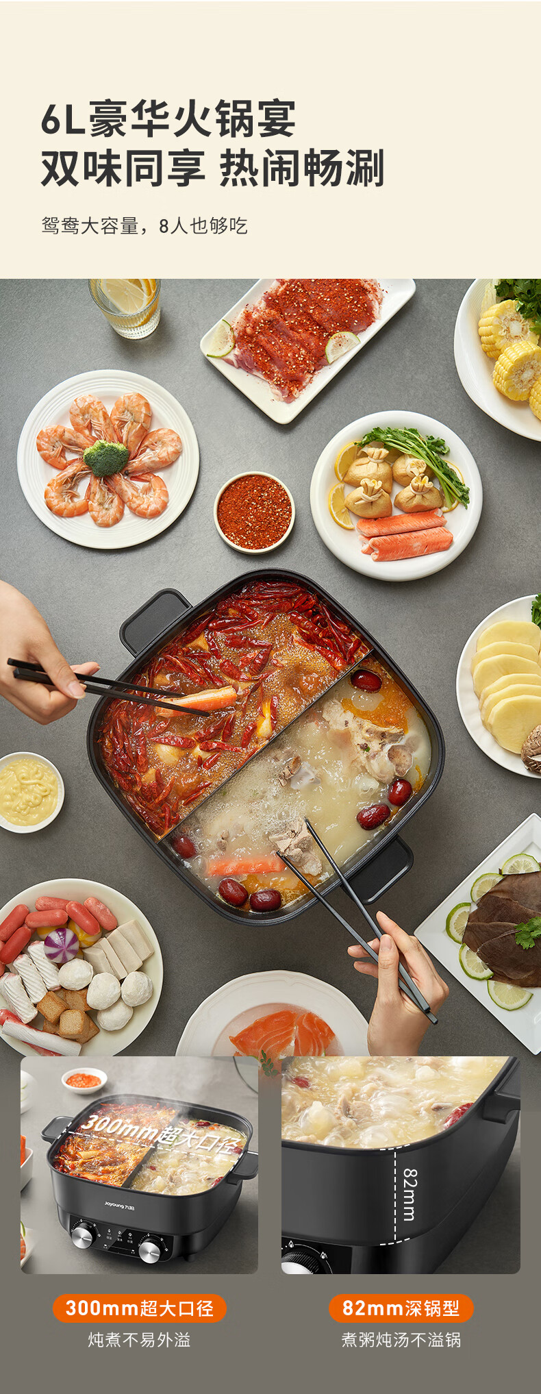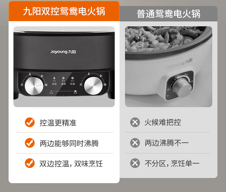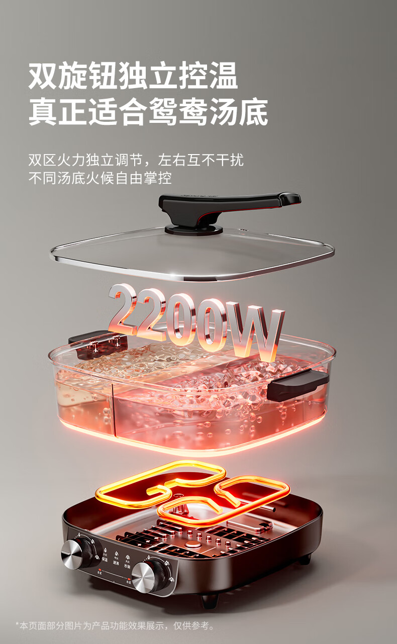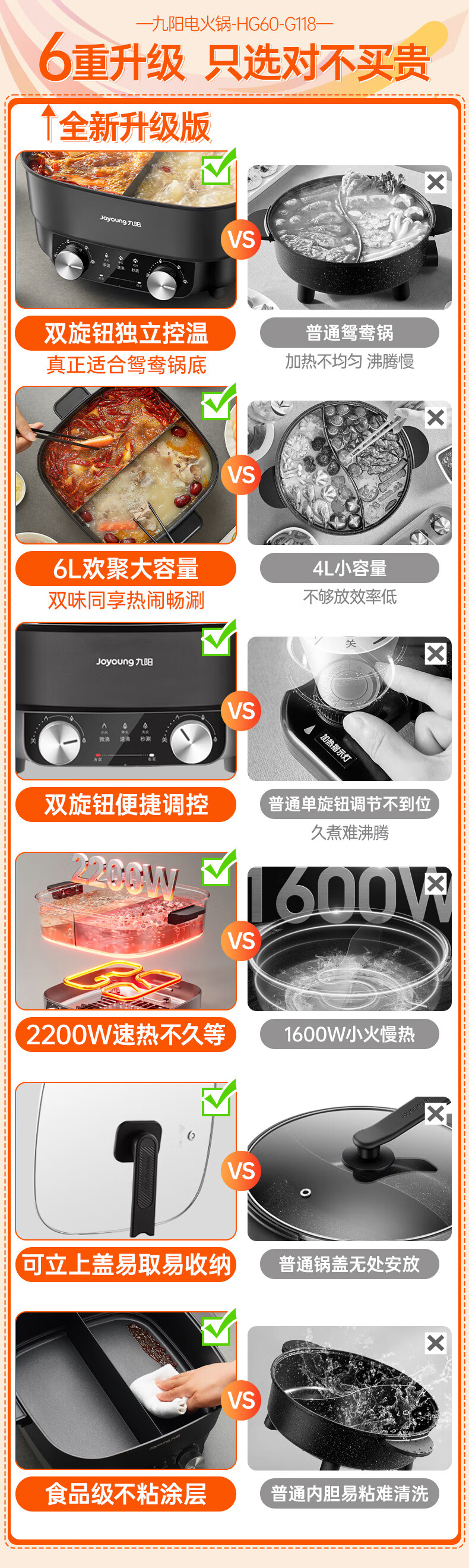 九阳(Joyoung)电火锅鸳鸯锅家用双区秒涮火锅专用锅一体式6L多功能锅涮肉锅多用途锅4分钟速沸独立控温HG60-G118