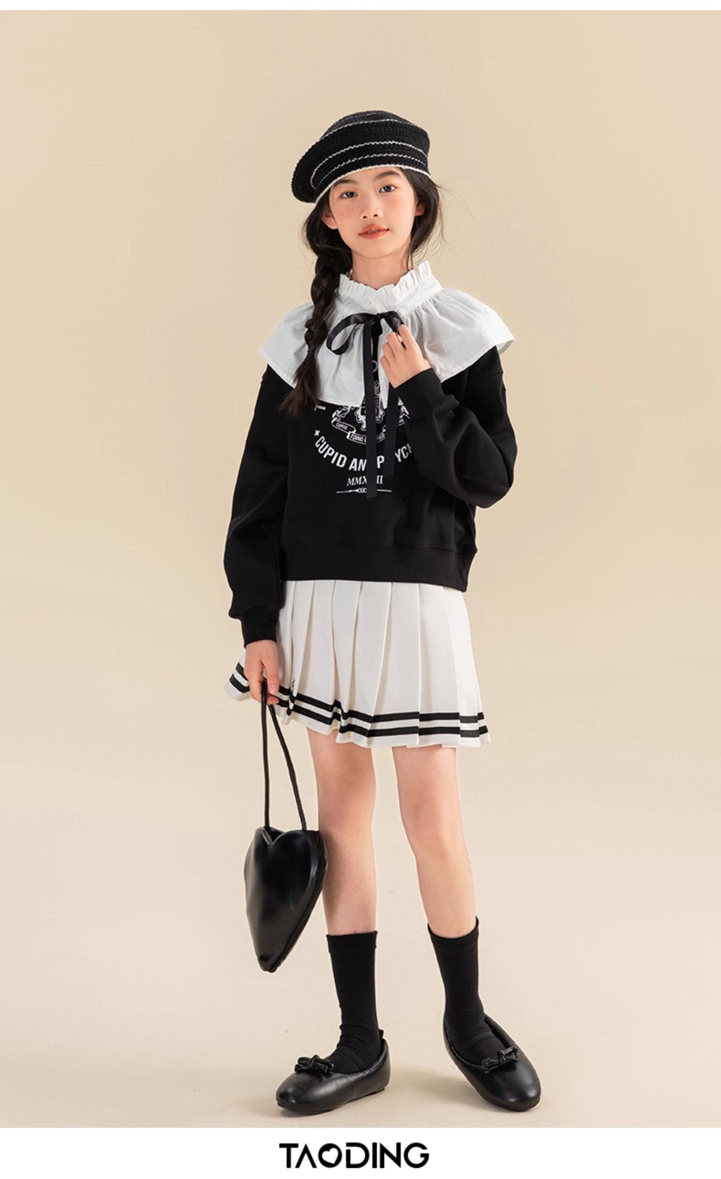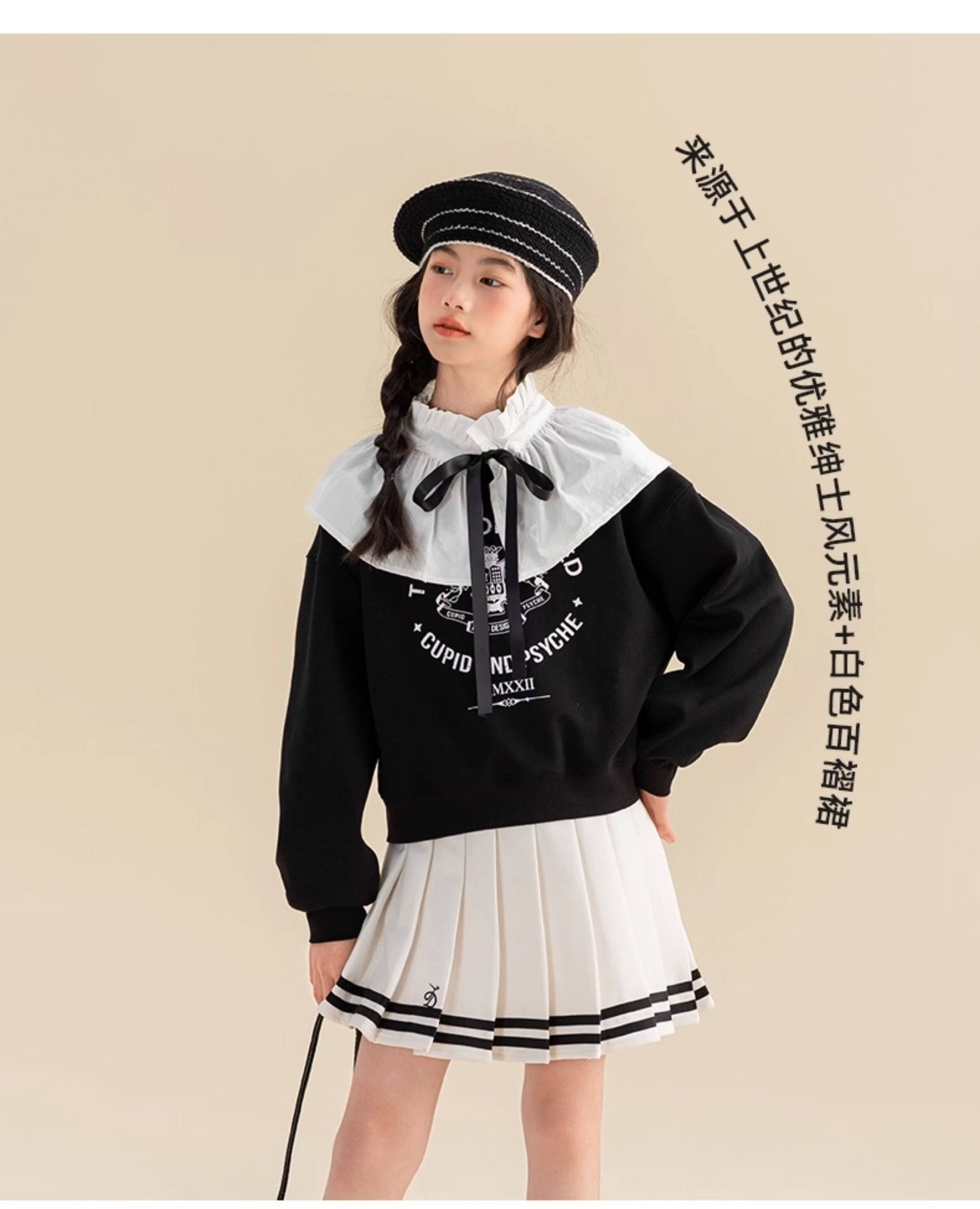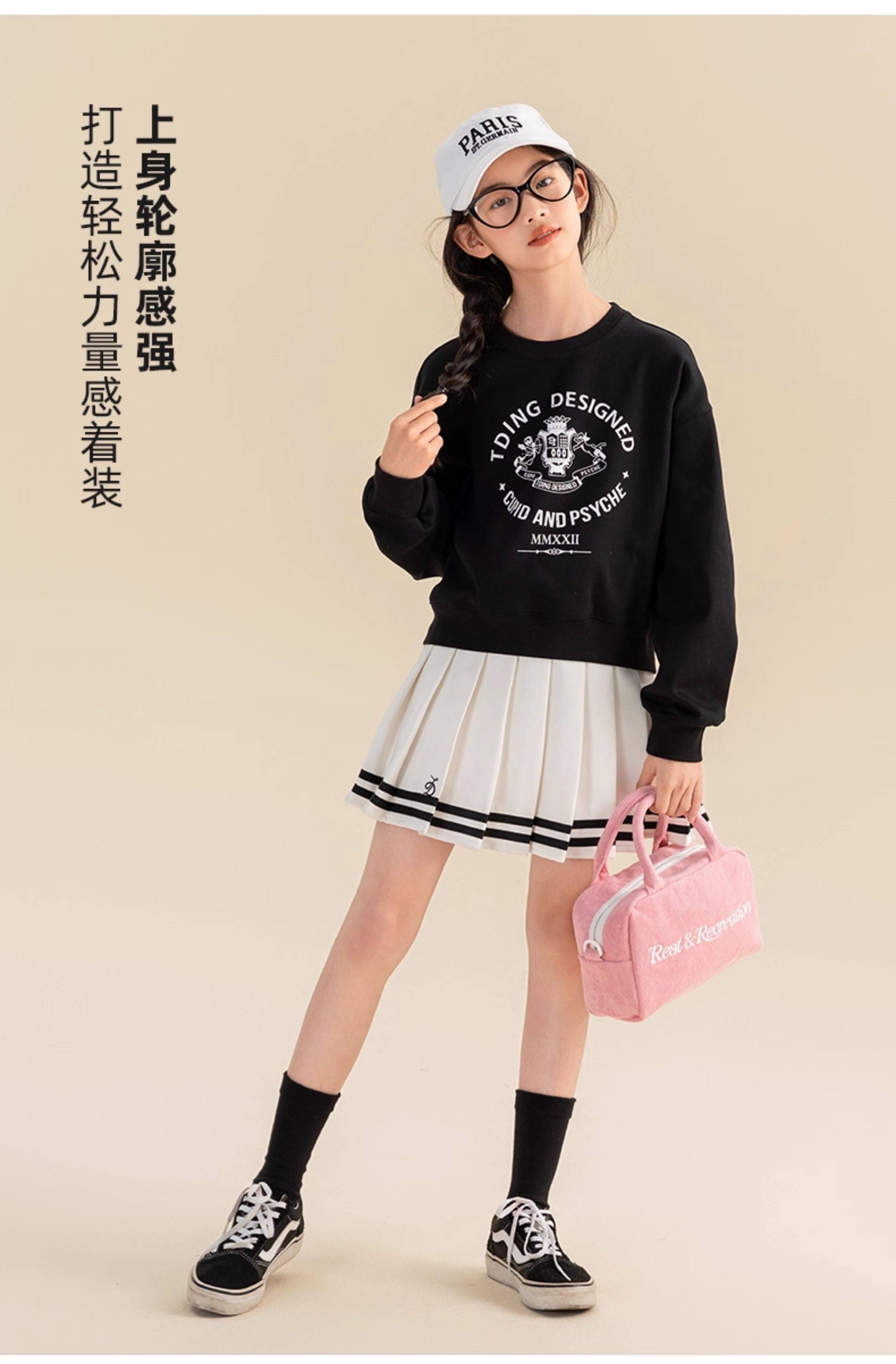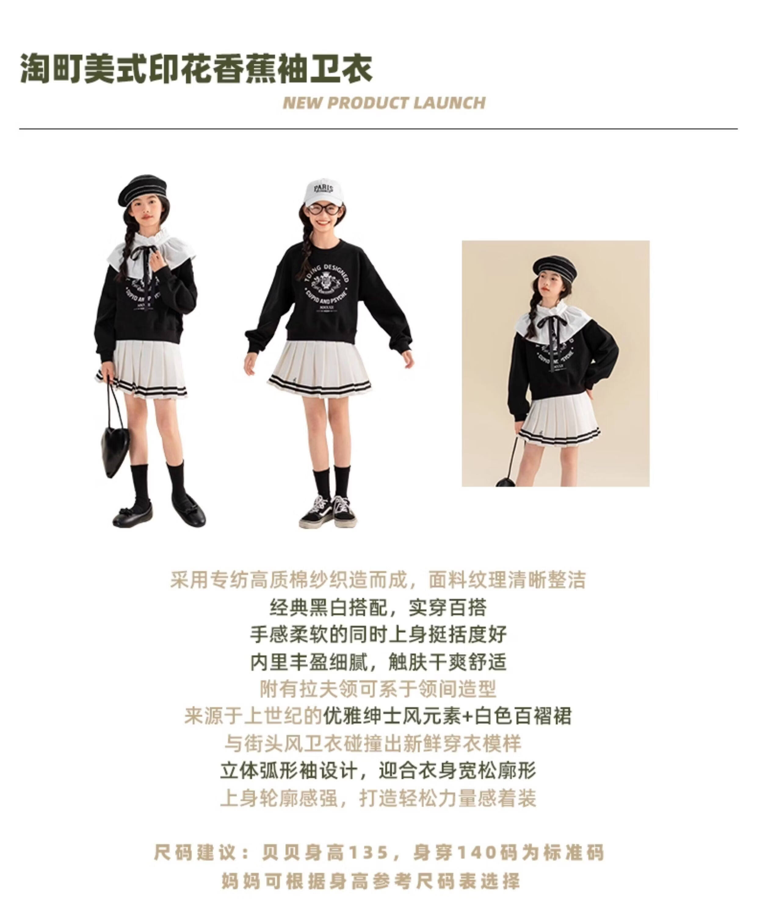 淘町女童赫克林卫衣春秋季新款中大童套头美式印花圆领学院风上衣 黑色 卫衣+送可拆披肩 170