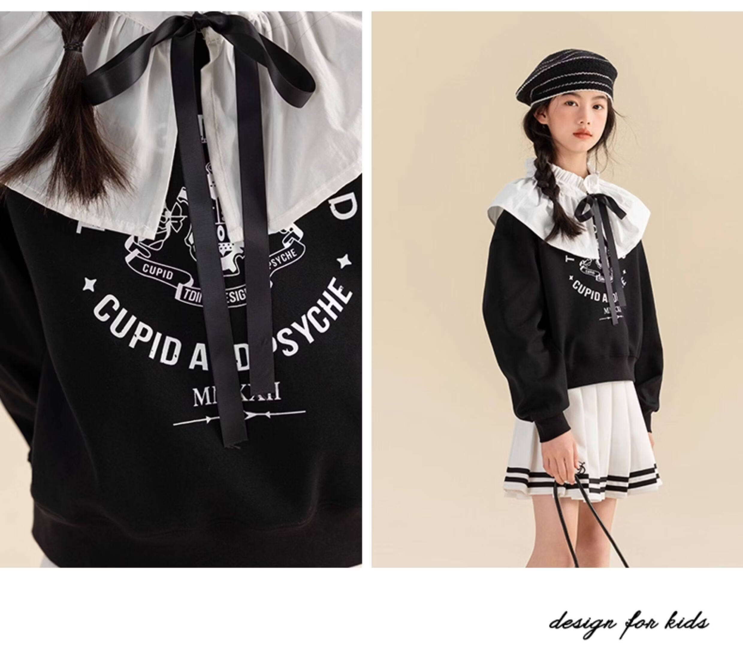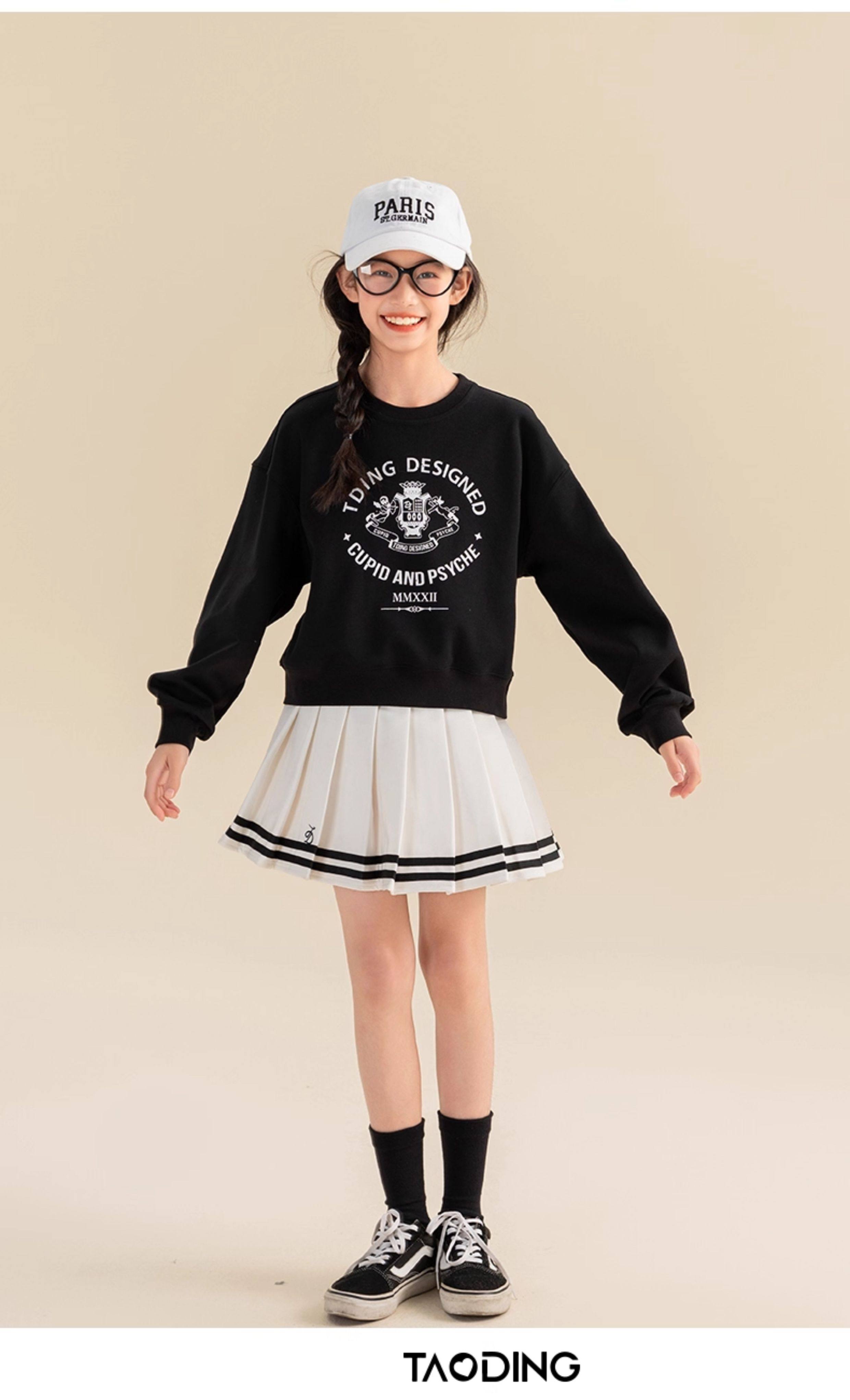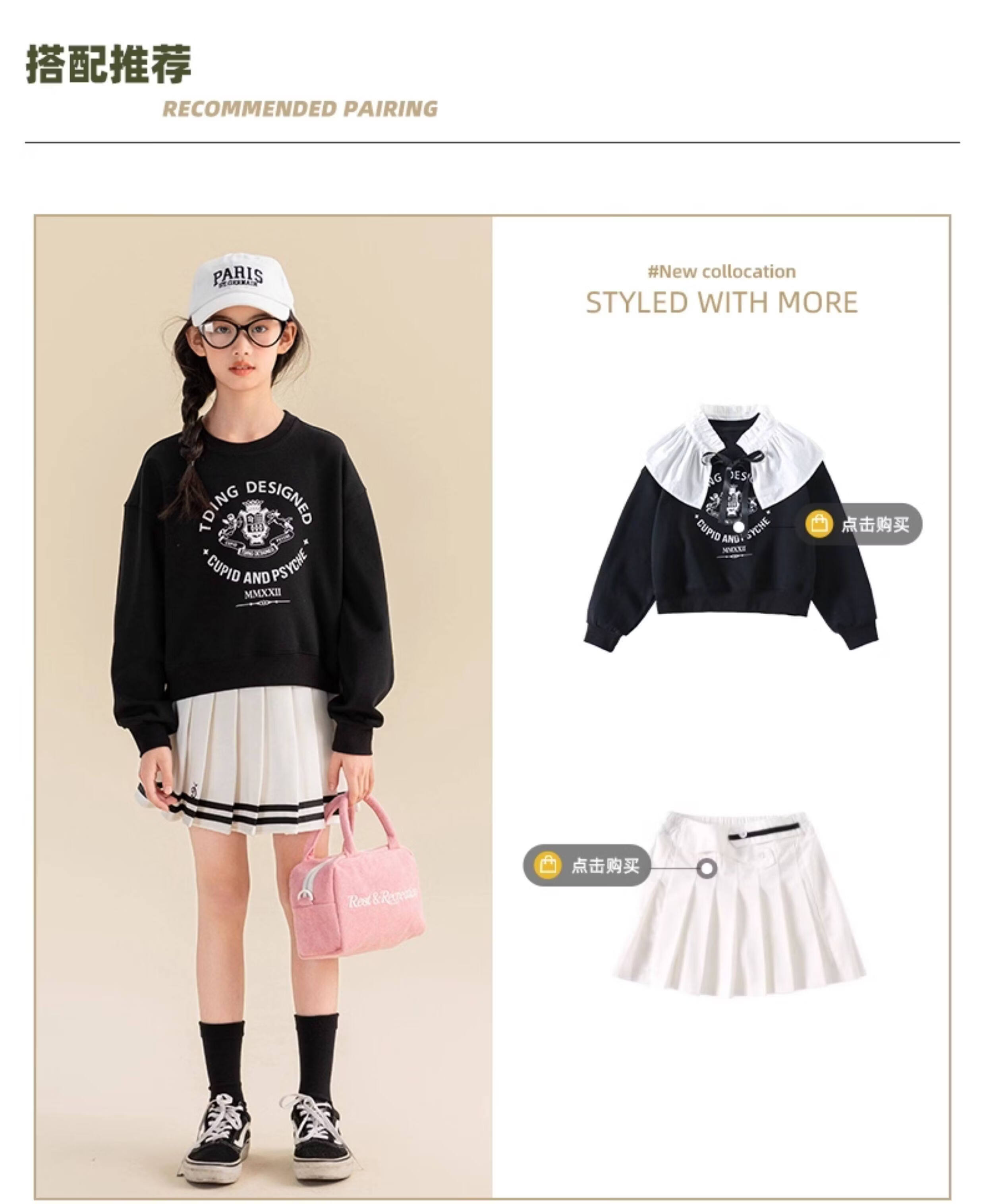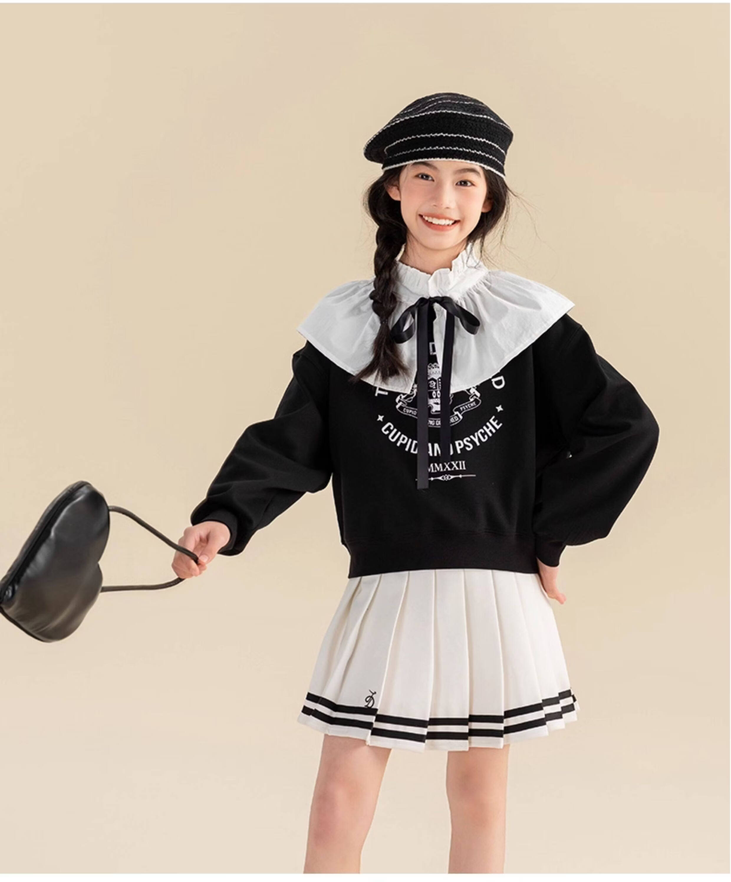 淘町女童赫克林卫衣春秋季新款中大童套头美式印花圆领学院风上衣 黑色 卫衣+送可拆披肩 170