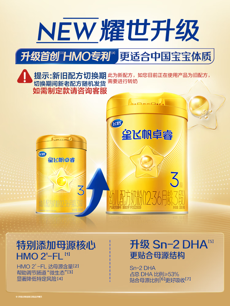 飞鹤星飞帆卓睿 婴幼儿配方奶粉3段(1-3岁)300克 育儿补贴 0元试用