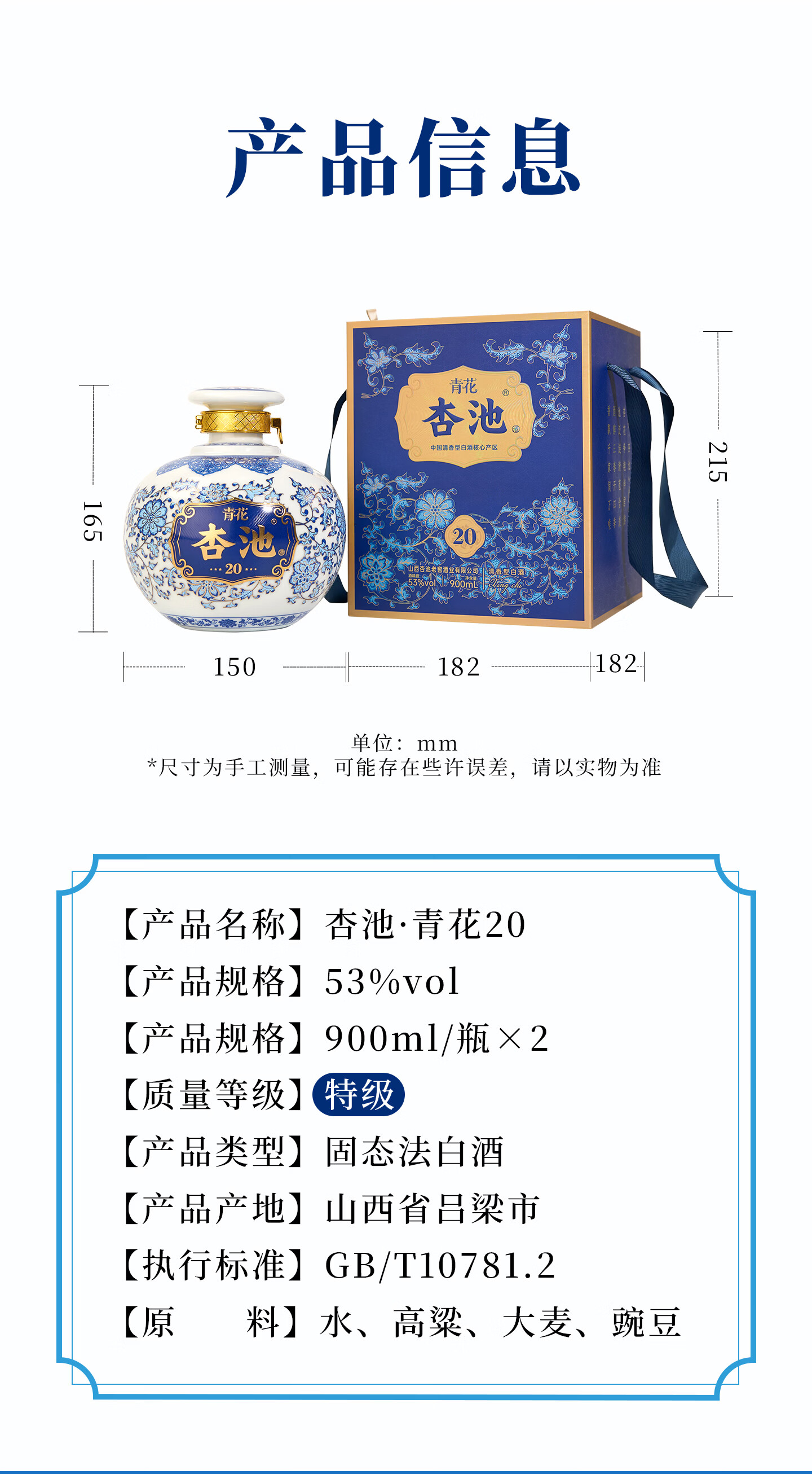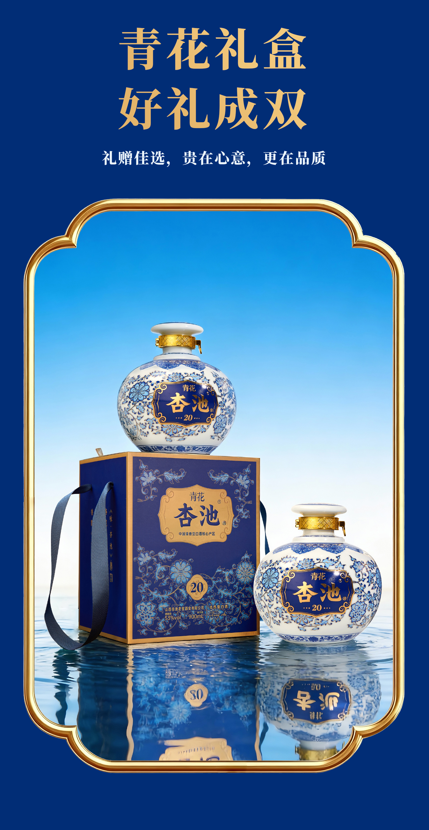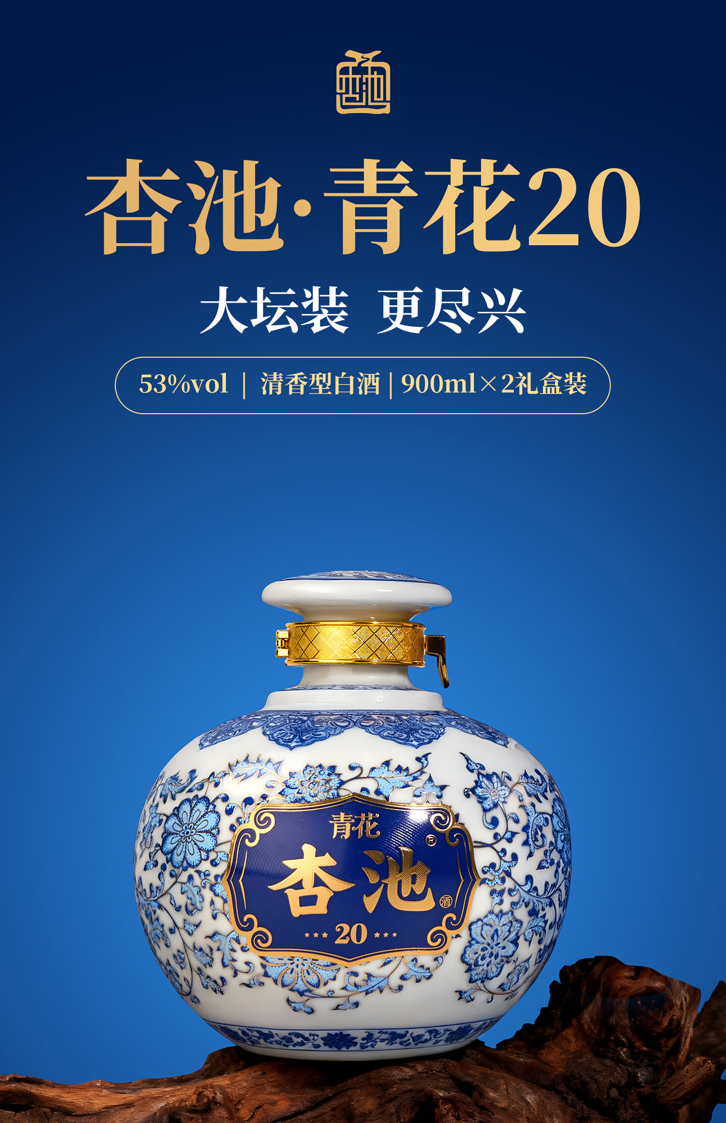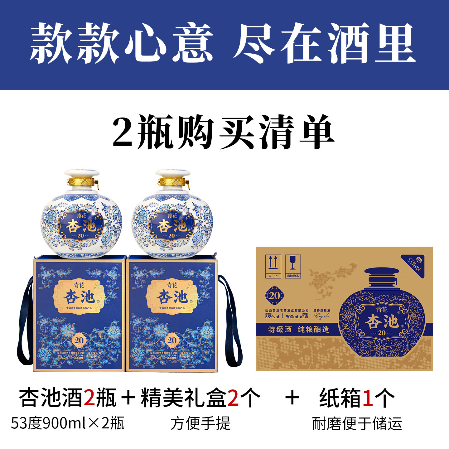 杏池青花20白酒清香型53度900ml固态纯粮酒 商务宴请送礼收藏马年白酒 53度 900mL 2瓶 青花20适合送礼