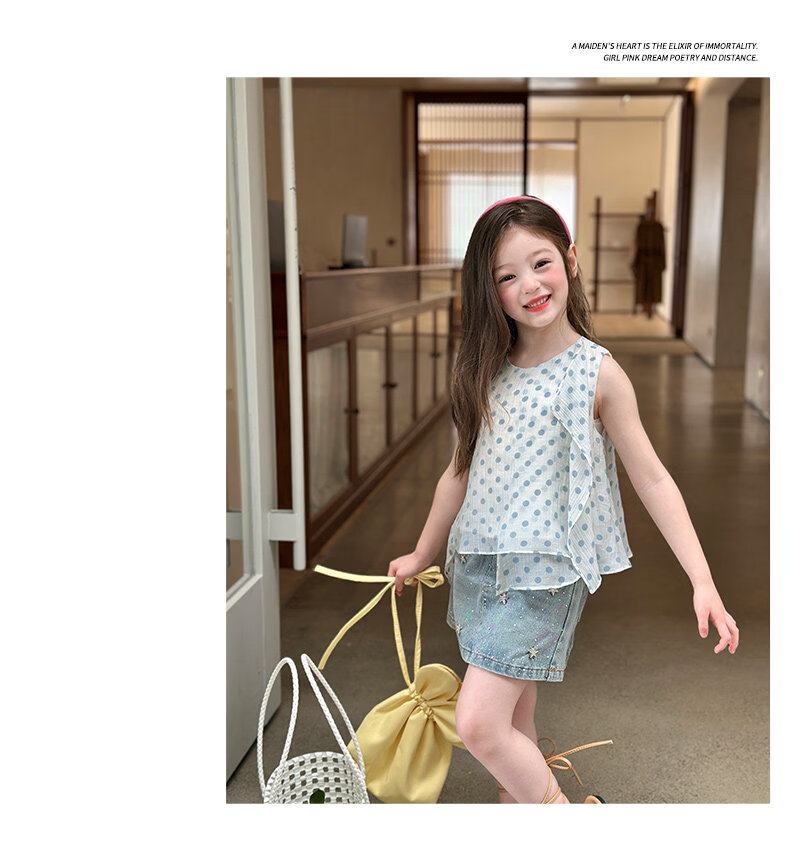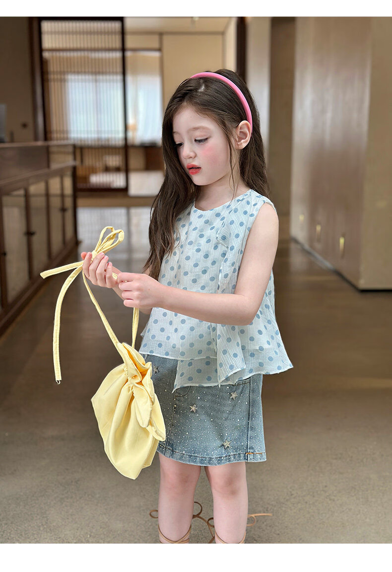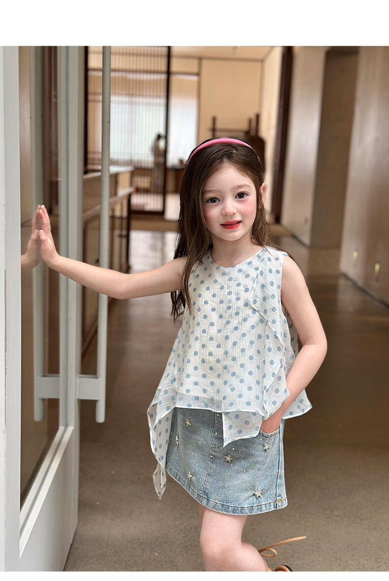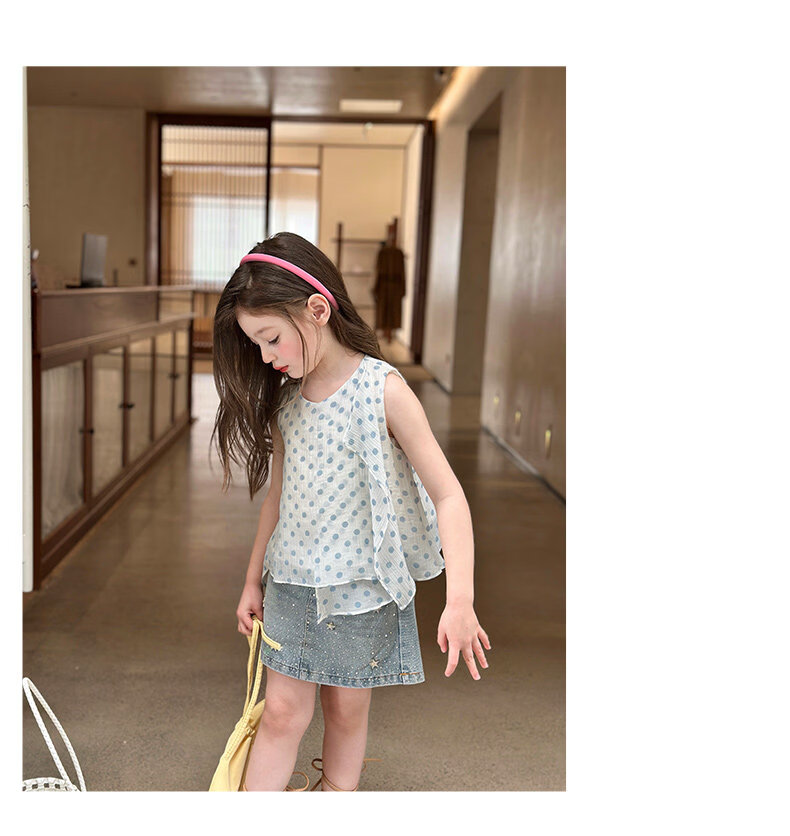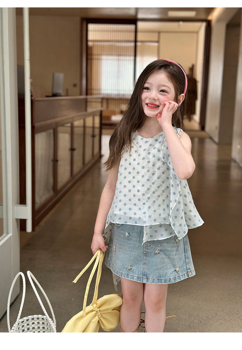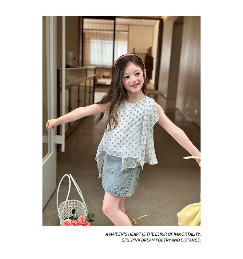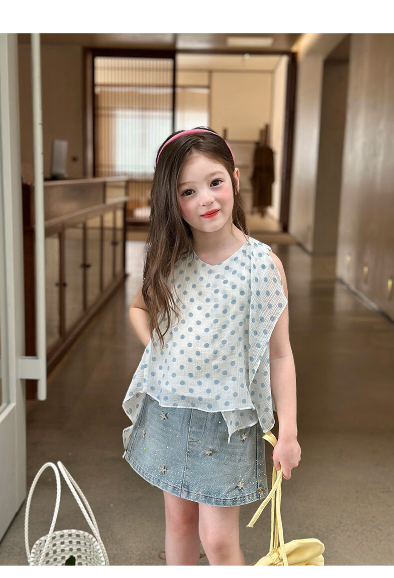 栀了成长记女童装清新撞色波点背心2026春季儿童时髦圆领无袖上衣 蓝色 半身裙 100