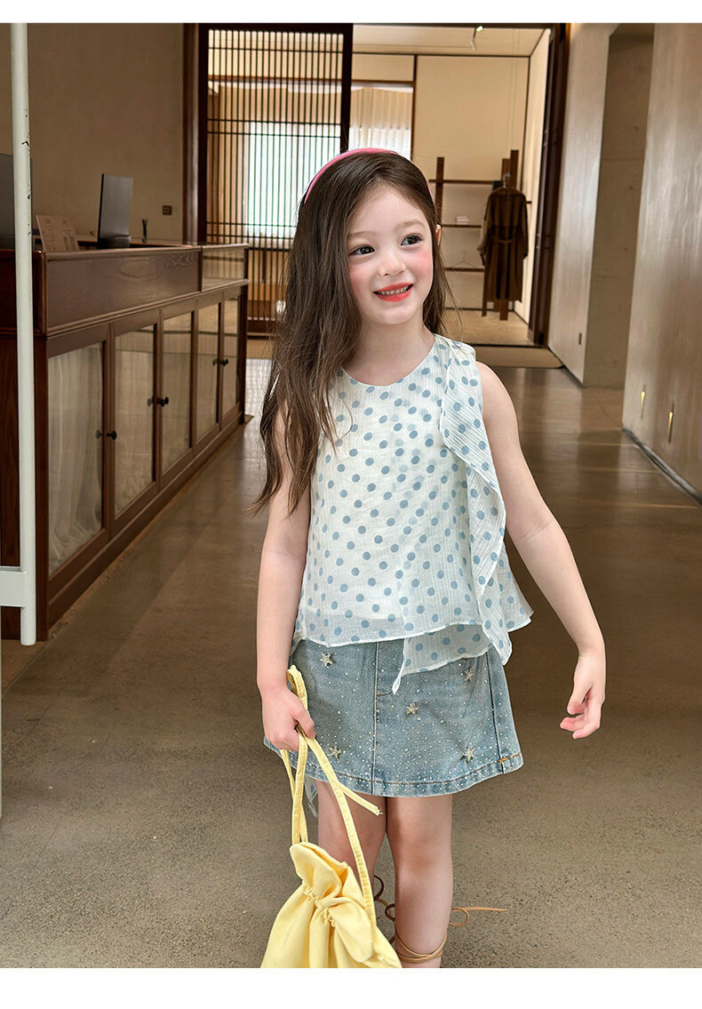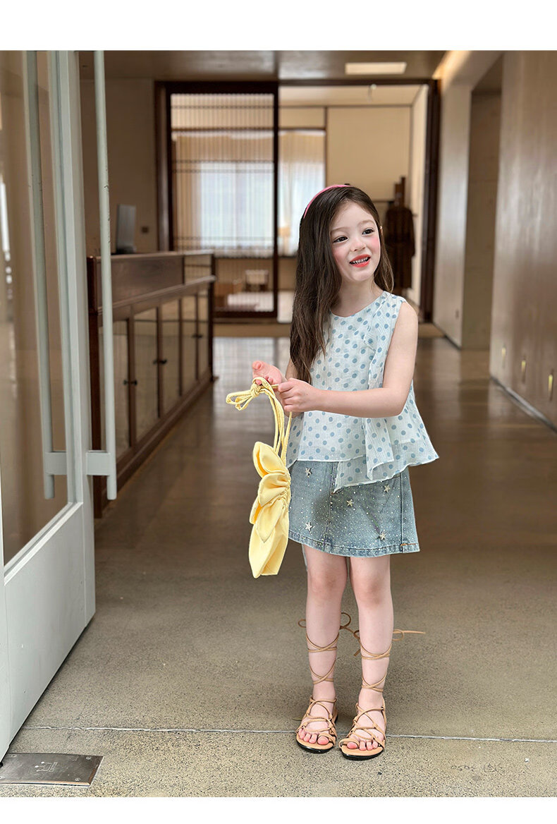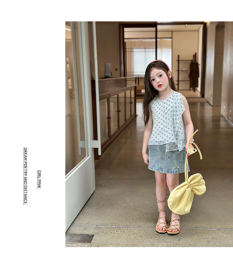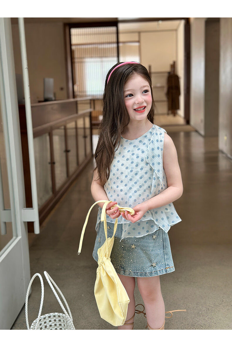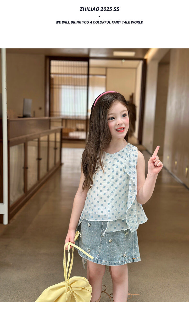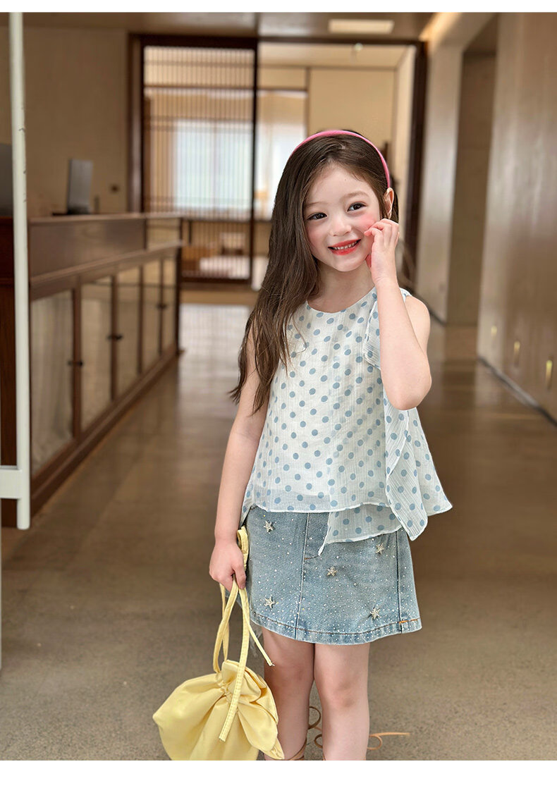 栀了成长记女童装清新撞色波点背心2026春季儿童时髦圆领无袖上衣 蓝色 半身裙 100