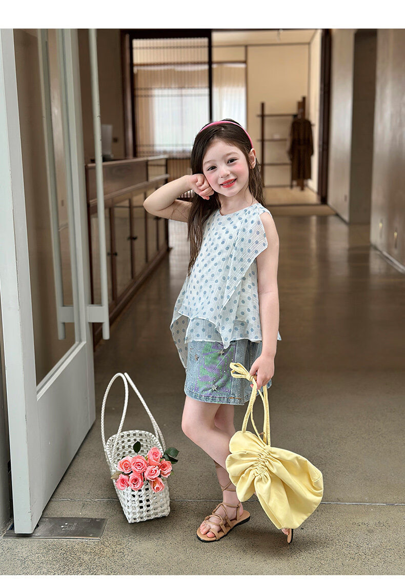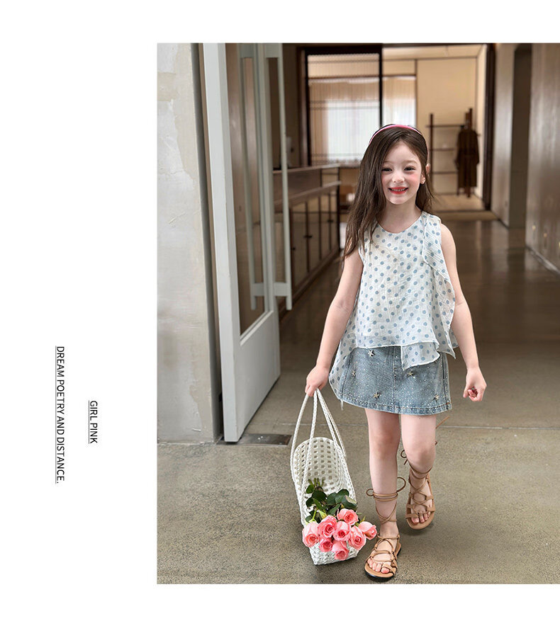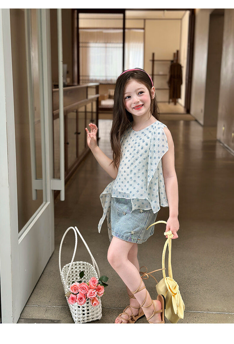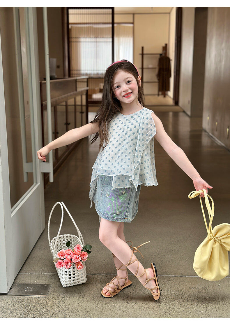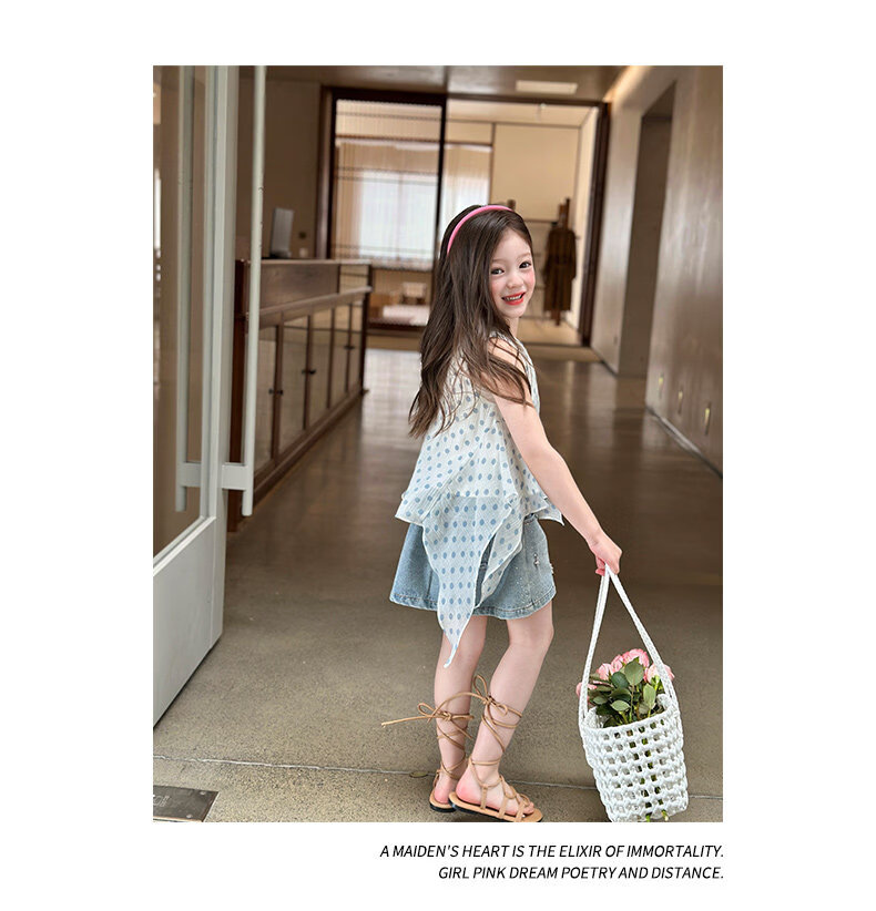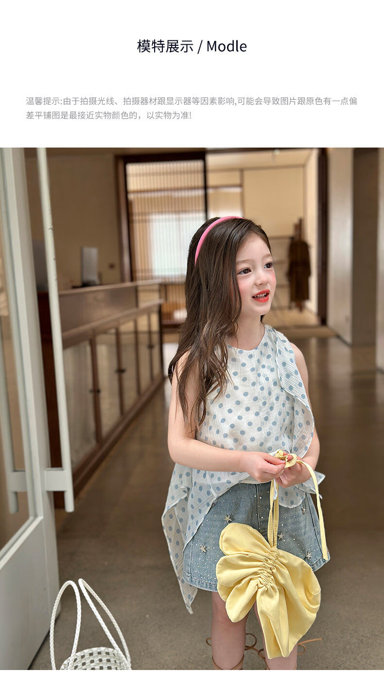 栀了成长记女童装清新撞色波点背心2026春季儿童时髦圆领无袖上衣 蓝色 半身裙 100
