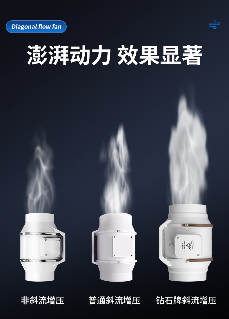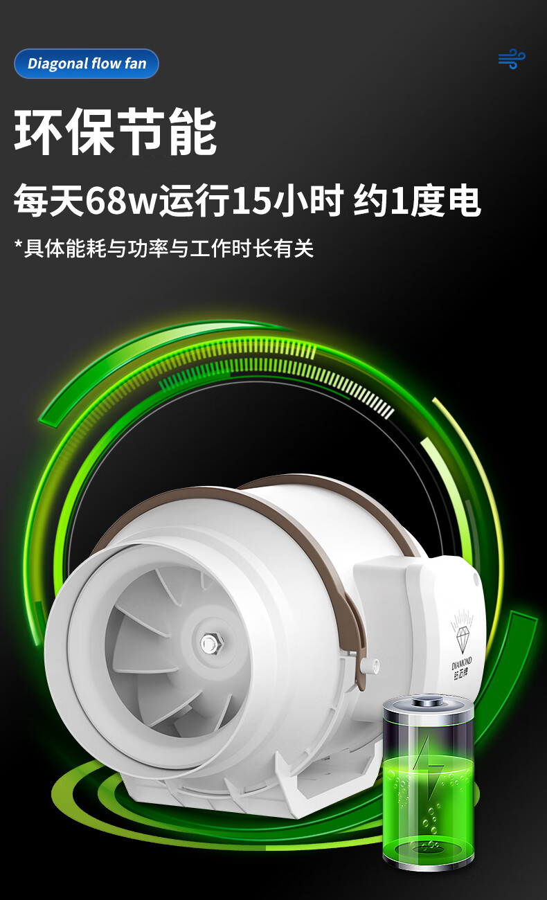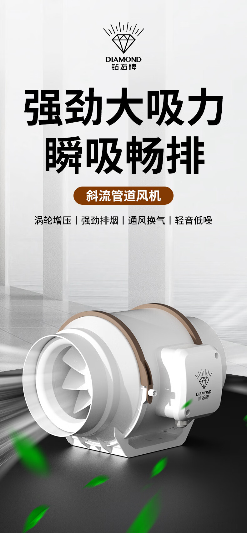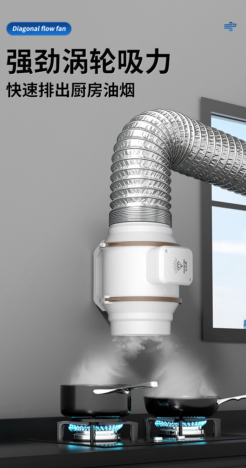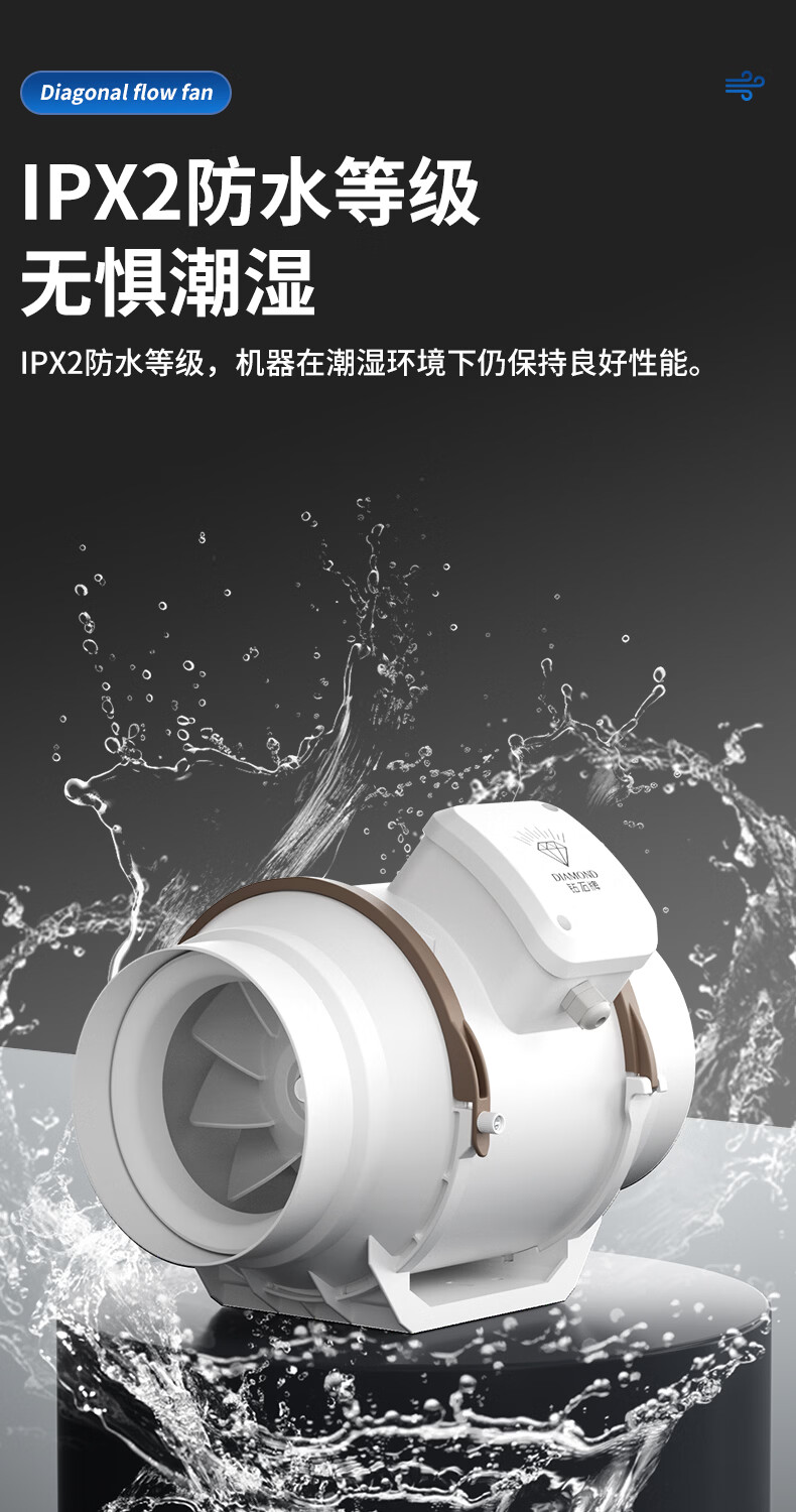 钻石牌管道抽风机排风扇超强大吸力轴流风机排风机斜流涡轮通风厨房专用 4寸棕白色 单速插电款