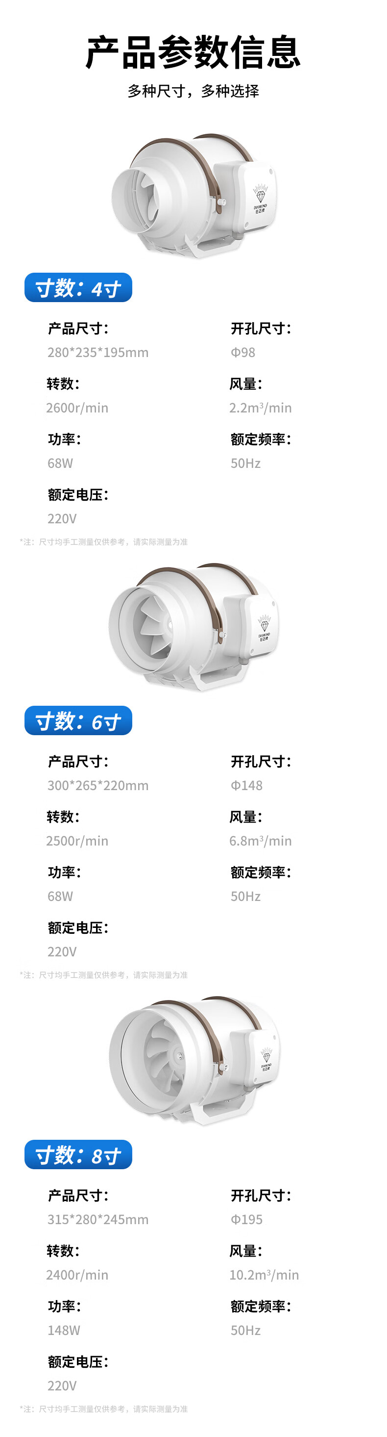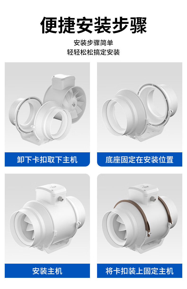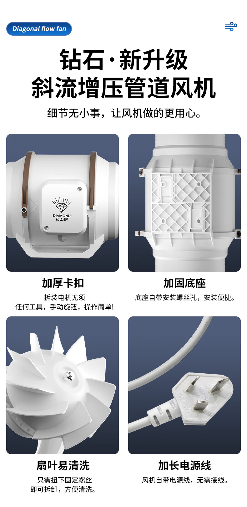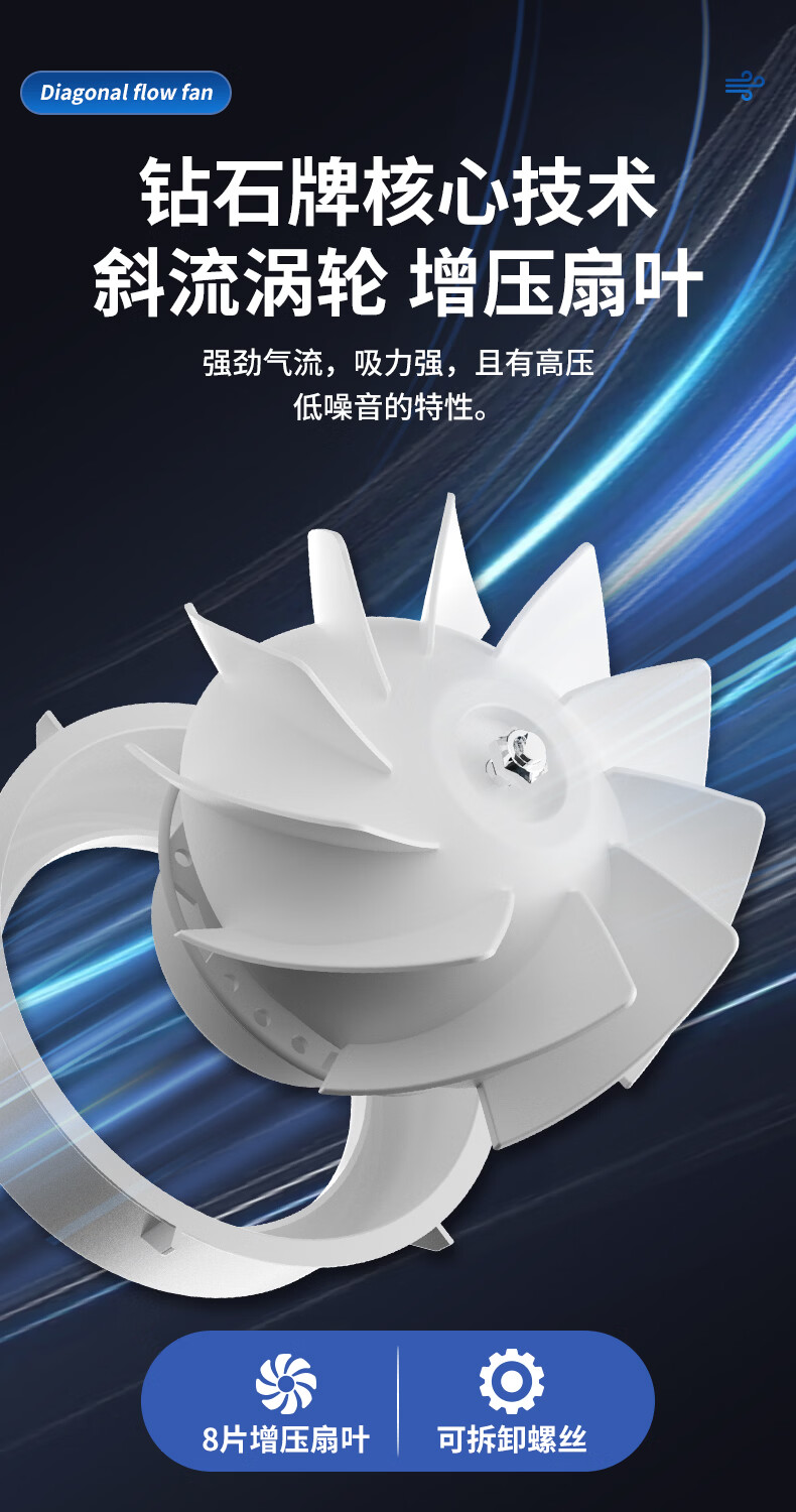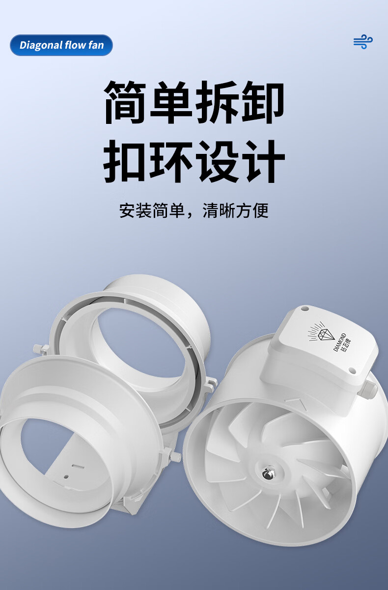 钻石牌管道抽风机排风扇超强大吸力轴流风机排风机斜流涡轮通风厨房专用 4寸棕白色 单速插电款