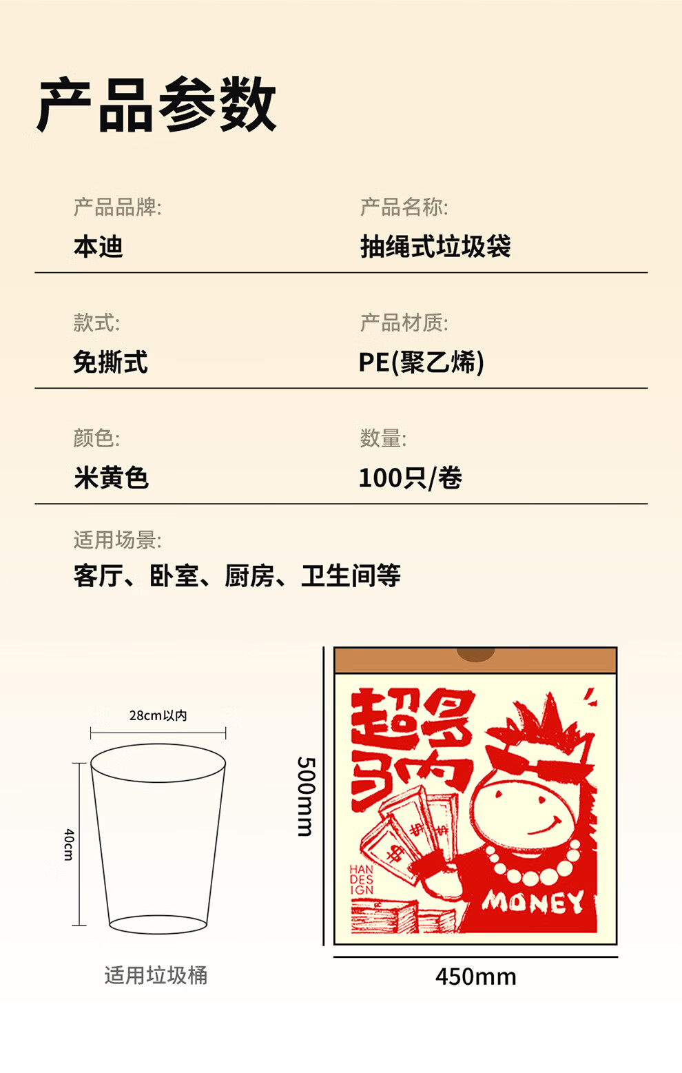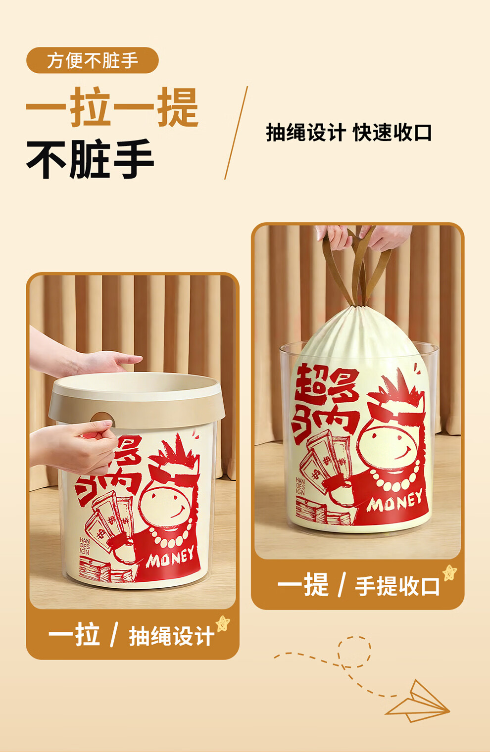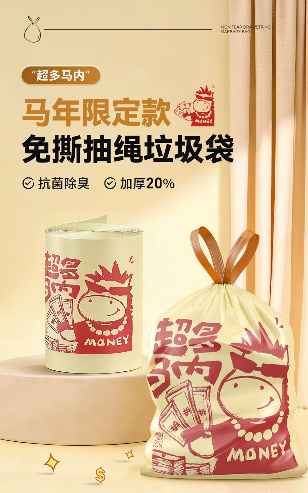 本迪抽绳垃圾袋26马年45*50cm*100只1.2丝加厚免撕家用手提穿绳垃圾袋