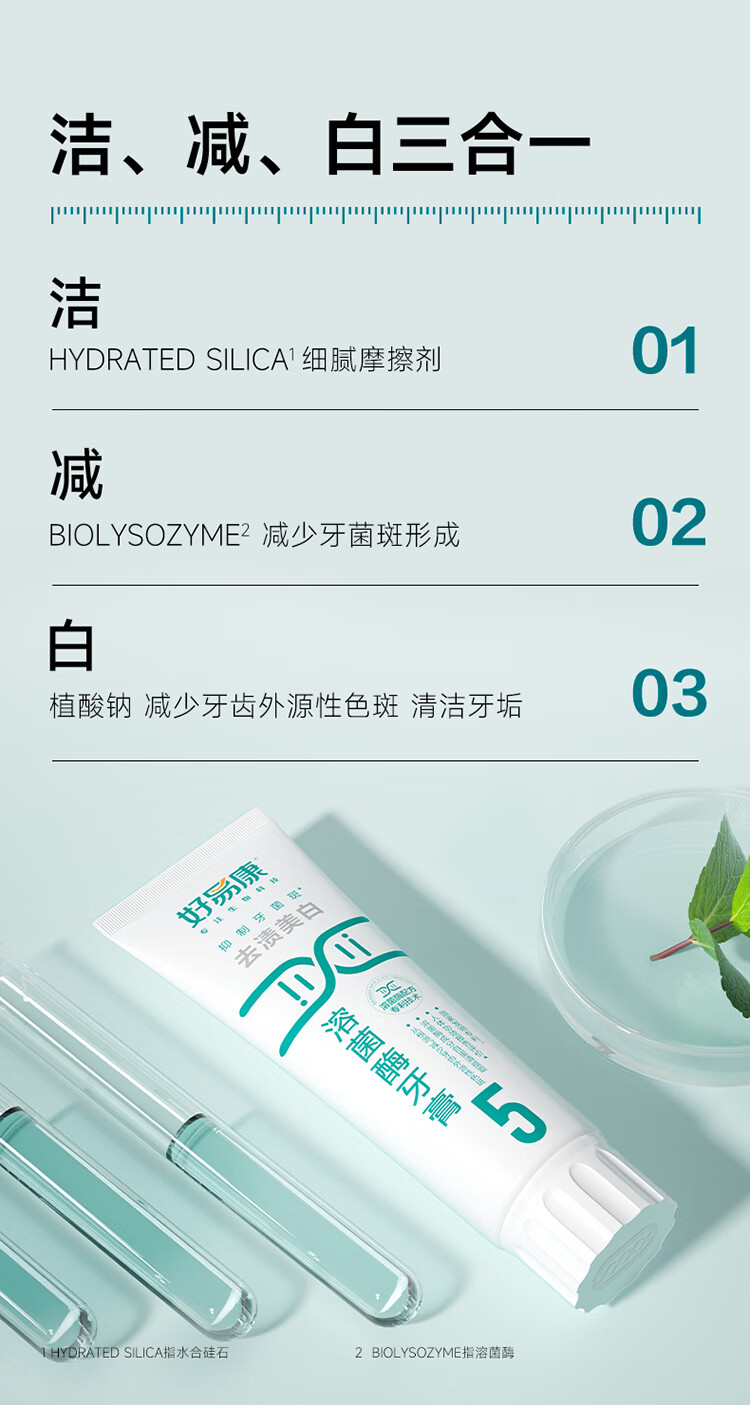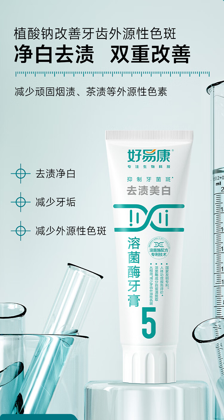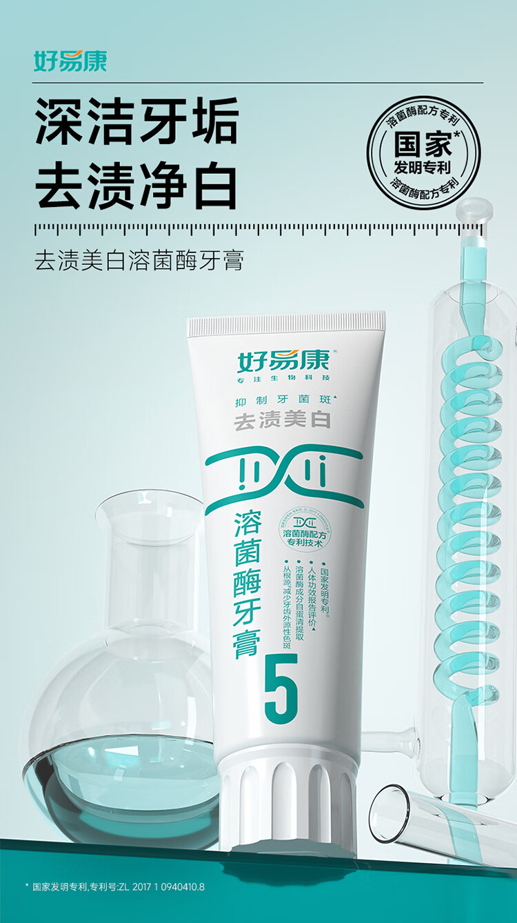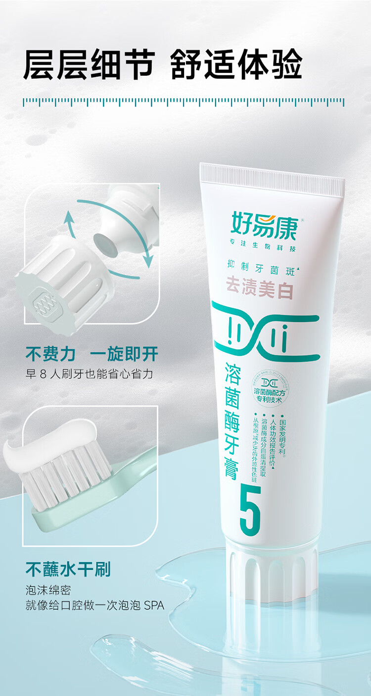 好易康溶菌酶牙膏 去渍净白深洁牙垢减少烟渍茶渍清新口气 5号5支装【100g*5】