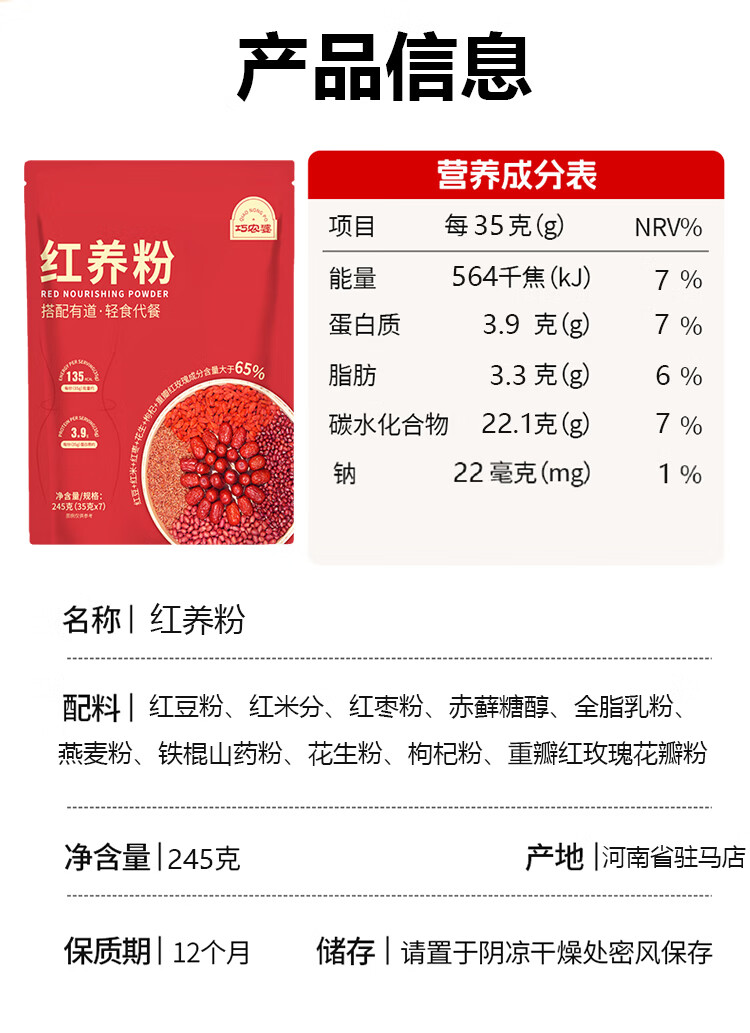 巧农婆五红粉五红汤免煮早餐代餐粉女性养生滋补营养冲泡月子哺乳期气血 【店铺热销】红养粉 245g*3袋