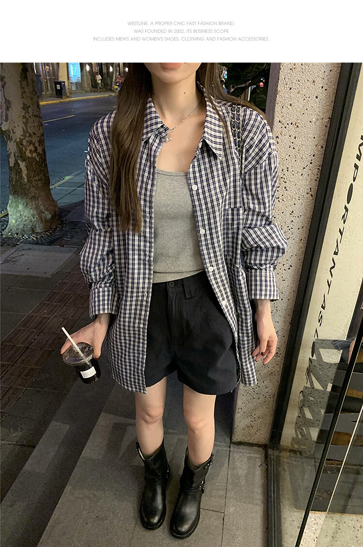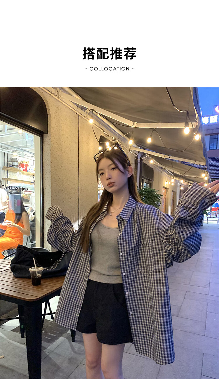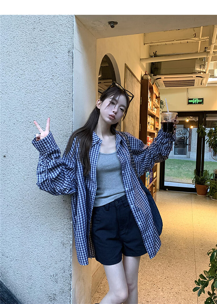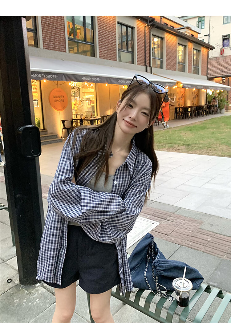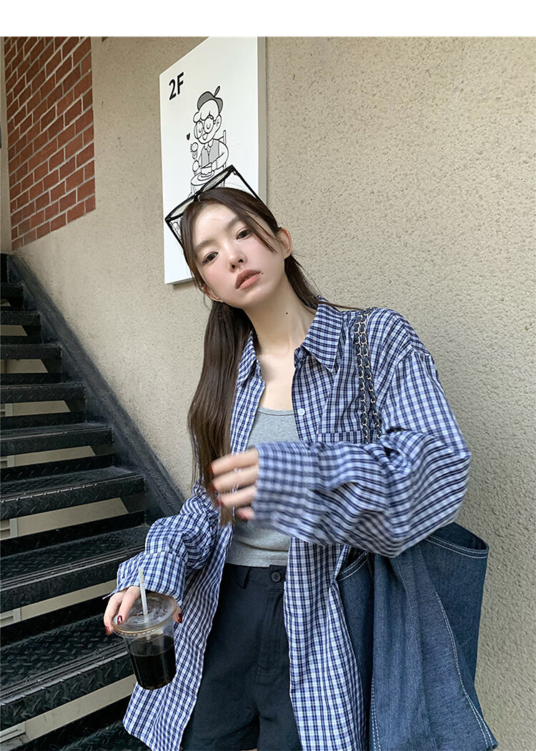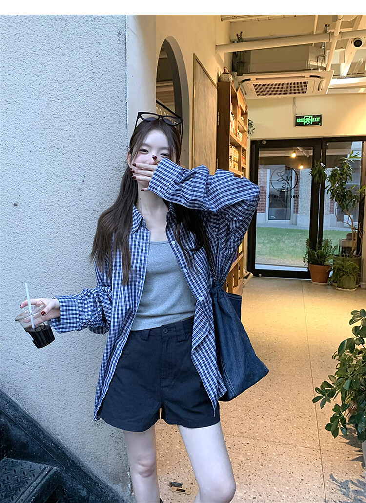 西遇蓝色格子衬衫女2025年秋季新款松弛感宽松薄款衬衣长袖外套 蓝色 M (160)