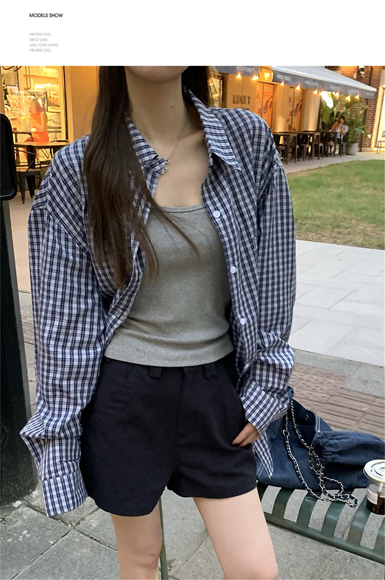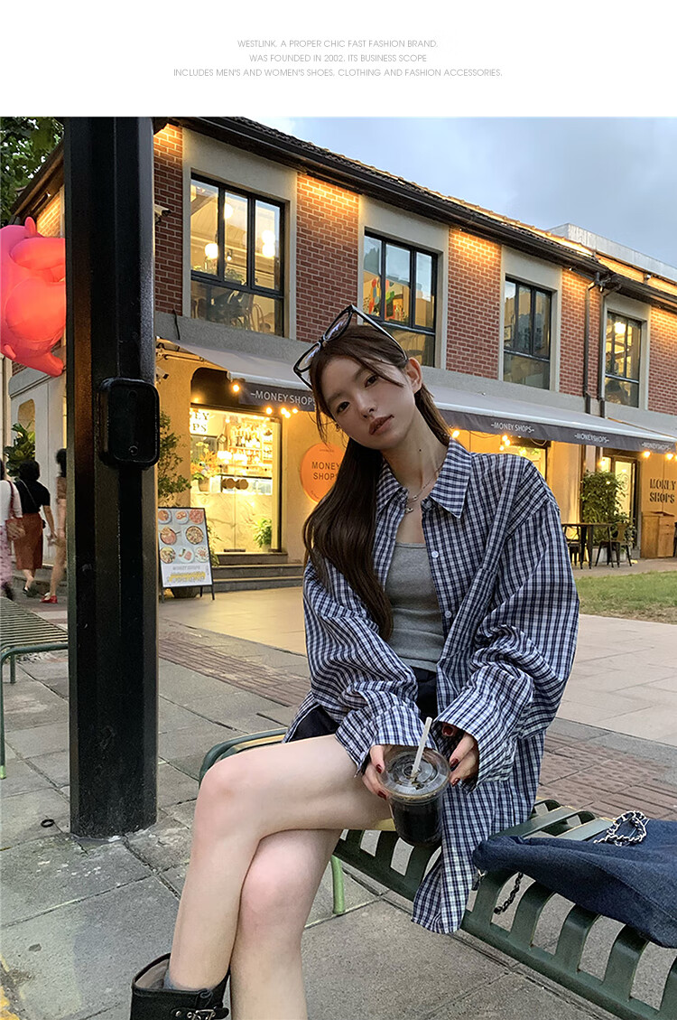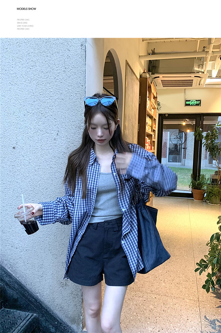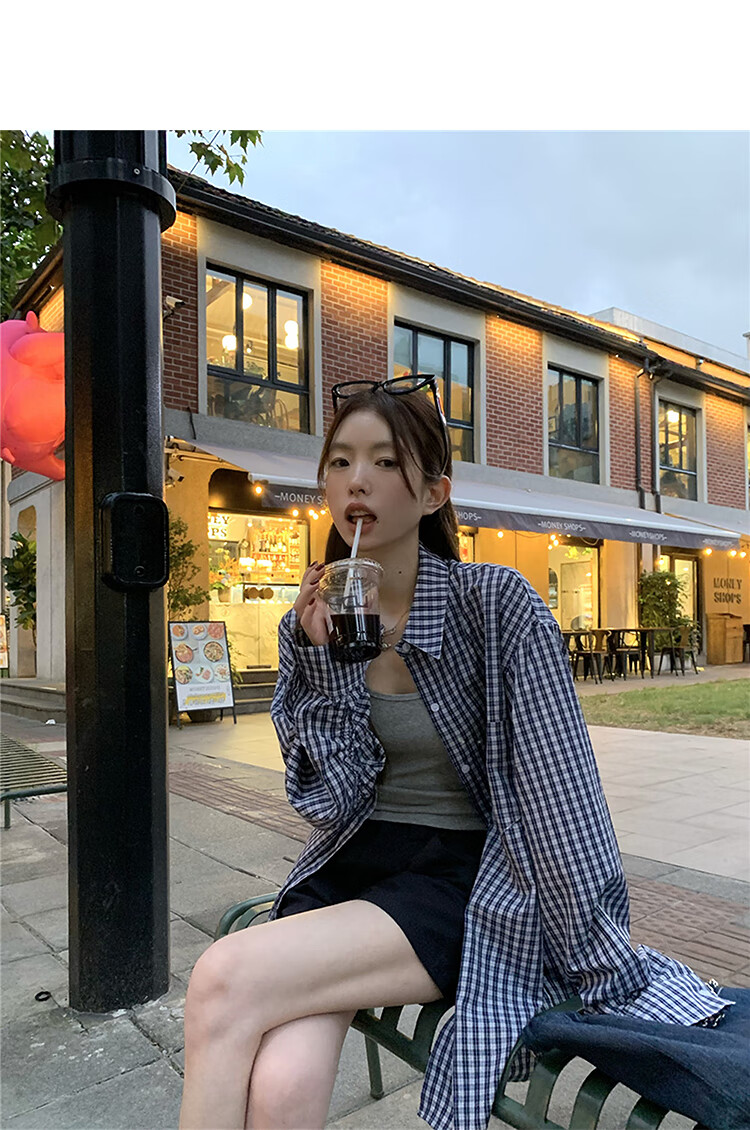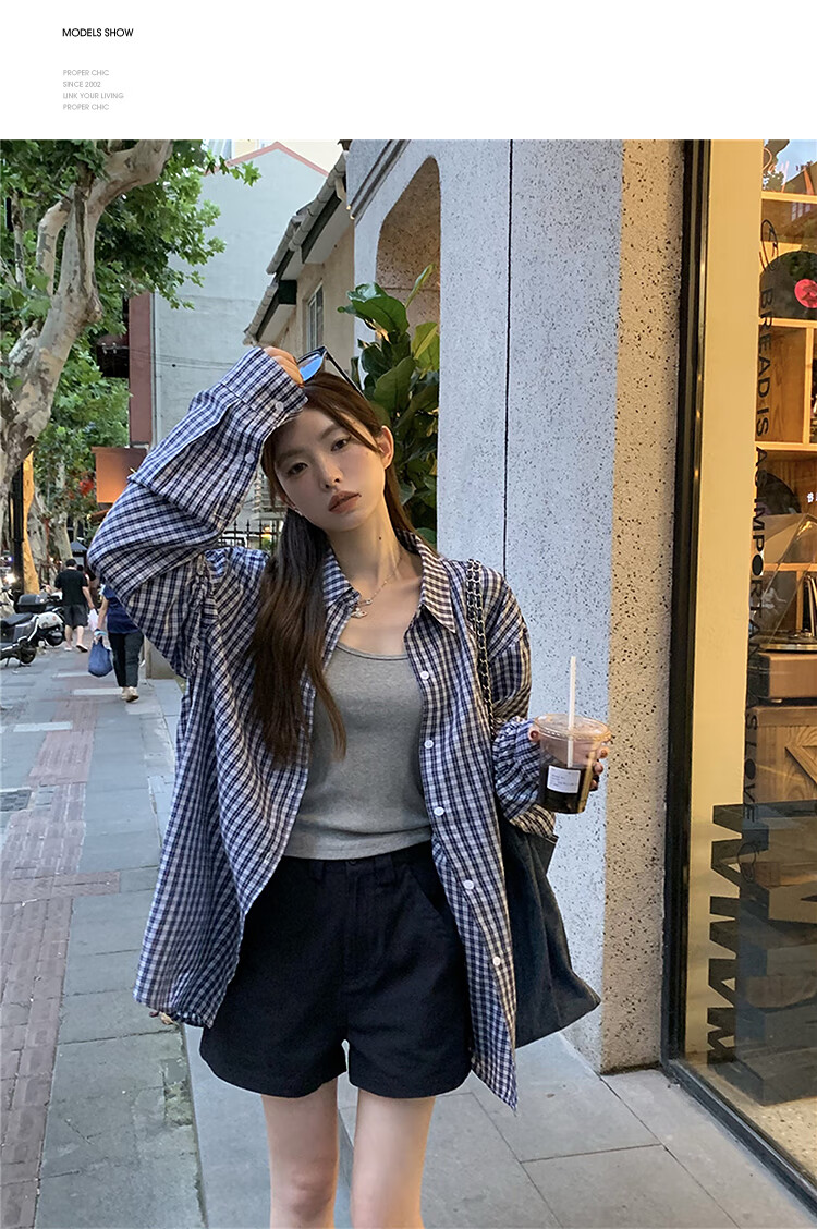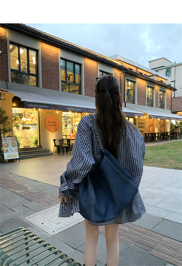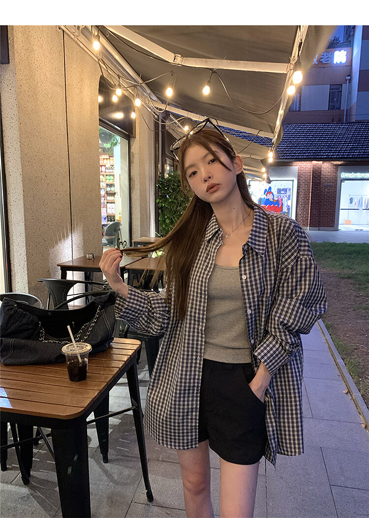 西遇蓝色格子衬衫女2025年秋季新款松弛感宽松薄款衬衣长袖外套 蓝色 M (160)