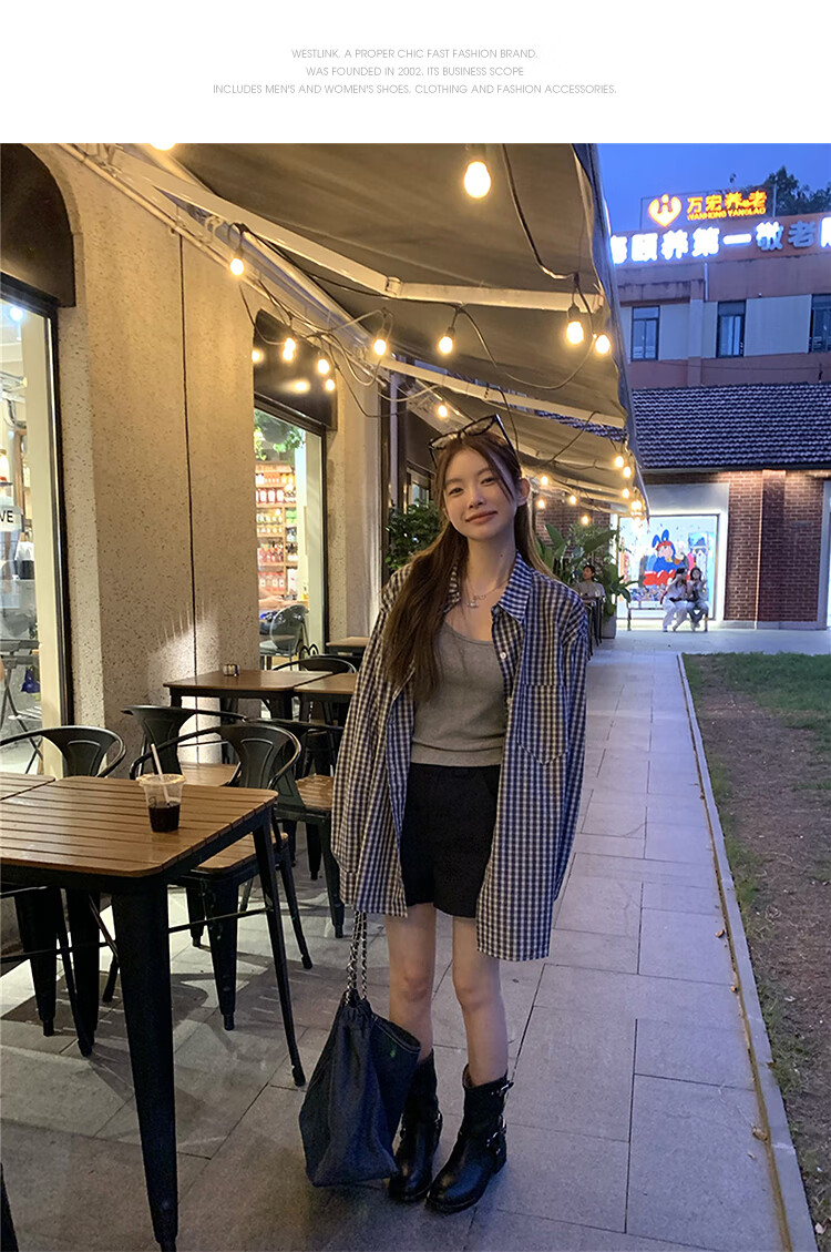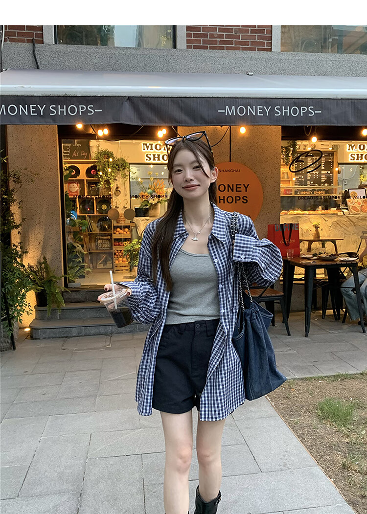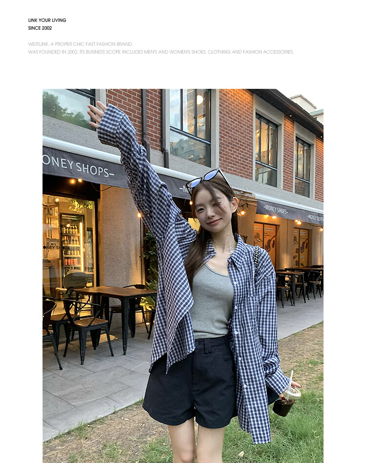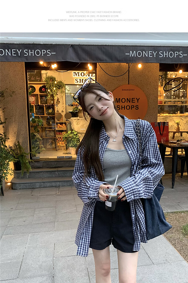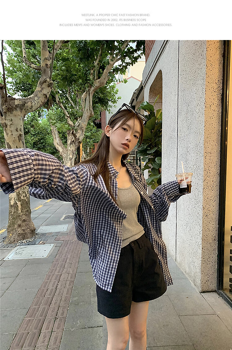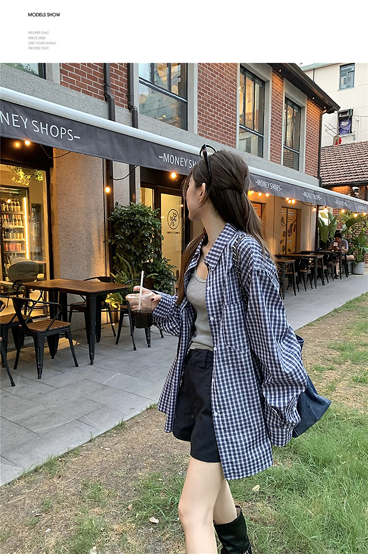 西遇蓝色格子衬衫女2025年秋季新款松弛感宽松薄款衬衣长袖外套 蓝色 M (160)
