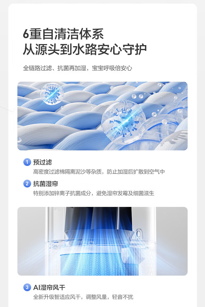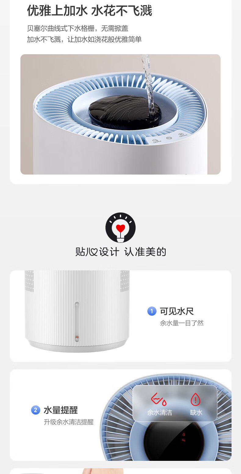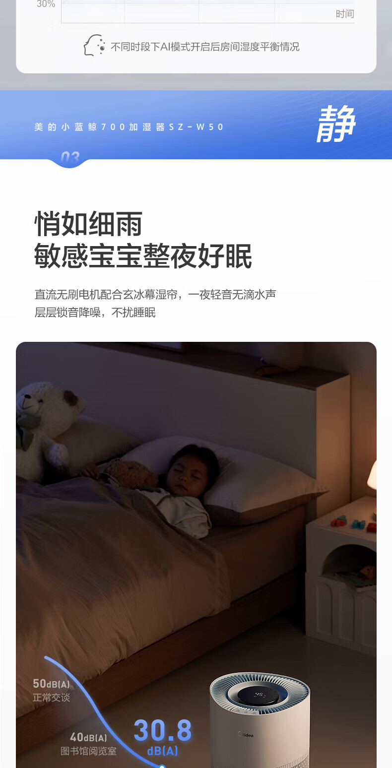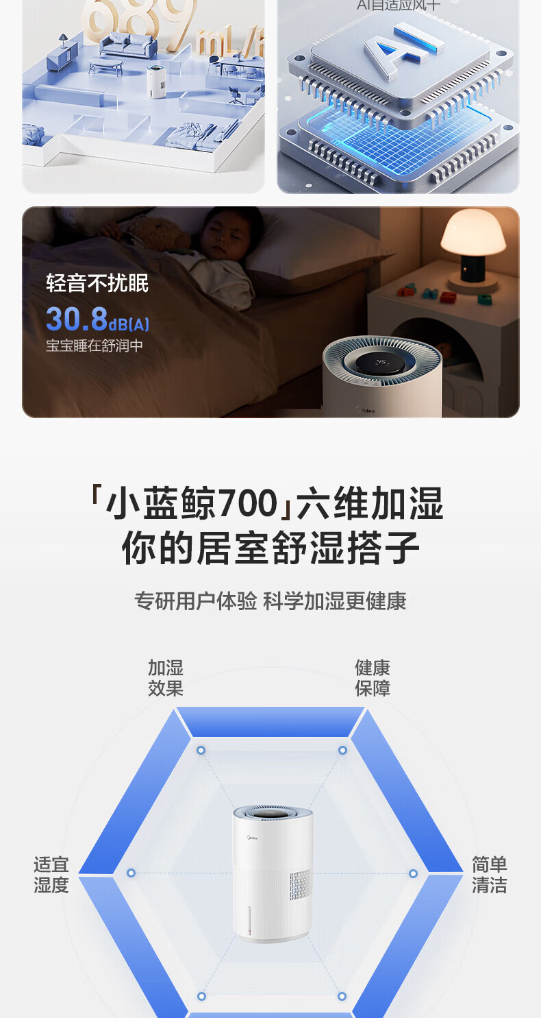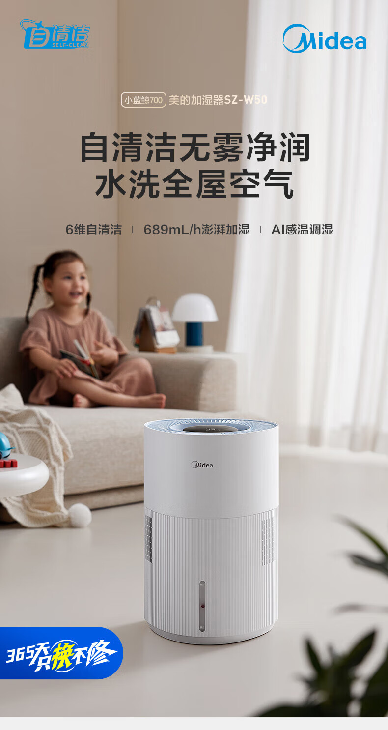 美的(Midea)小蓝鲸700无雾空气加湿器净化器蒸发式鼻炎孕妇婴幼儿家用卧室除菌雾化空调取暖补水礼物 SZ-W50 【小蓝鲸700】