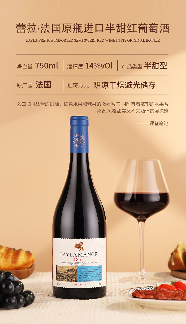 LAYLA【法国蕾拉】原瓶进口14度红酒 半甜红葡萄酒 750mlX6支礼盒装