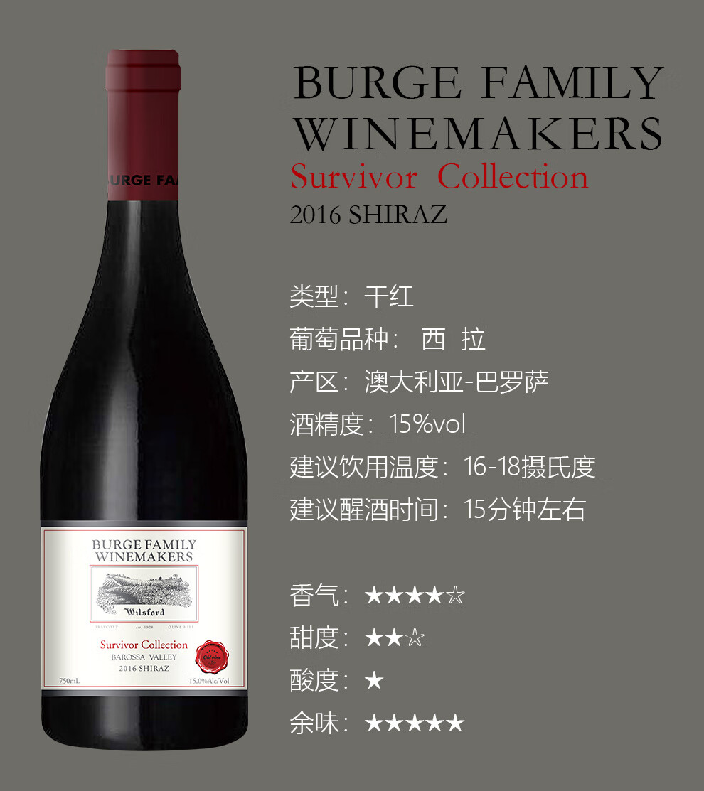 Burge Family Winemakers 堡歌家族酒庄 幸存者系列 澳大利亚巴罗萨产区干红葡萄酒 2015 西拉赤霞珠