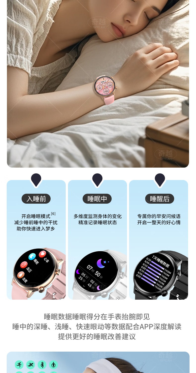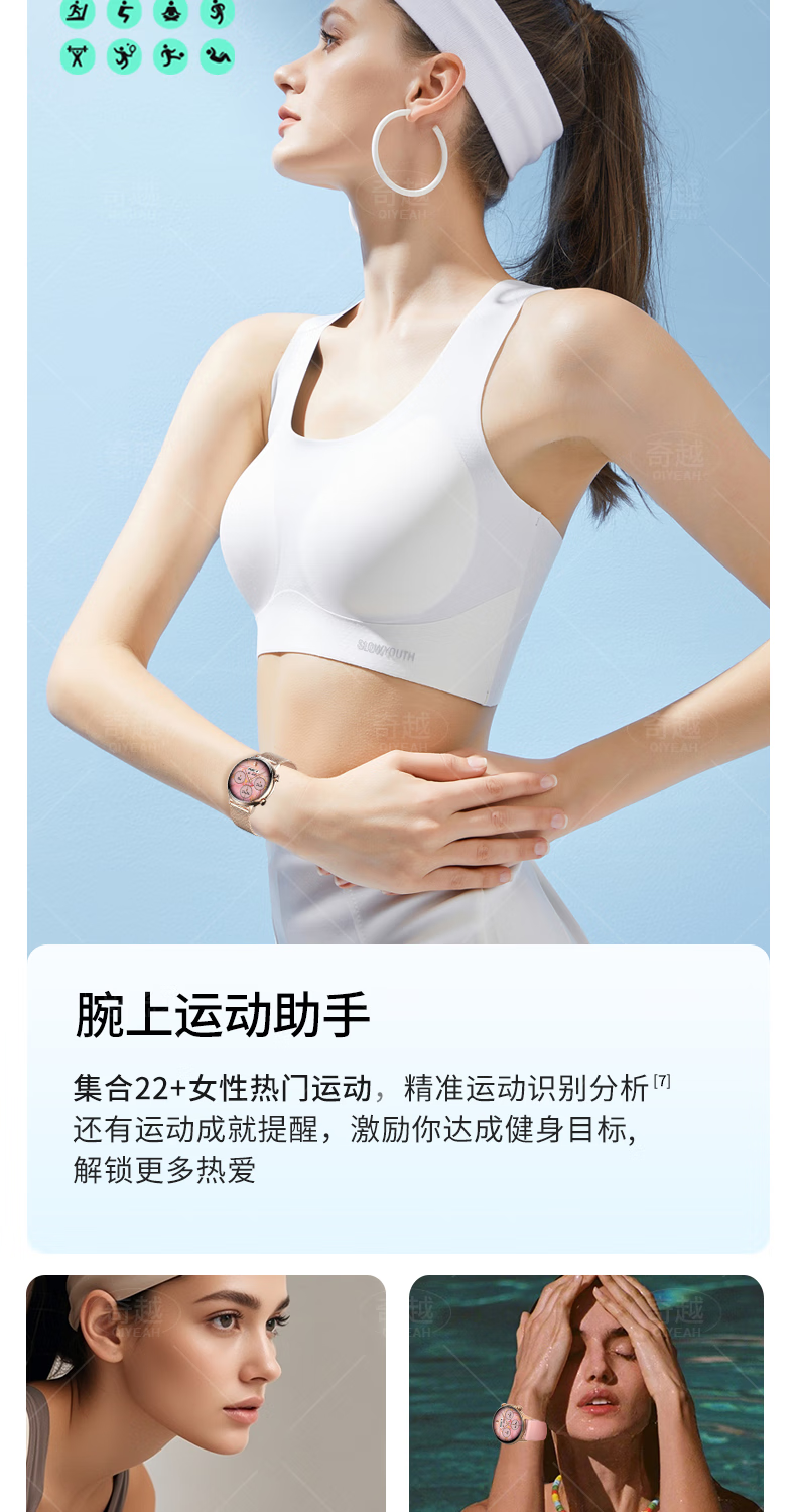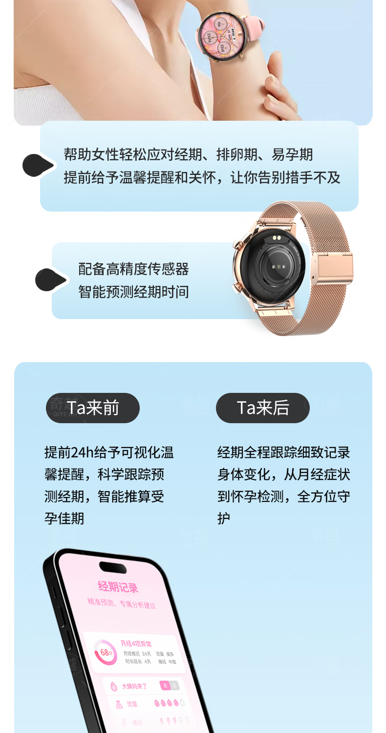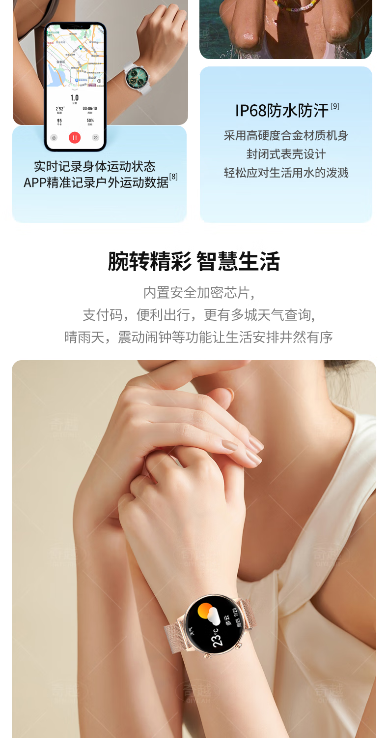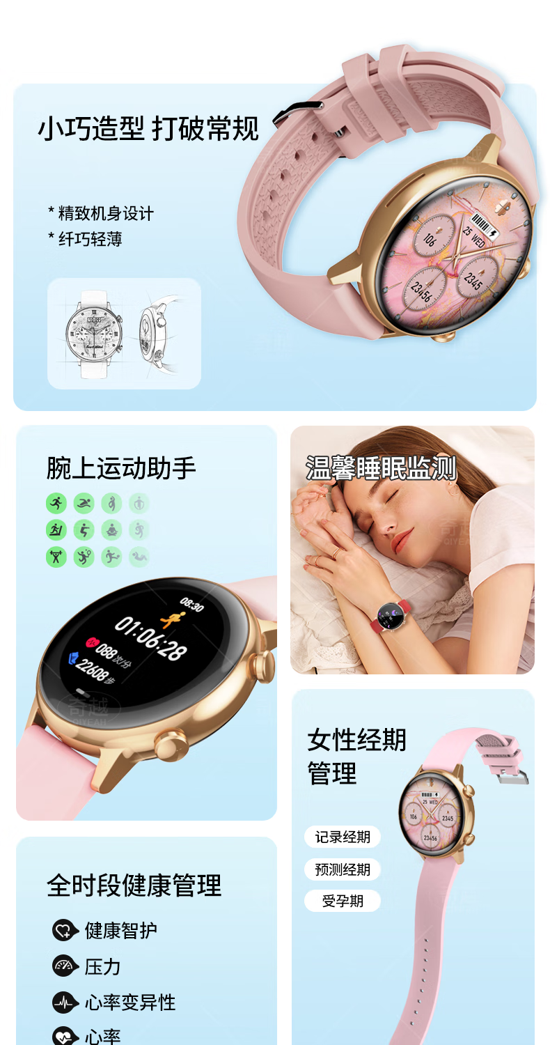 QIYEAHY19奇越运动手表智能女款蓝牙接打电话心率血氧睡眠生理期健康监测消息提醒离线支付防水跑步手环 金色
