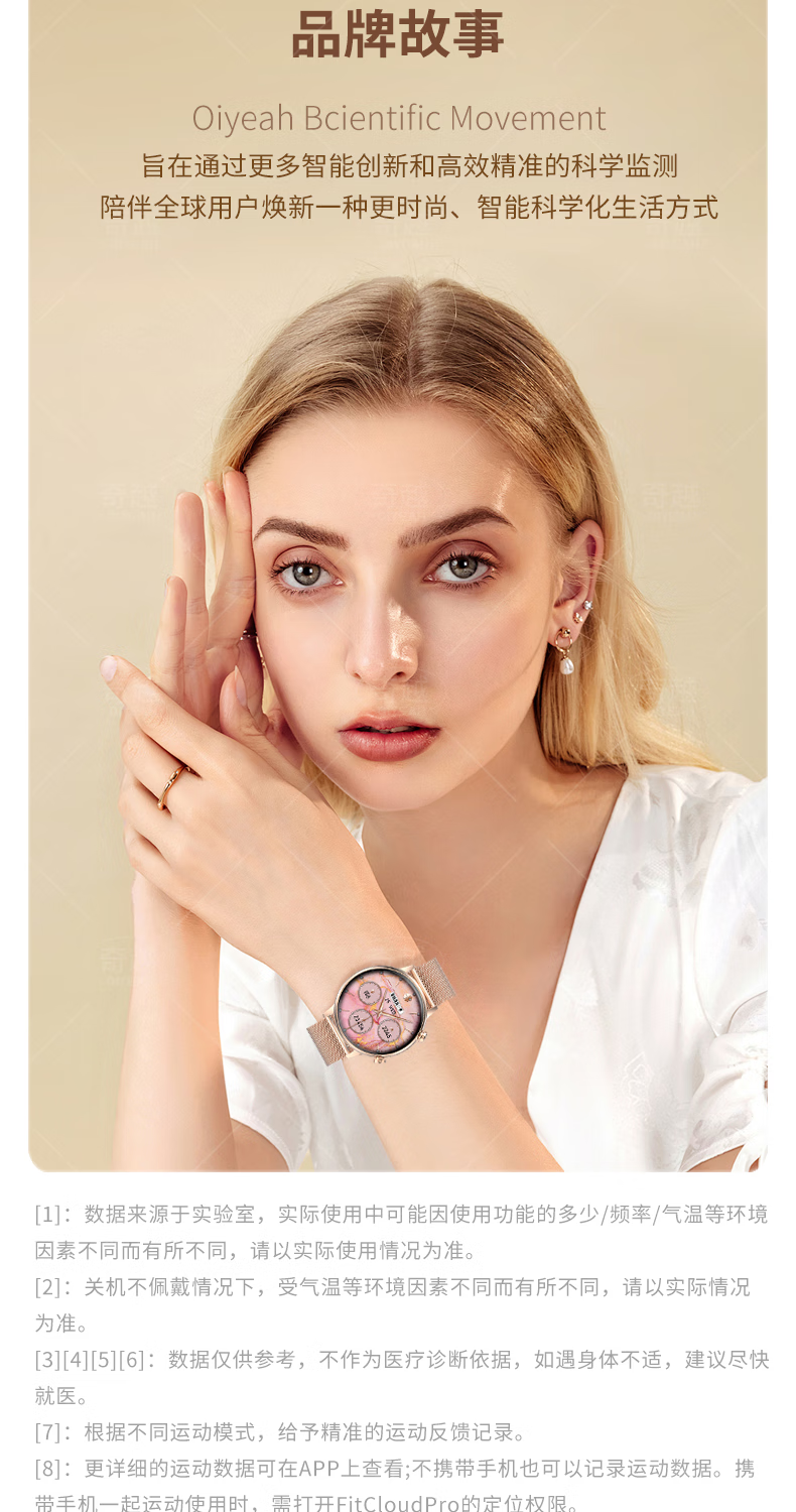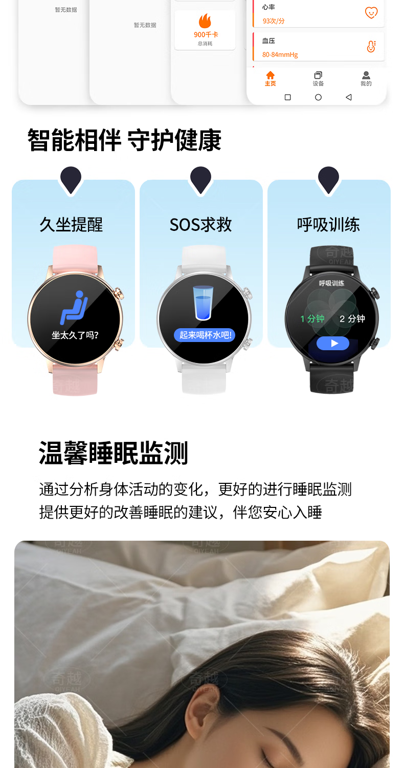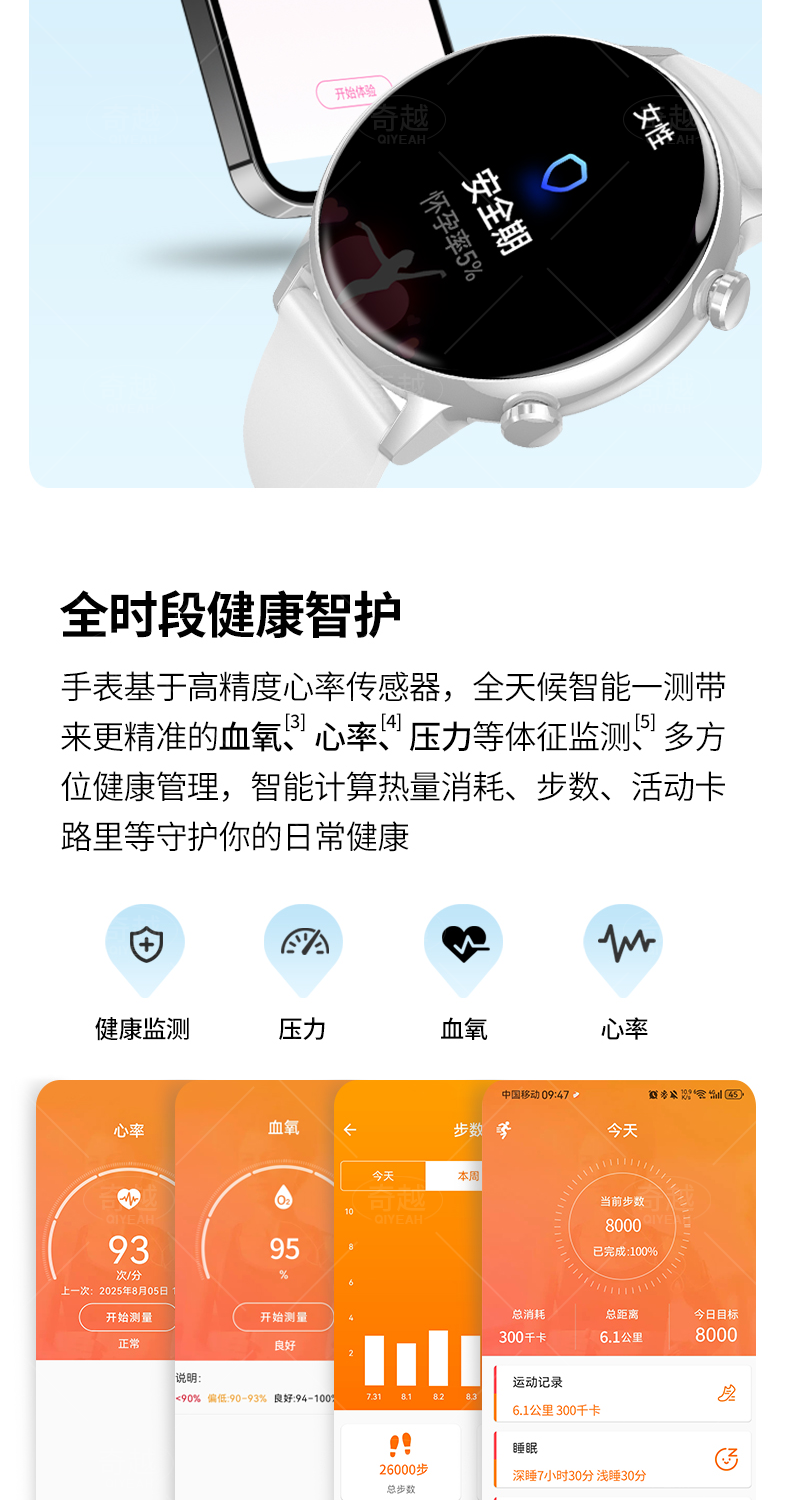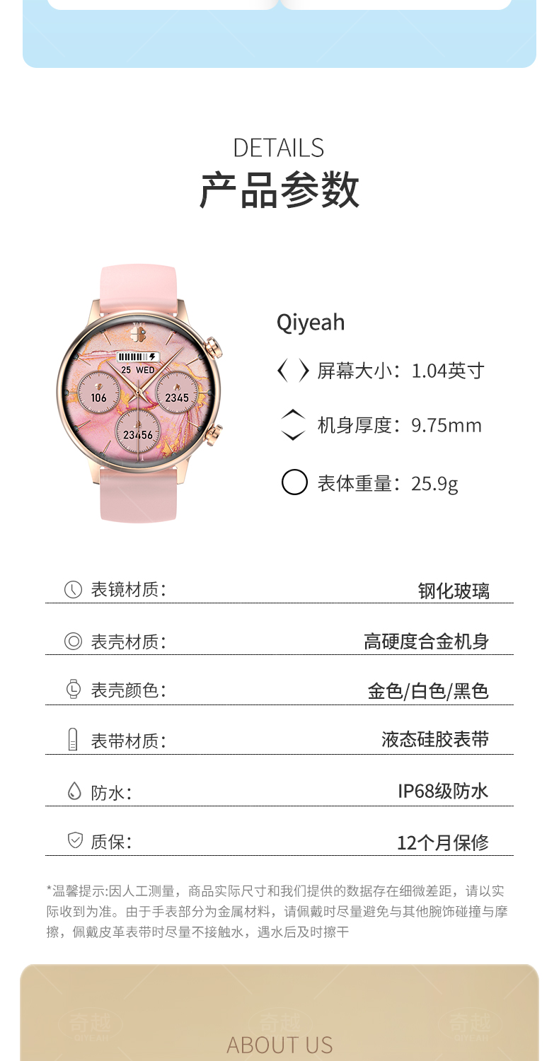 QIYEAHY19奇越运动手表智能女款蓝牙接打电话心率血氧睡眠生理期健康监测消息提醒离线支付防水跑步手环 金色