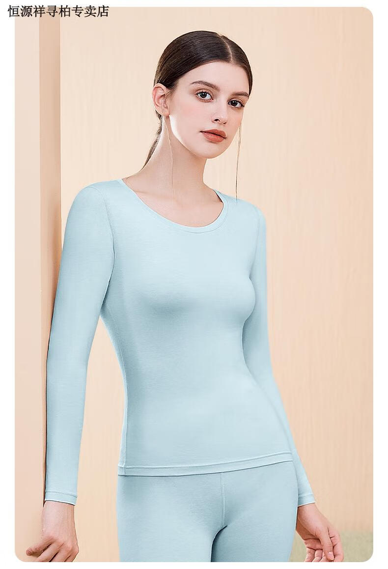 恒源祥品牌纯棉秋衣秋裤女士套装保暖内衣加绒加厚打底棉毛衫秋冬 圆领-浅兰 S 160