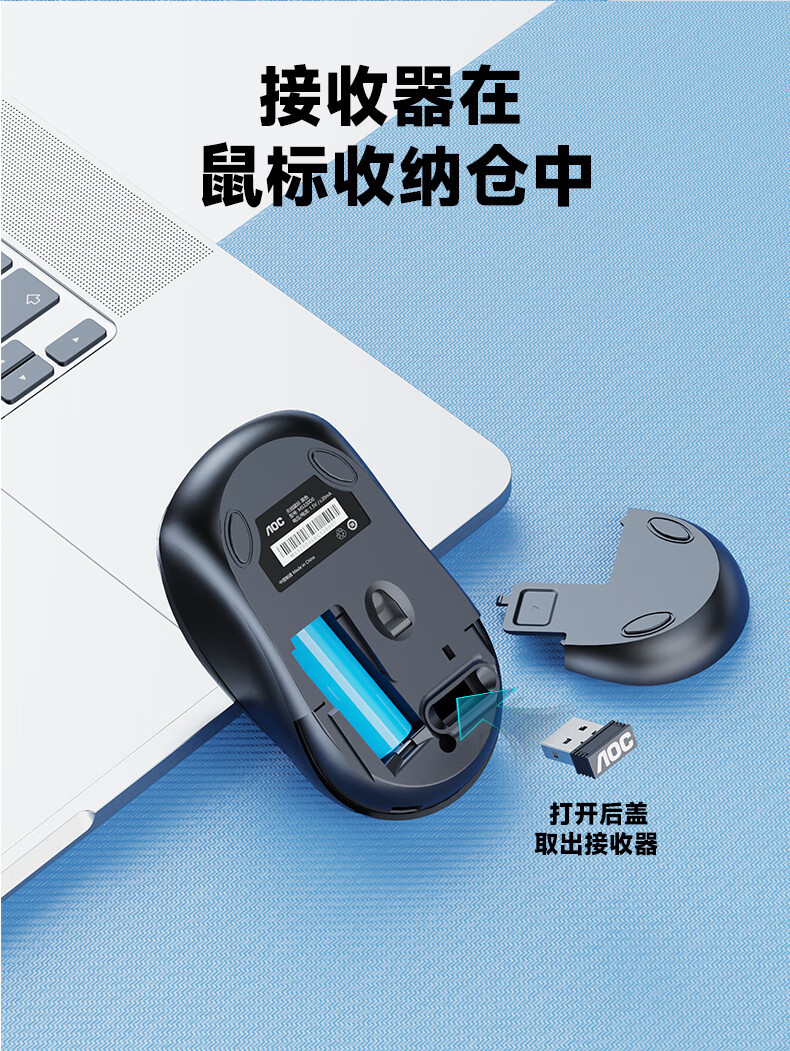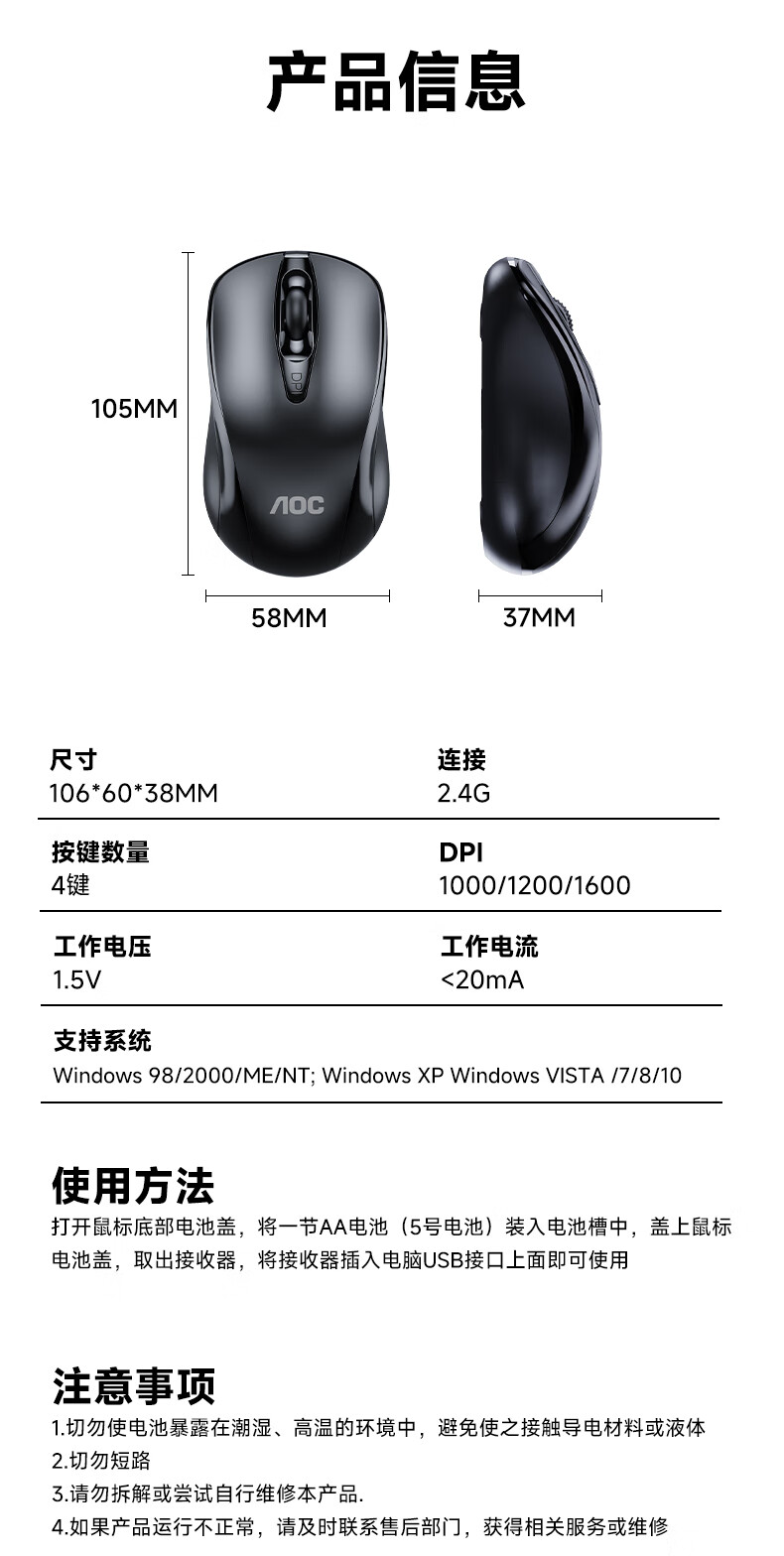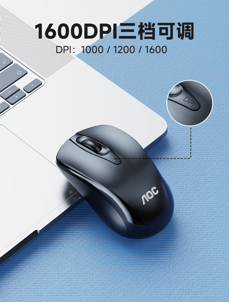 AOC MS320无线鼠标 办公鼠标 三档DPI可调 人体工程学 便携鼠标 笔记本电脑鼠标 黑色