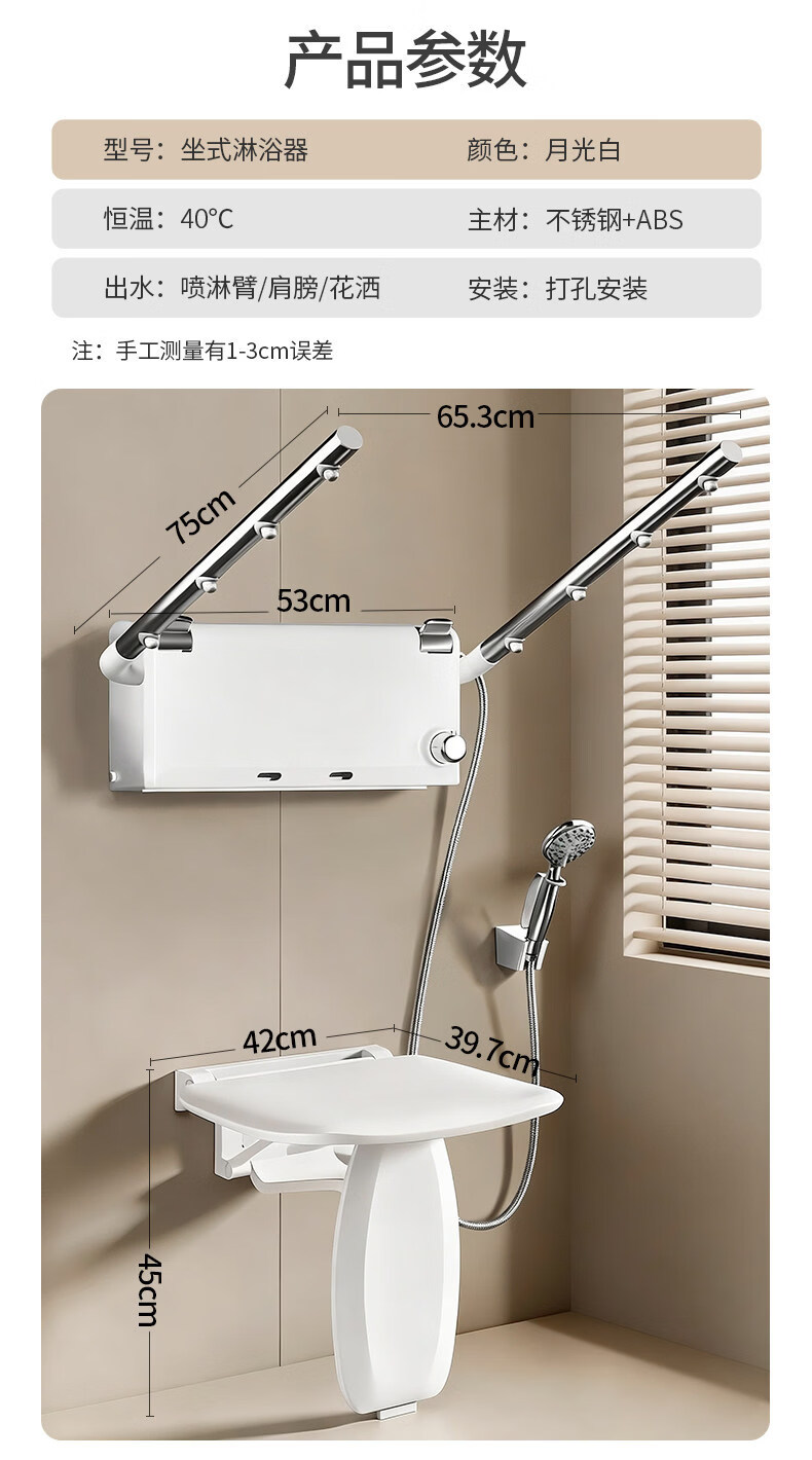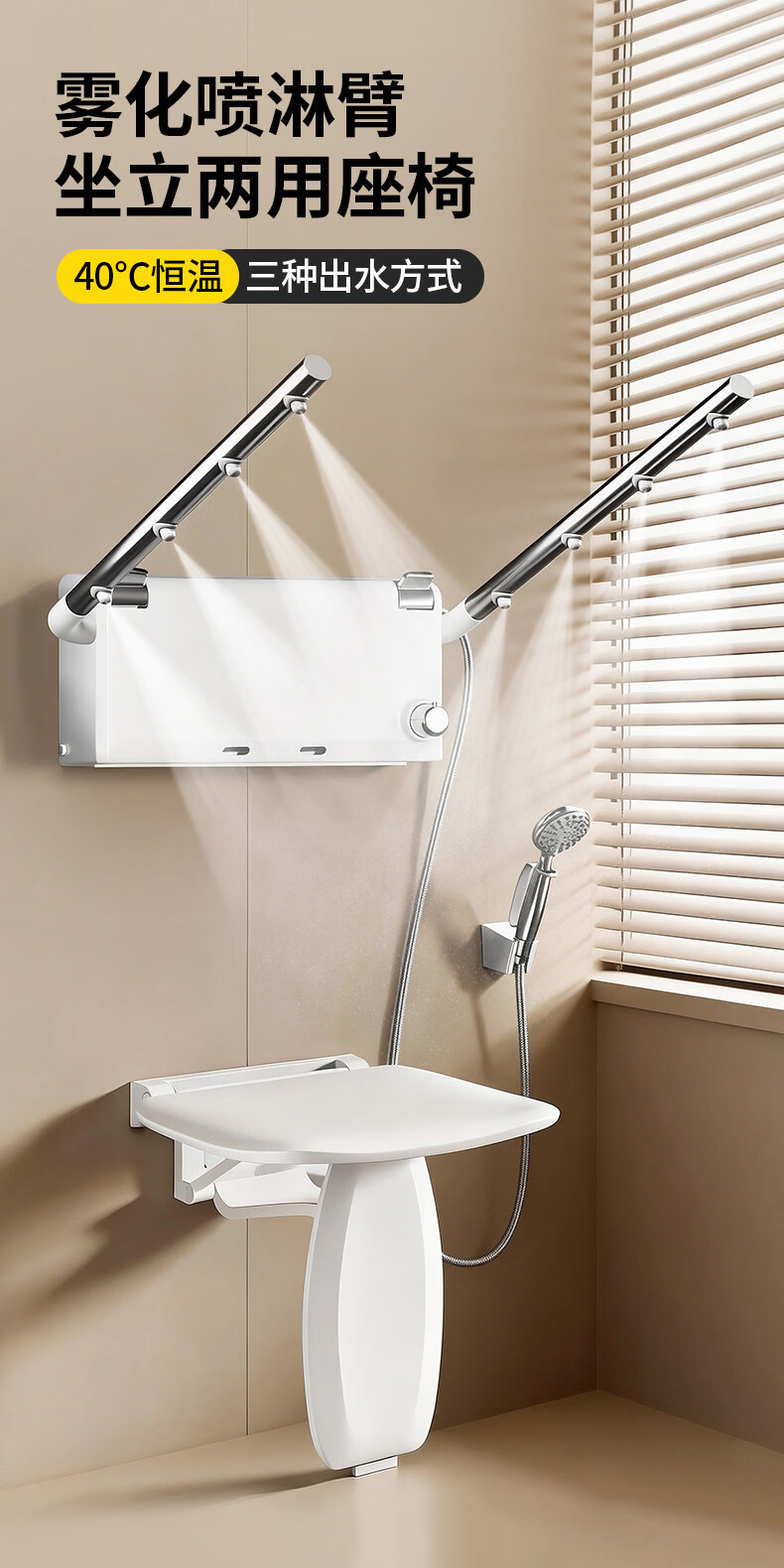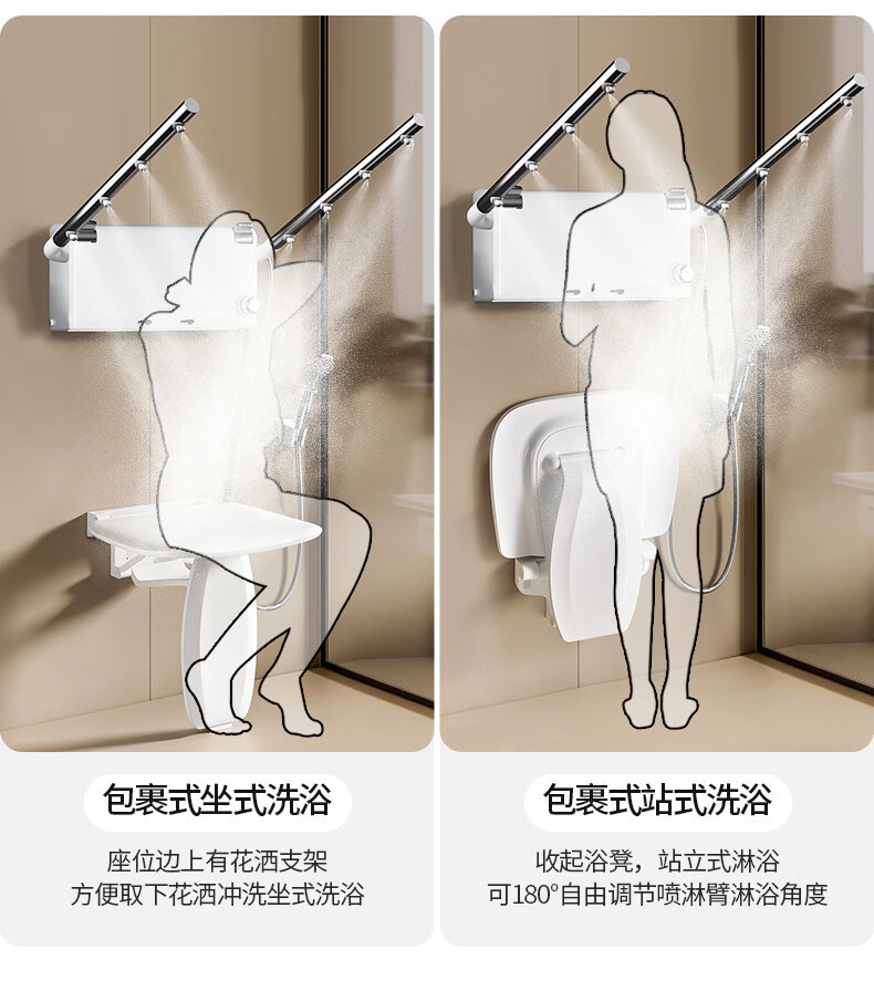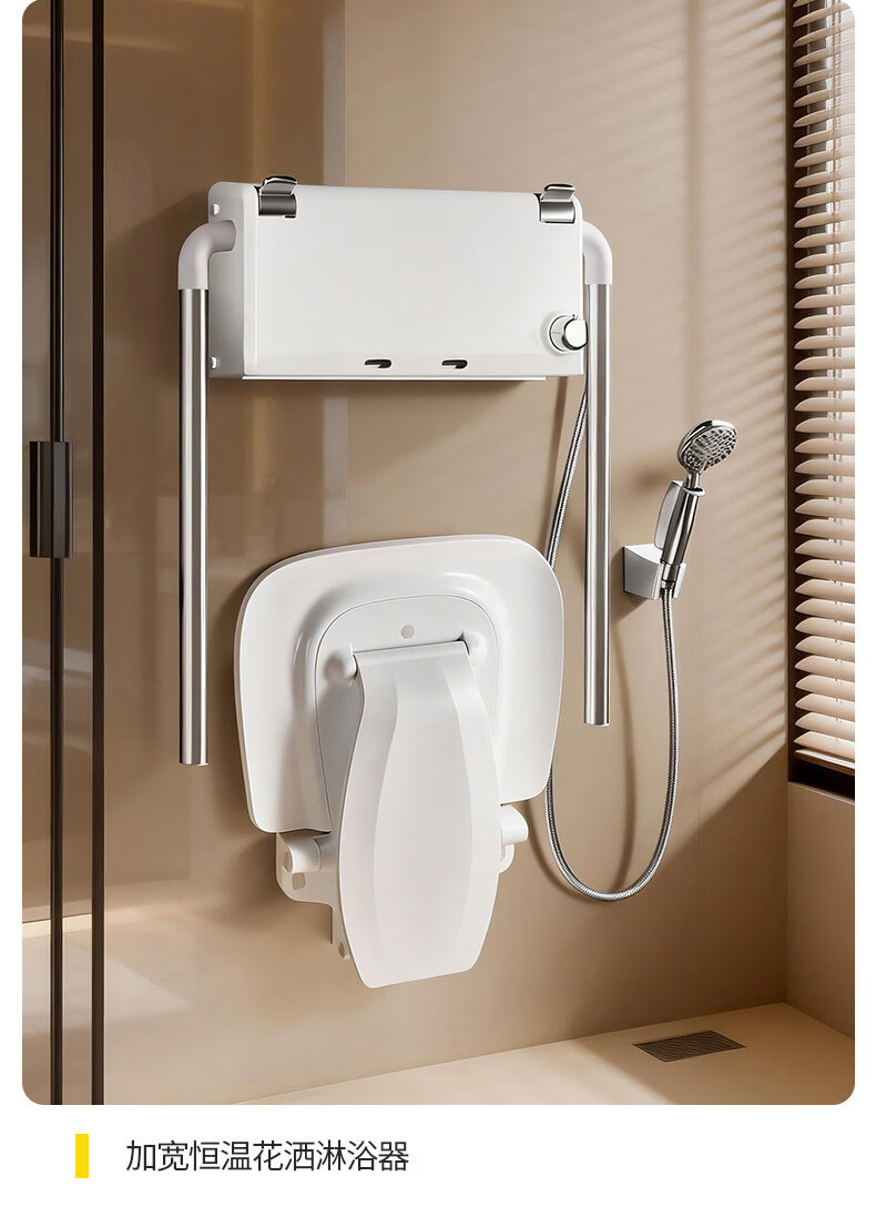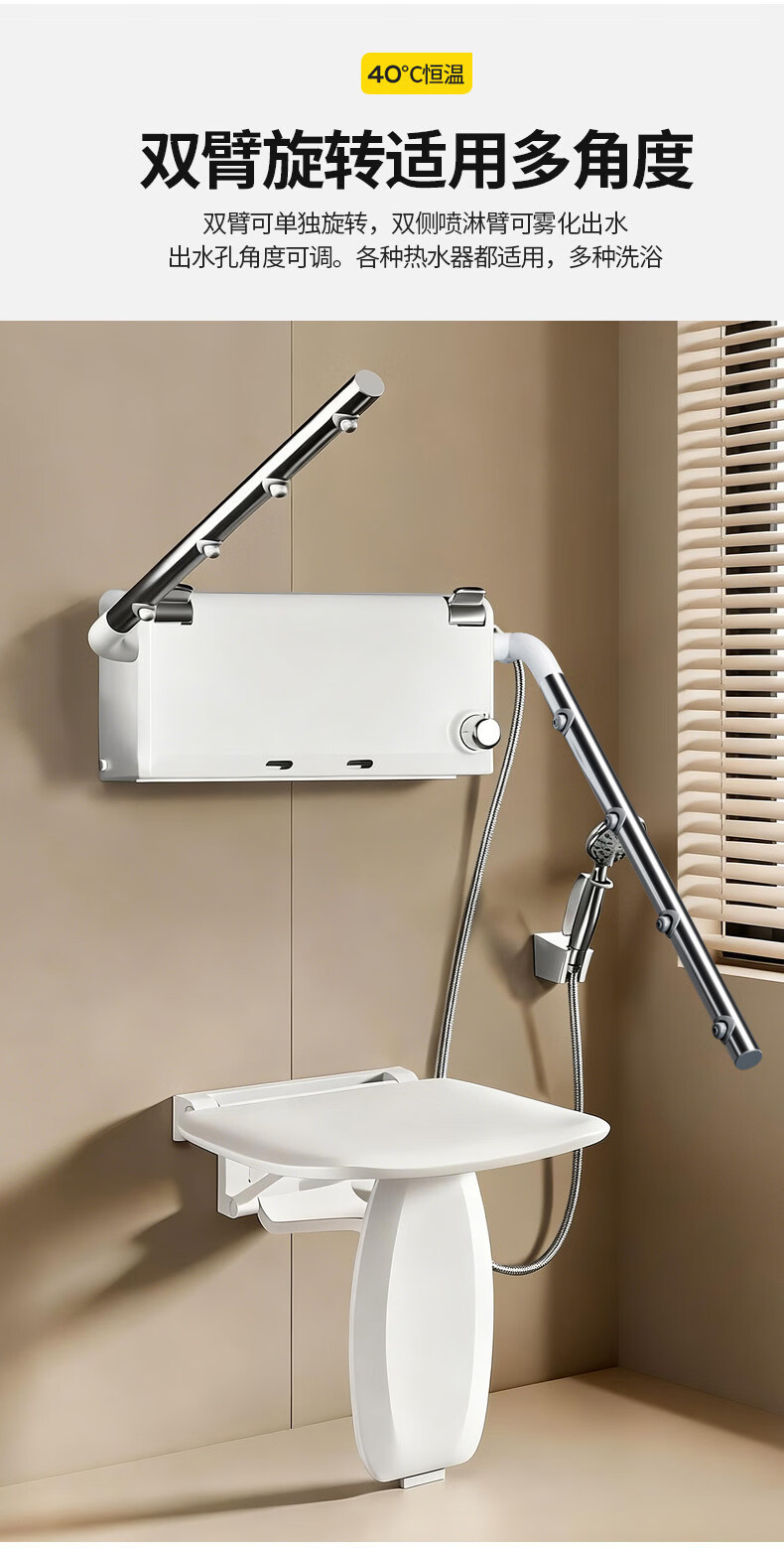 家文化(JIAWENHUA)老人坐式恒温淋浴器卫生间浴室淋浴椅多功能壁挂式淋浴凳花洒扶手 等腰梯形淋浴器月光白(分体双淋浴臂+手持)