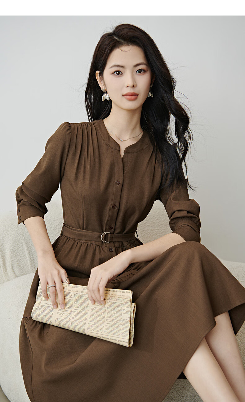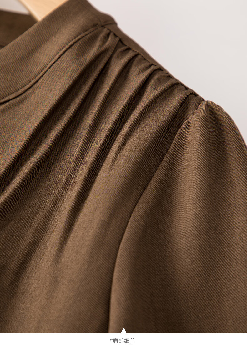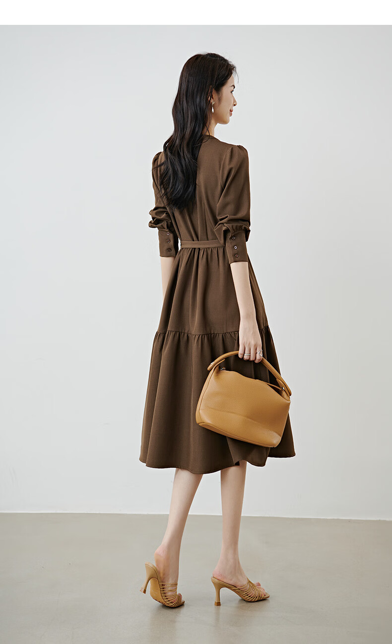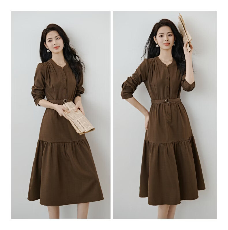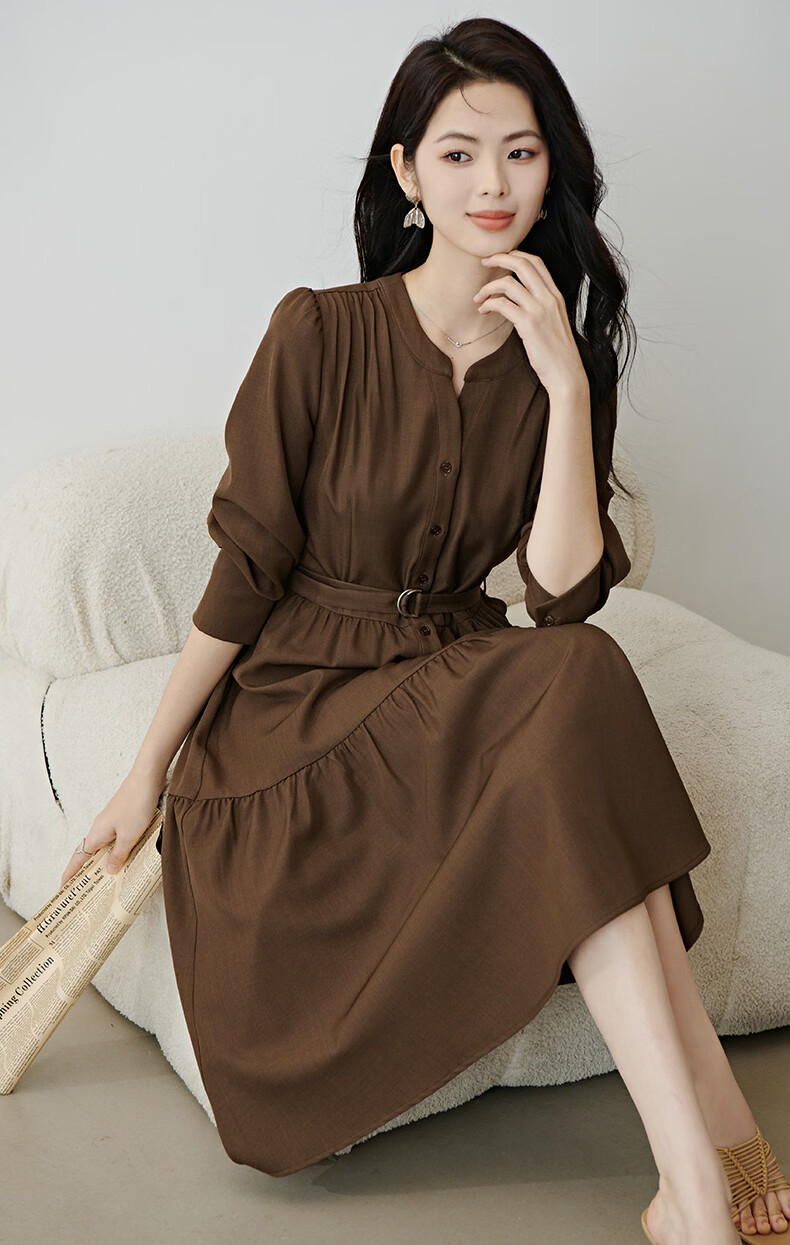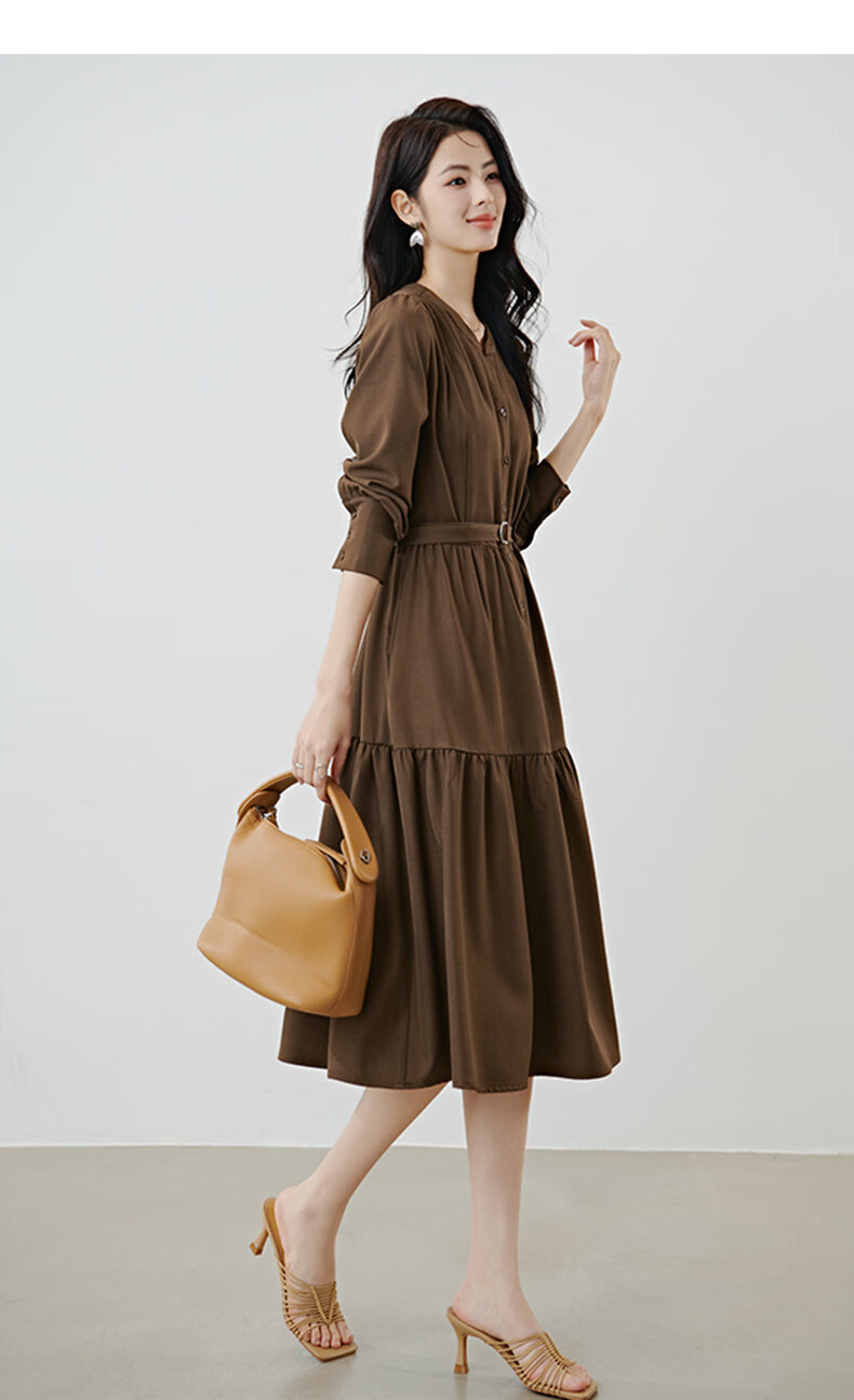 晚白2026春款气质显白摩卡棕小V领裙子系带收腰空气褶裙摆衬衫连衣裙 棕色 XL