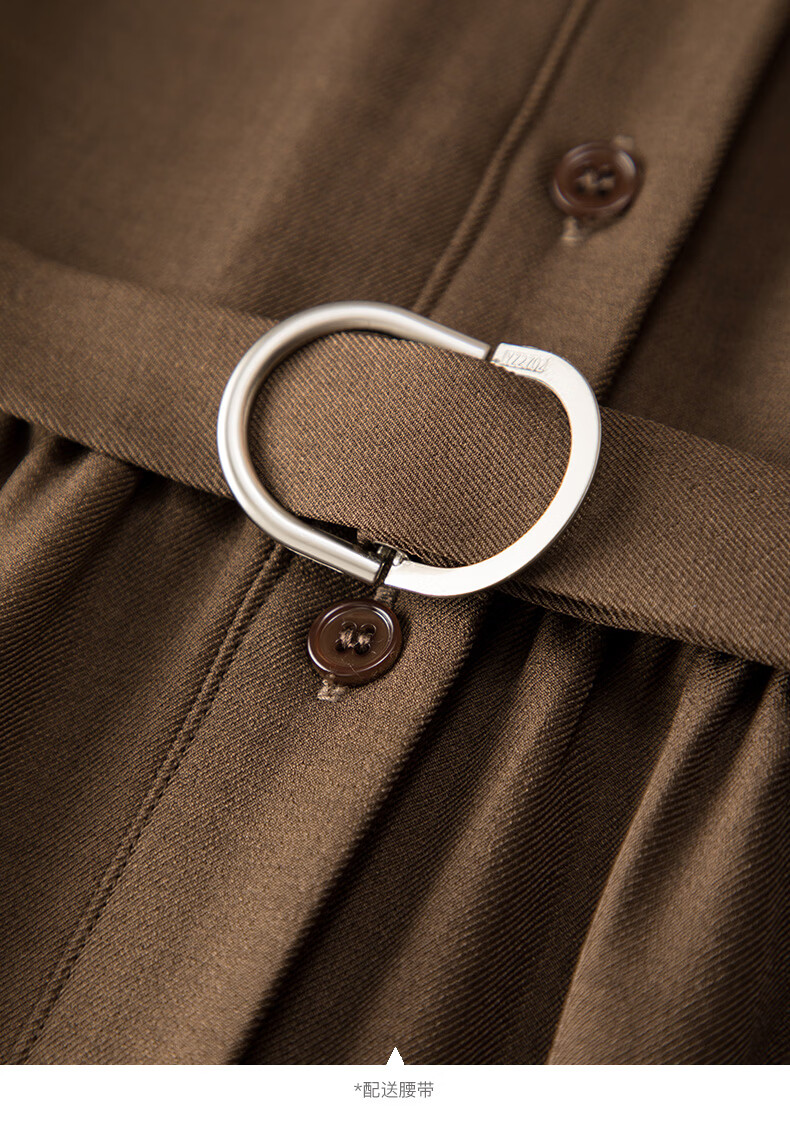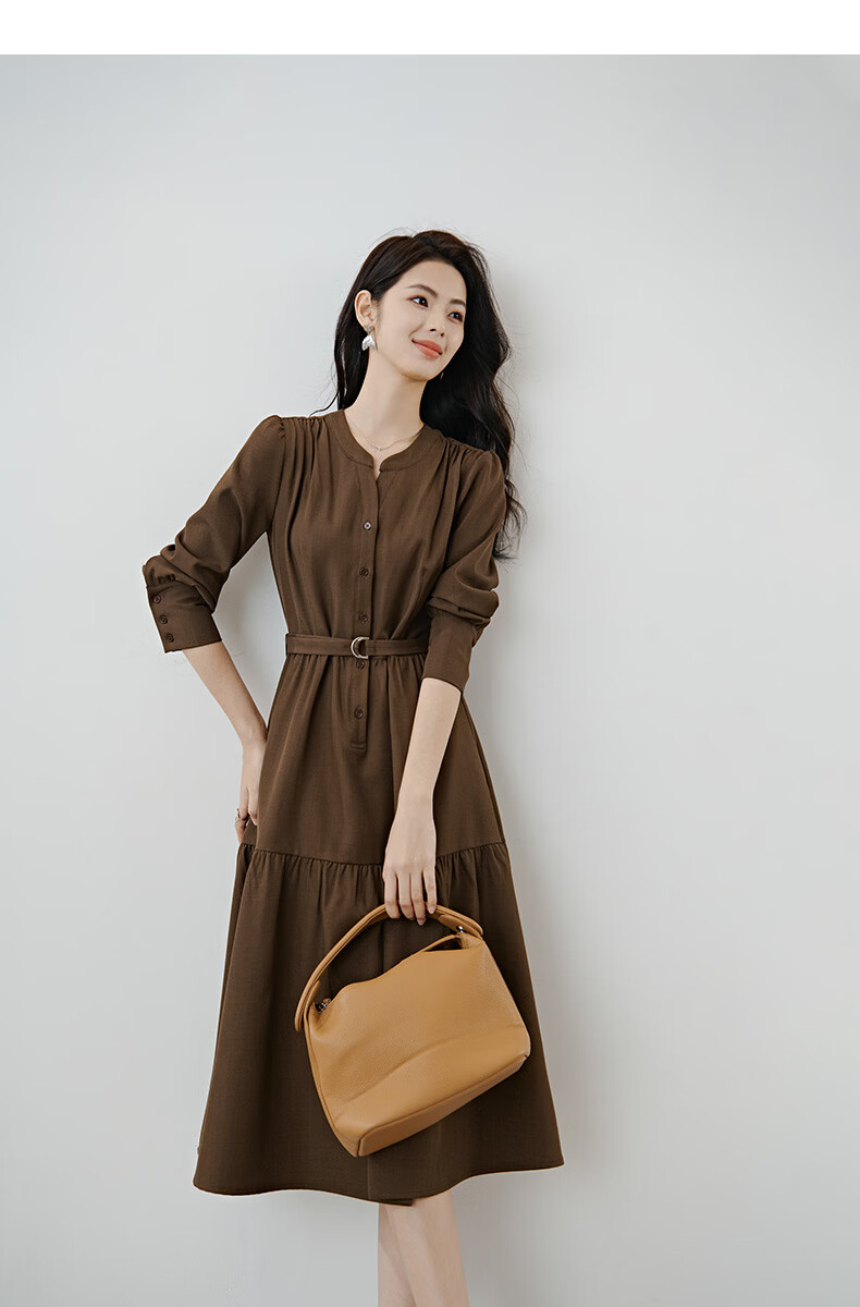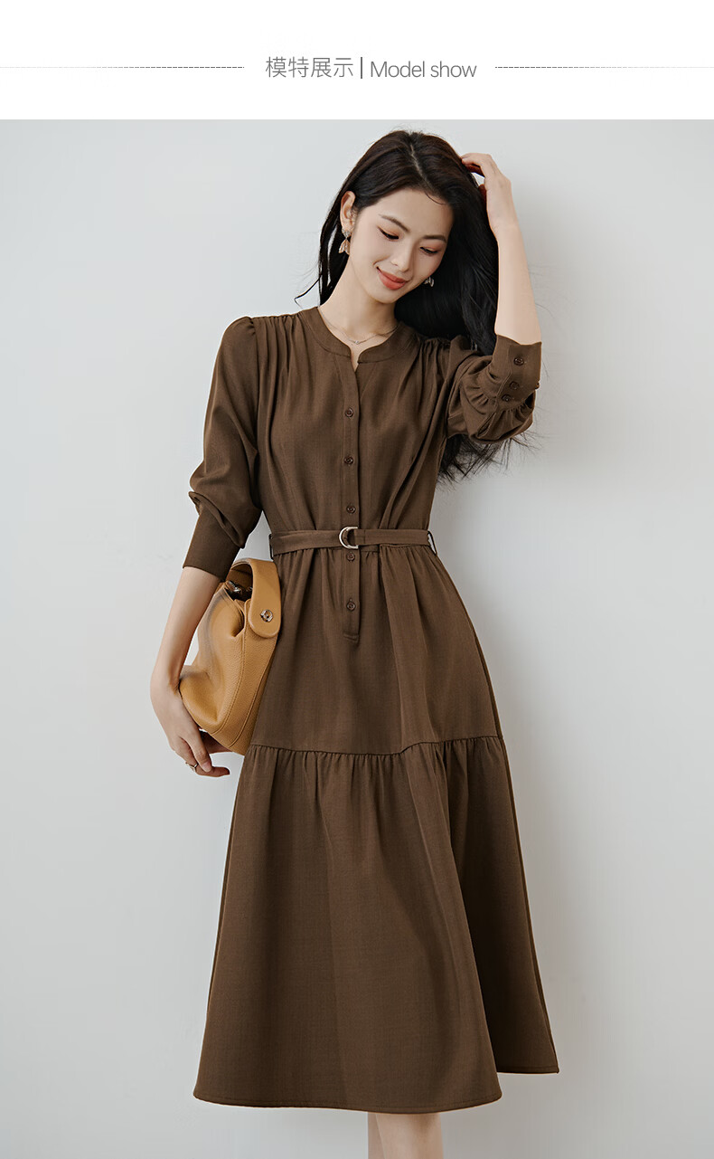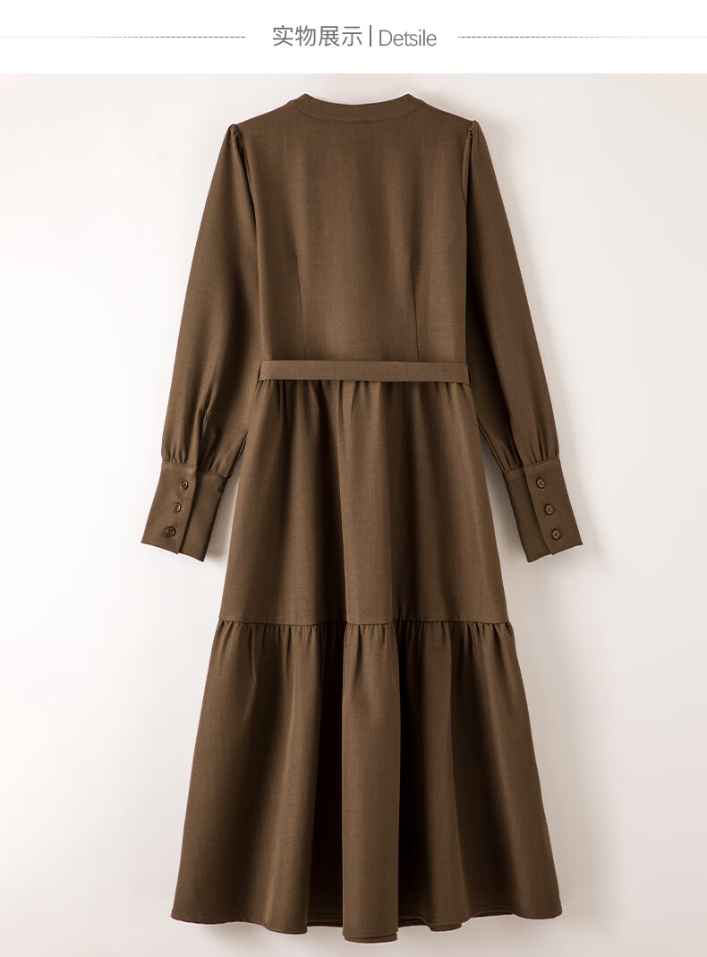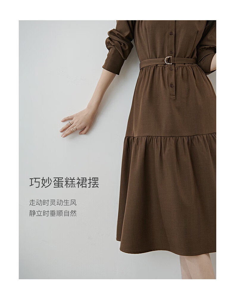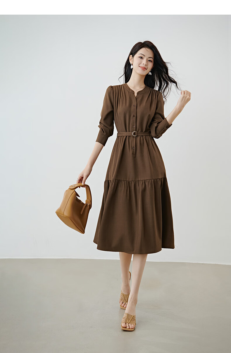 晚白2026春款气质显白摩卡棕小V领裙子系带收腰空气褶裙摆衬衫连衣裙 棕色 XL