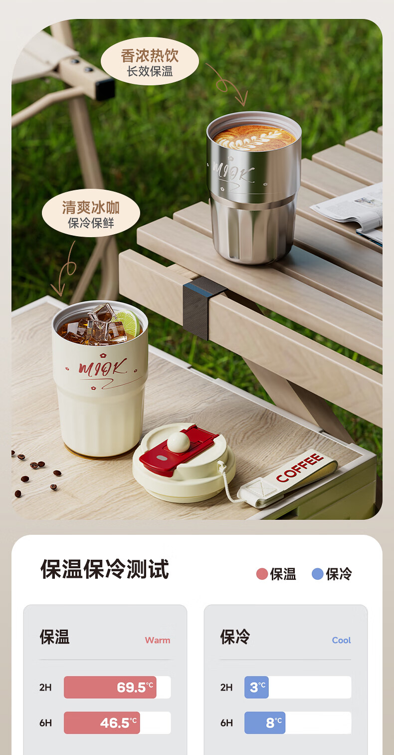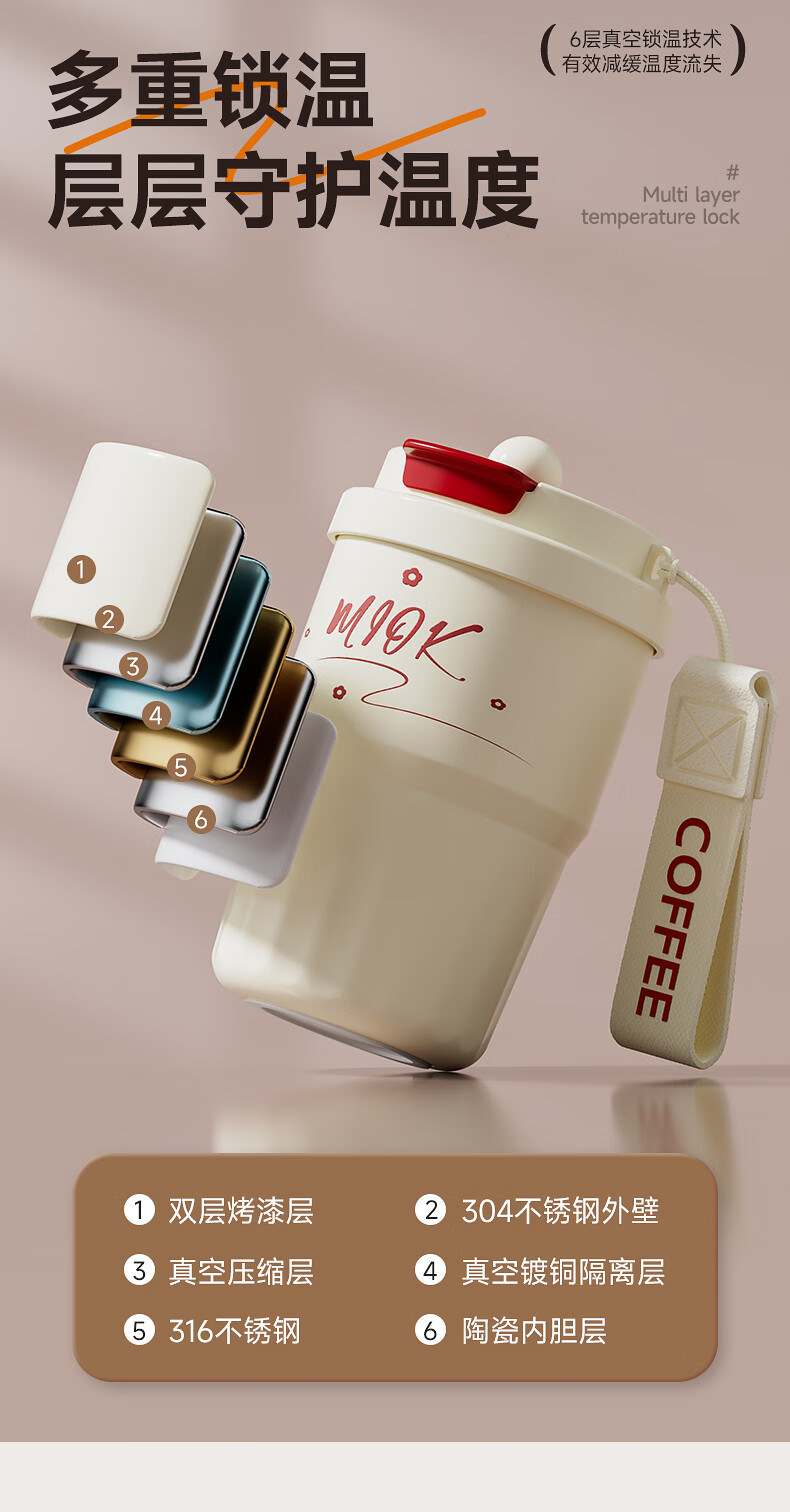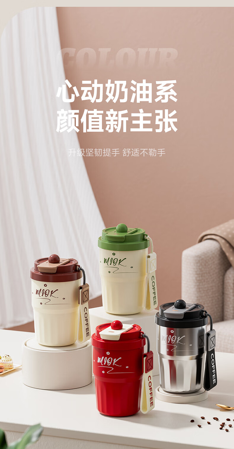 MIOK保温杯女士咖啡杯316不锈钢陶瓷内胆水杯高颜值学生便携随行杯子 清新绿 360ml 【陶瓷内胆+提绳】
