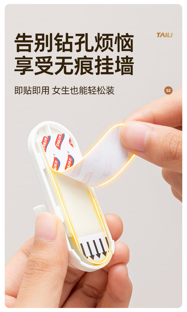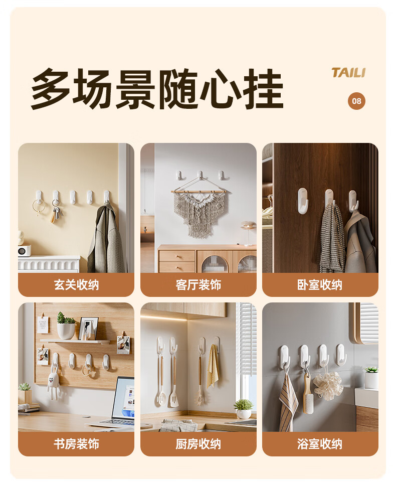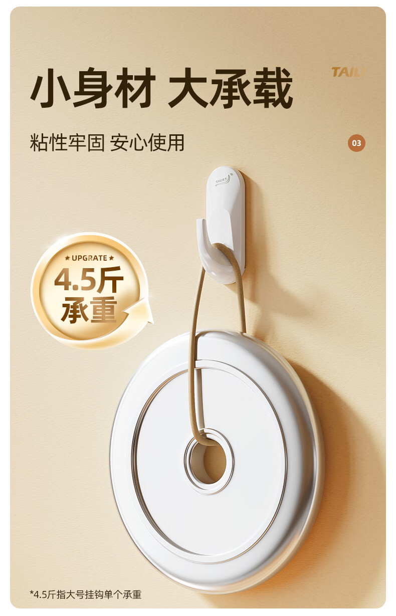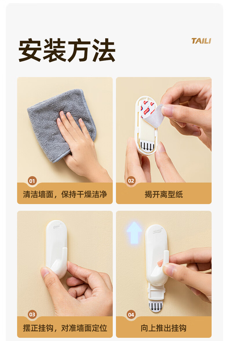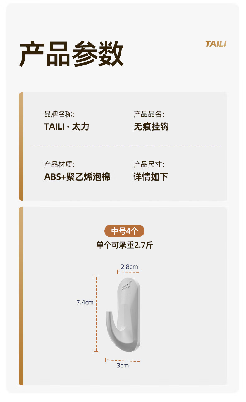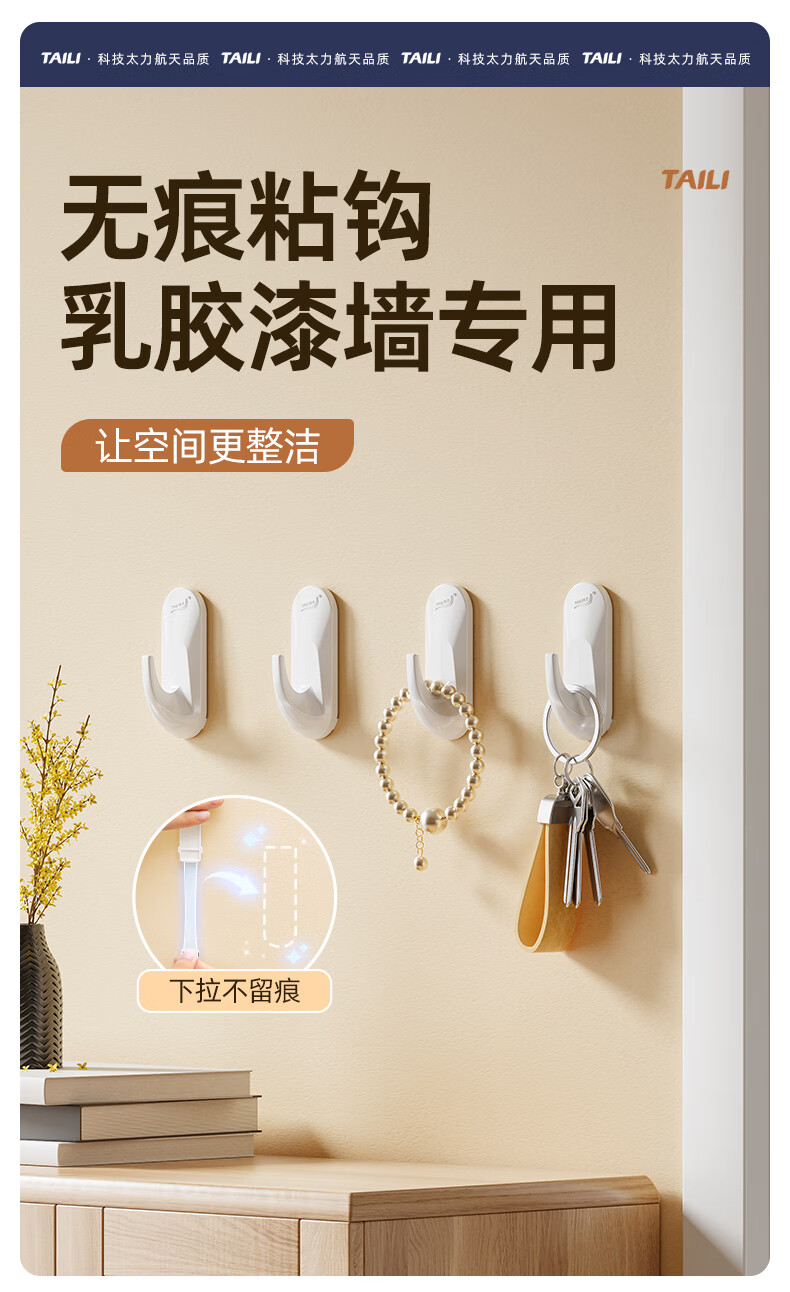 太力无痕粘胶挂钩超强粘力免打孔门后挂衣钩乳胶墙面可用中号4个装