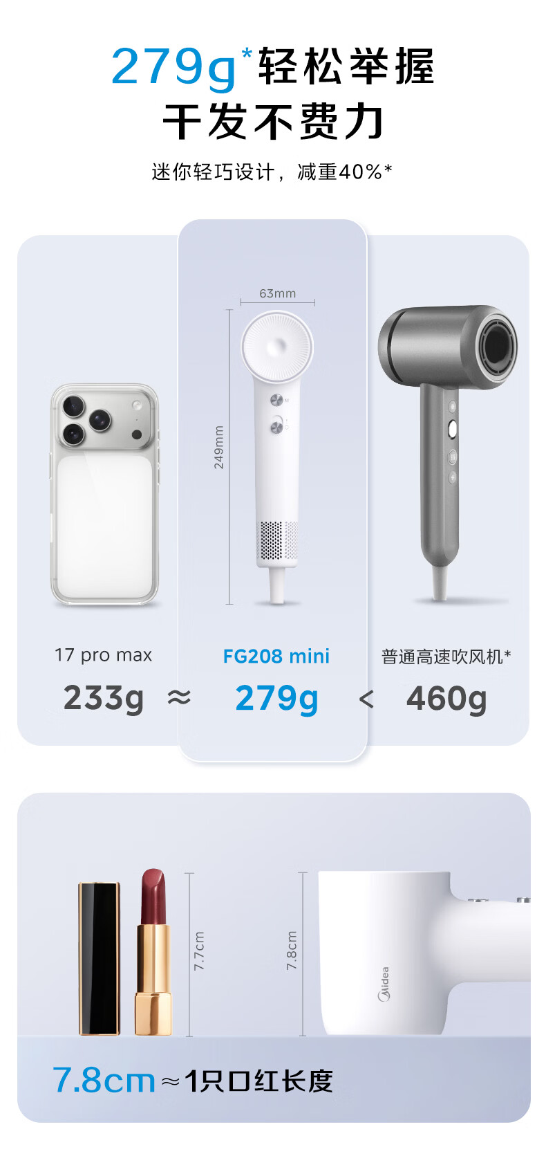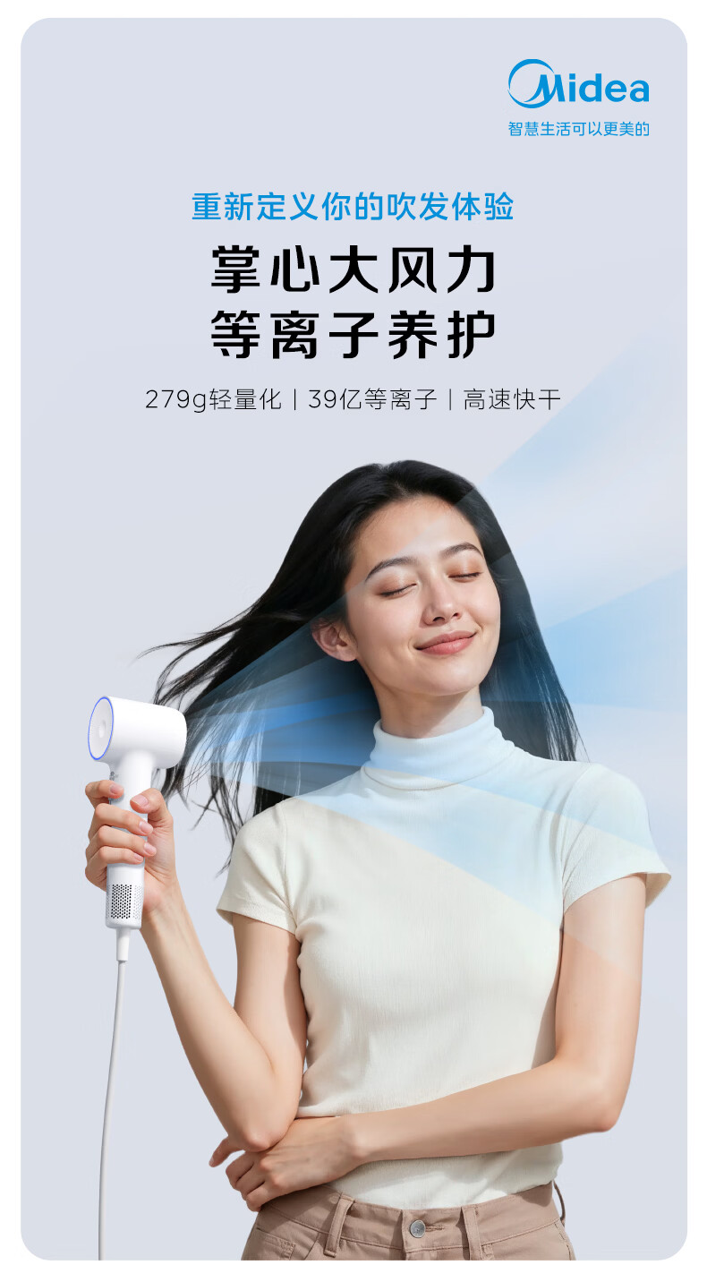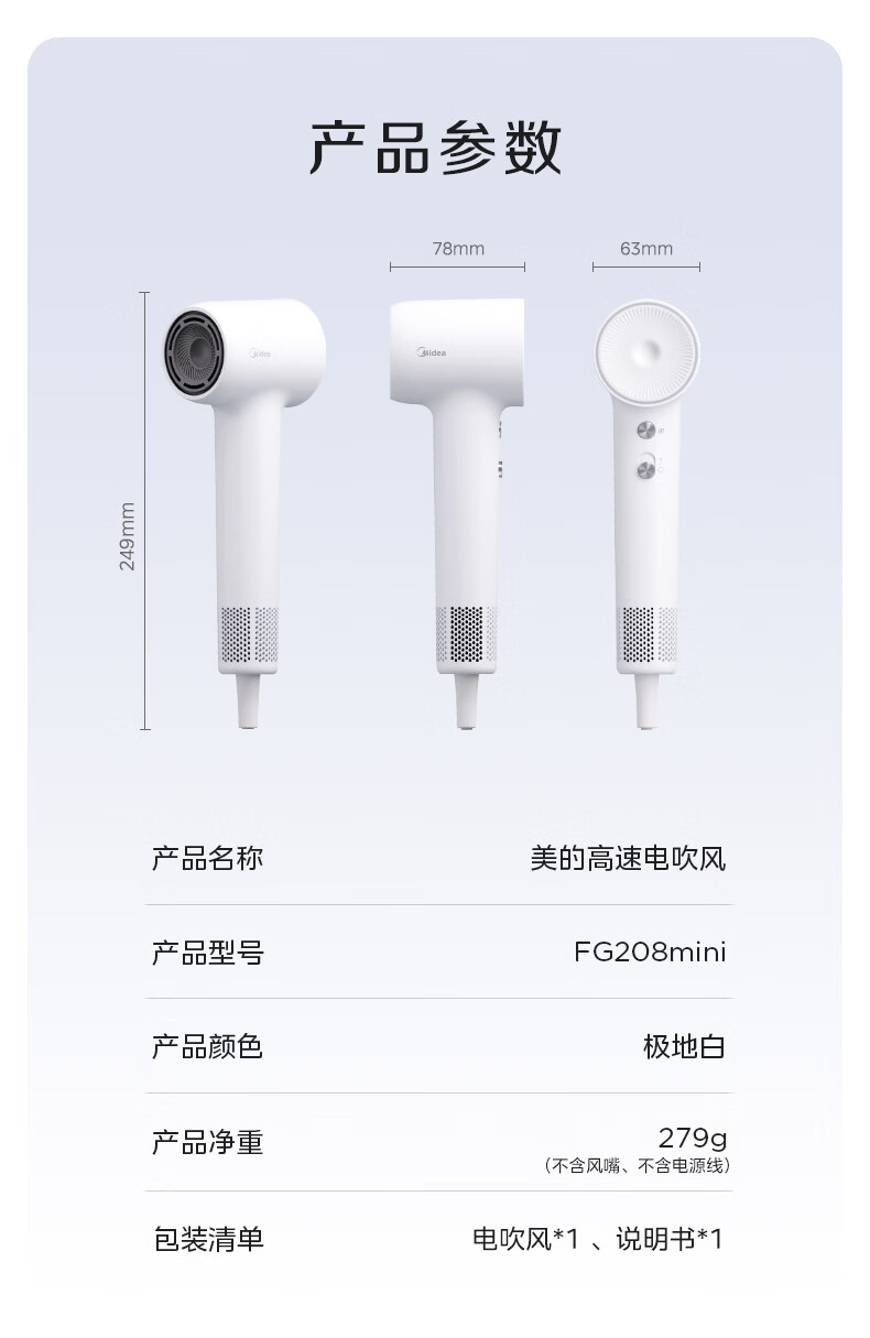 美的(Midea)高速吹风机 39亿等离子护发 家用负离子电吹风 速干便携吹风筒FG208Mini 800W宿舍可用 生日礼物