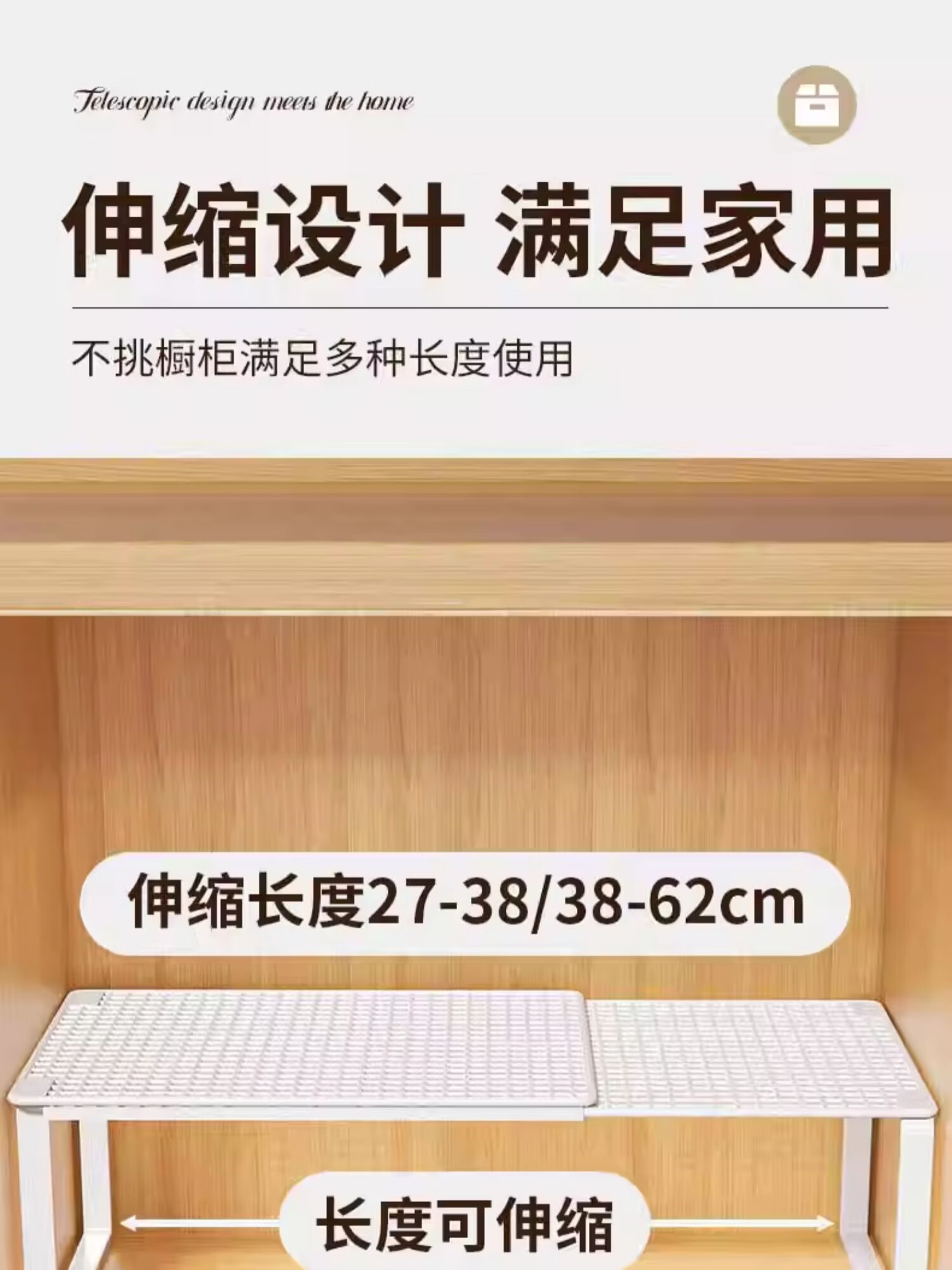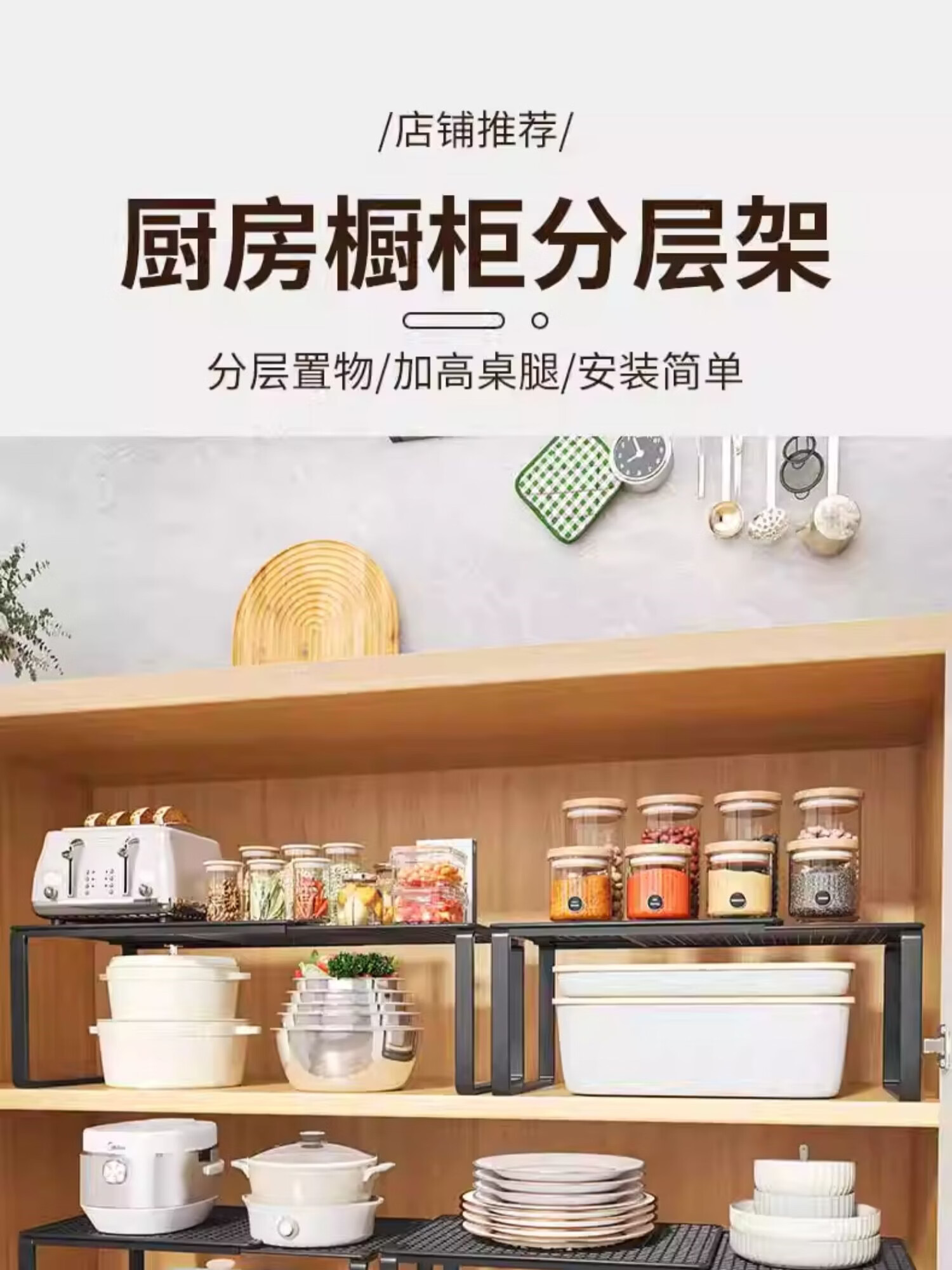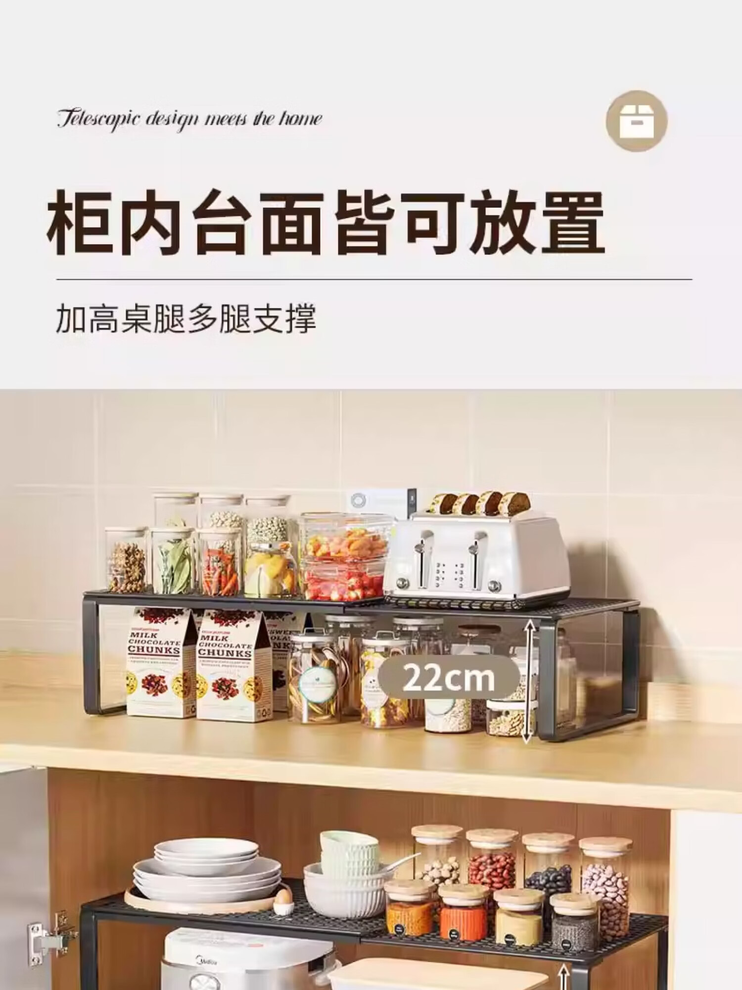 馨婺家可伸缩厨房橱柜分层置物架柜内隔板台面下水槽调料碗盘锅具收纳架 黑色-伸缩27-38*27*22【单层】