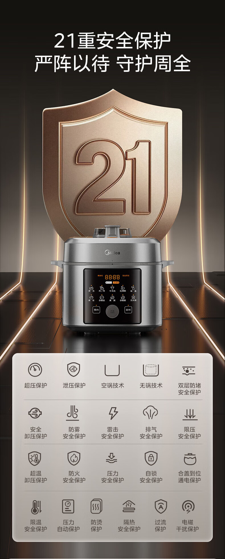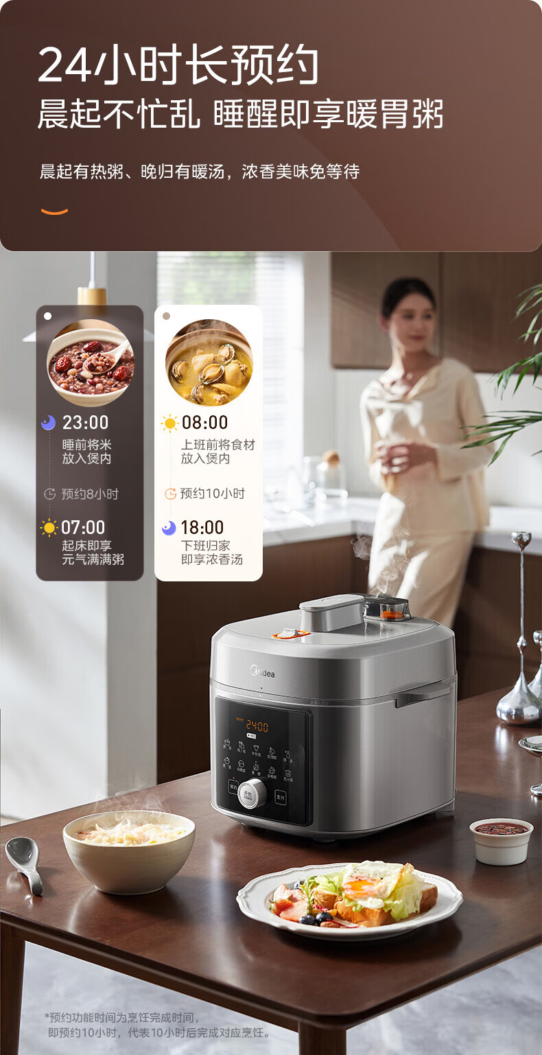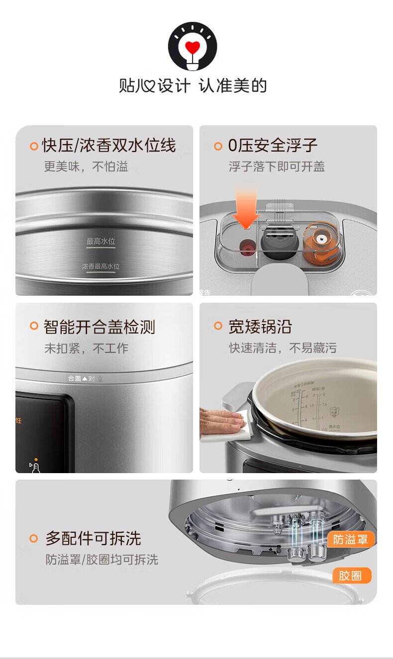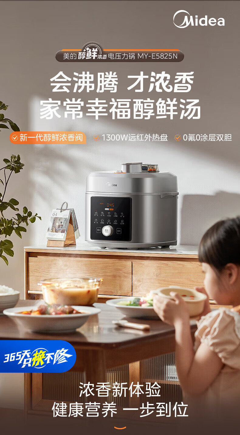 美的(Midea)沸腾浓香双模式小飞侠电压力锅0氟0涂层双胆304不锈钢高压锅5L智能多功能预约家用煲汤4-6人煮饭煲 MY-E5825N 5L