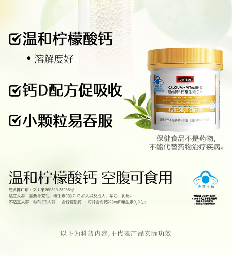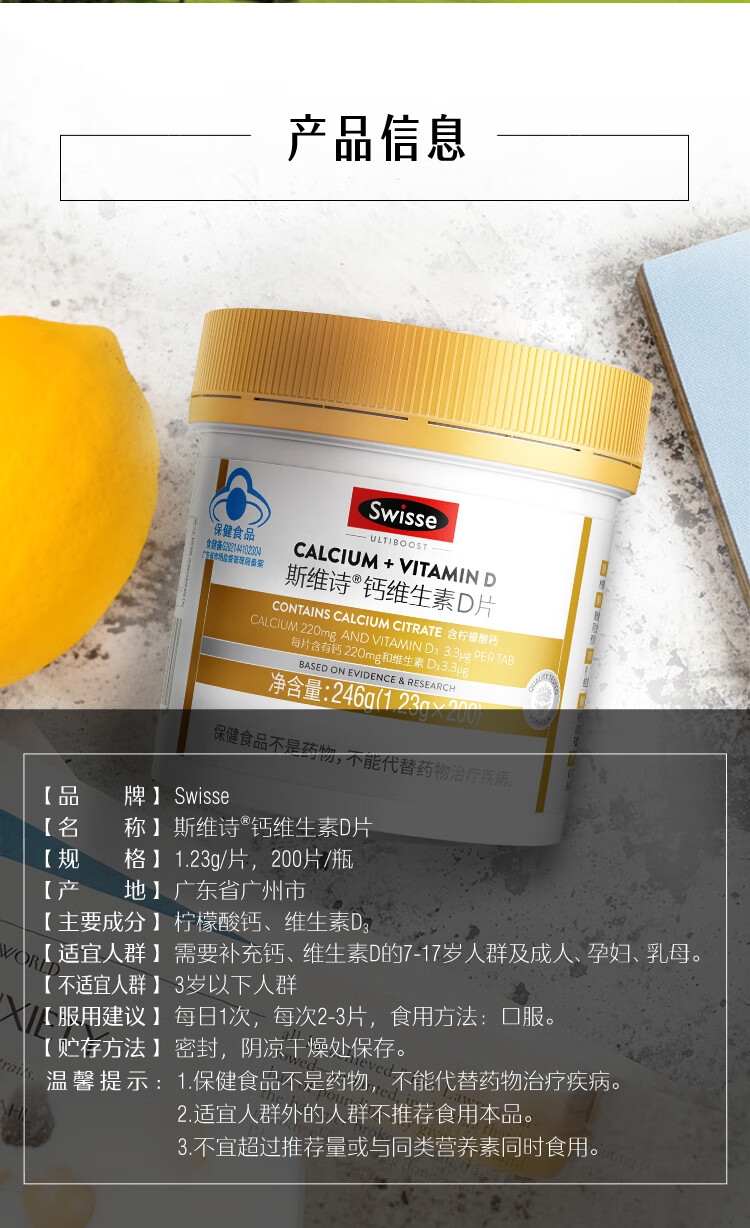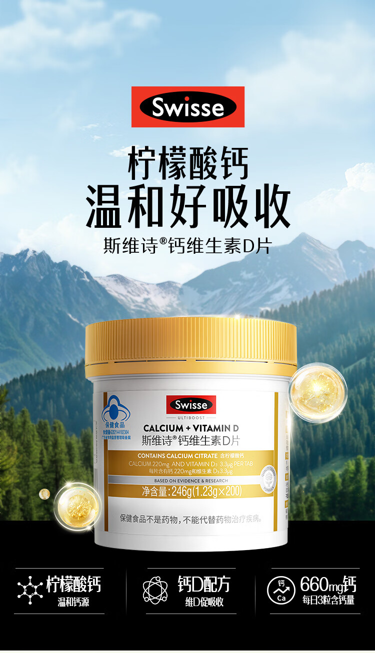 Swisse斯维诗 迷你钙维生素D片 柠檬酸钙好吸收 孕妇中老年人适用 200粒