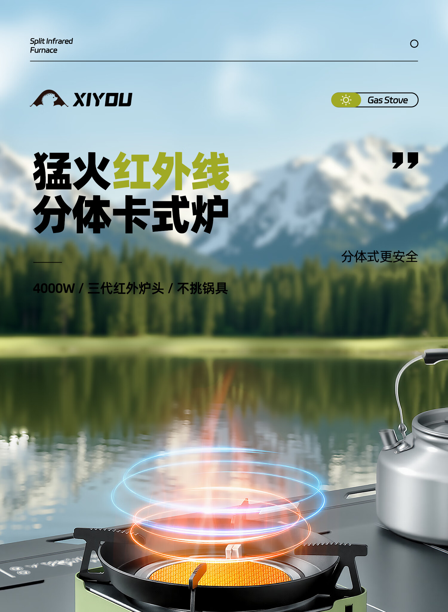 嘻由分体式卡式炉2025新款户外炉具便携式煮茶露营家用防风猛火卡磁炉 【4000W三代红外炉】+便携包+转接头 极氪黑【超薄节能红外猛火】