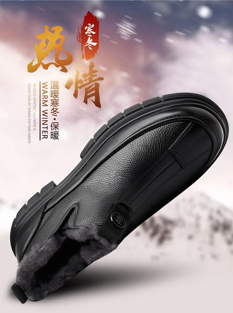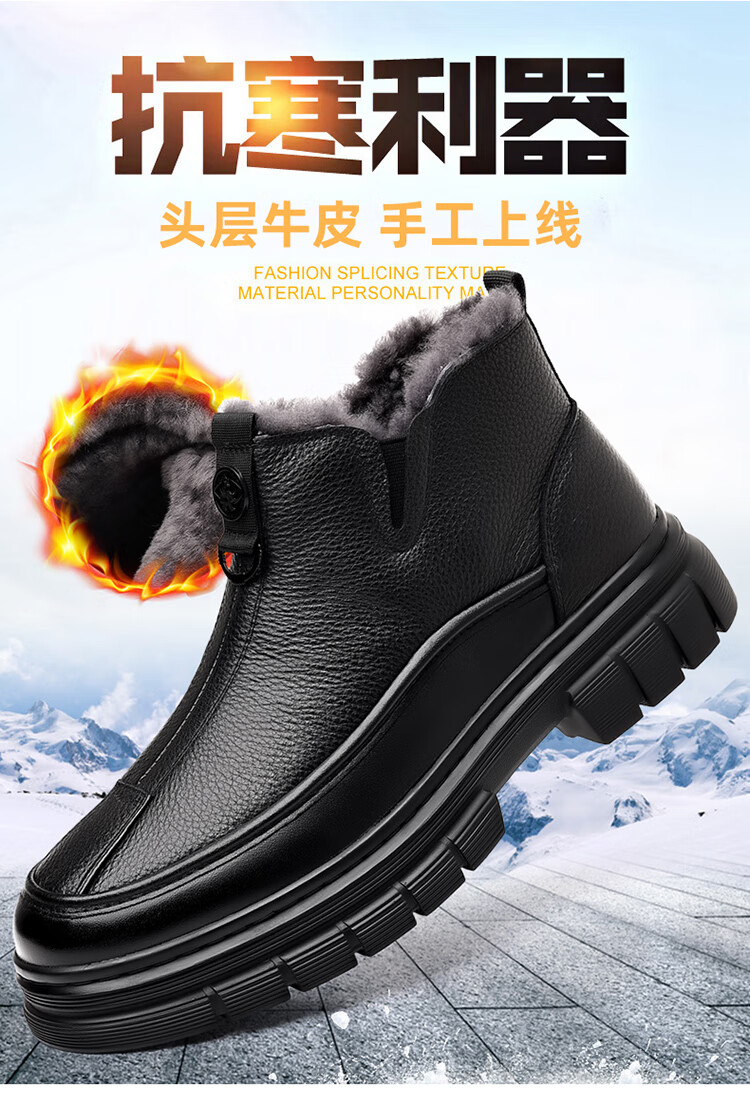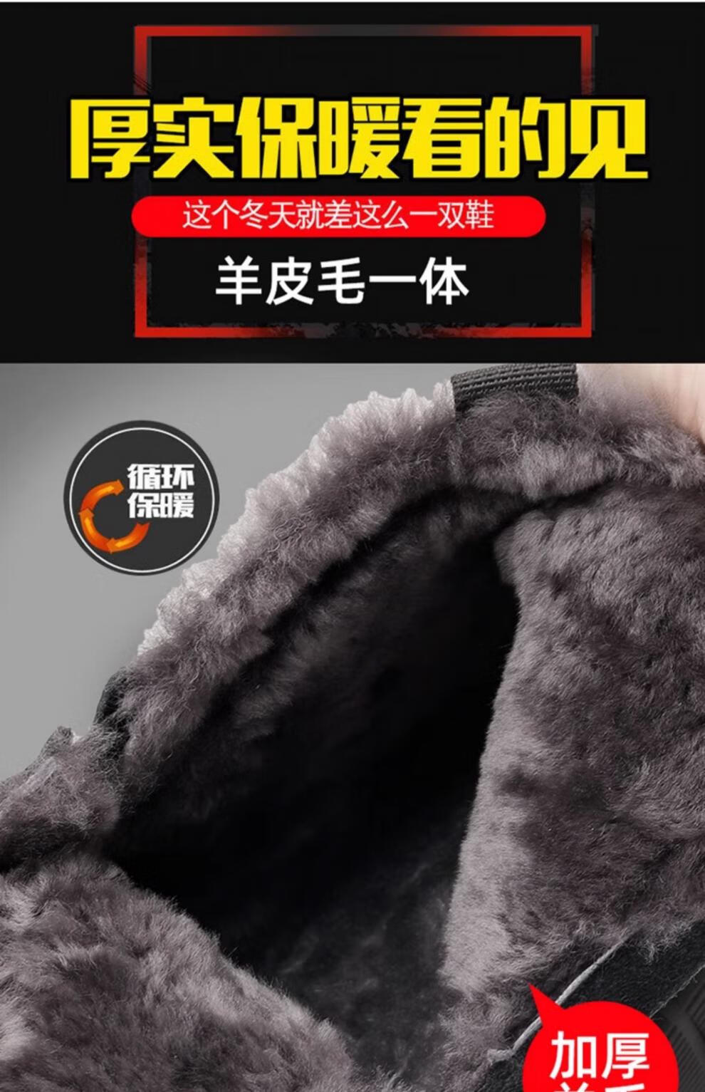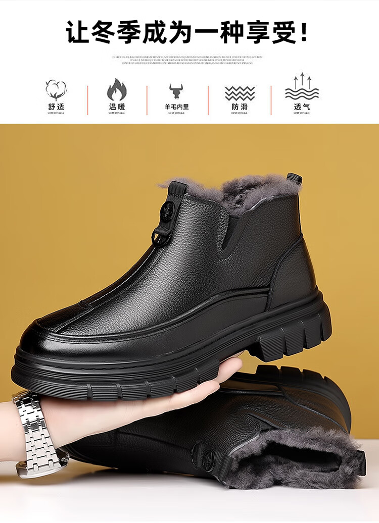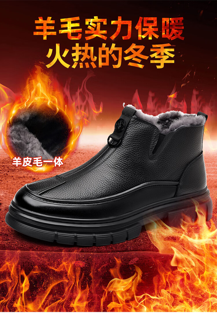 稻草人(MEXICAN)棉鞋男款2026冬季新款真皮羊毛休闲爸爸高帮鞋加绒加厚保暖雪地靴 黑色 38 【标准皮鞋码】
