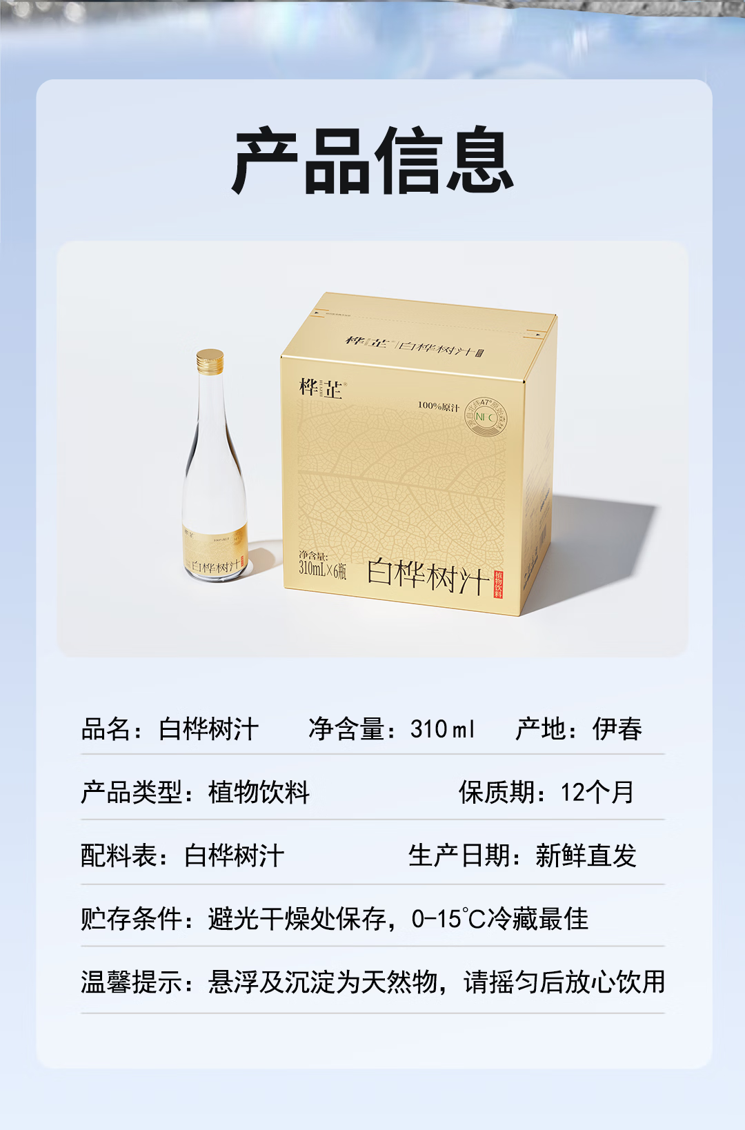 桦芷 小兴安岭白桦树汁 天然原汁原液NFC补充能量健康饮品年货送礼 【热卖爆款】310ml*12瓶
