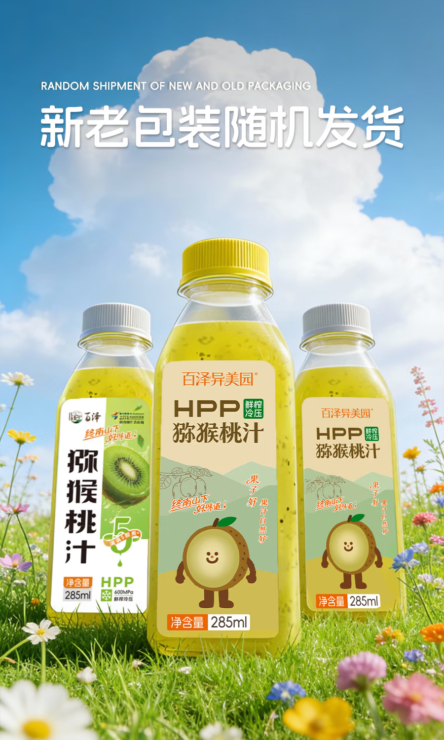百泽异美园HPP猕猴桃汁 100%鲜榨果汁饮料无添加 0脂含膳食纤维聚餐解腻饮品 【店长推荐】285ml×8瓶