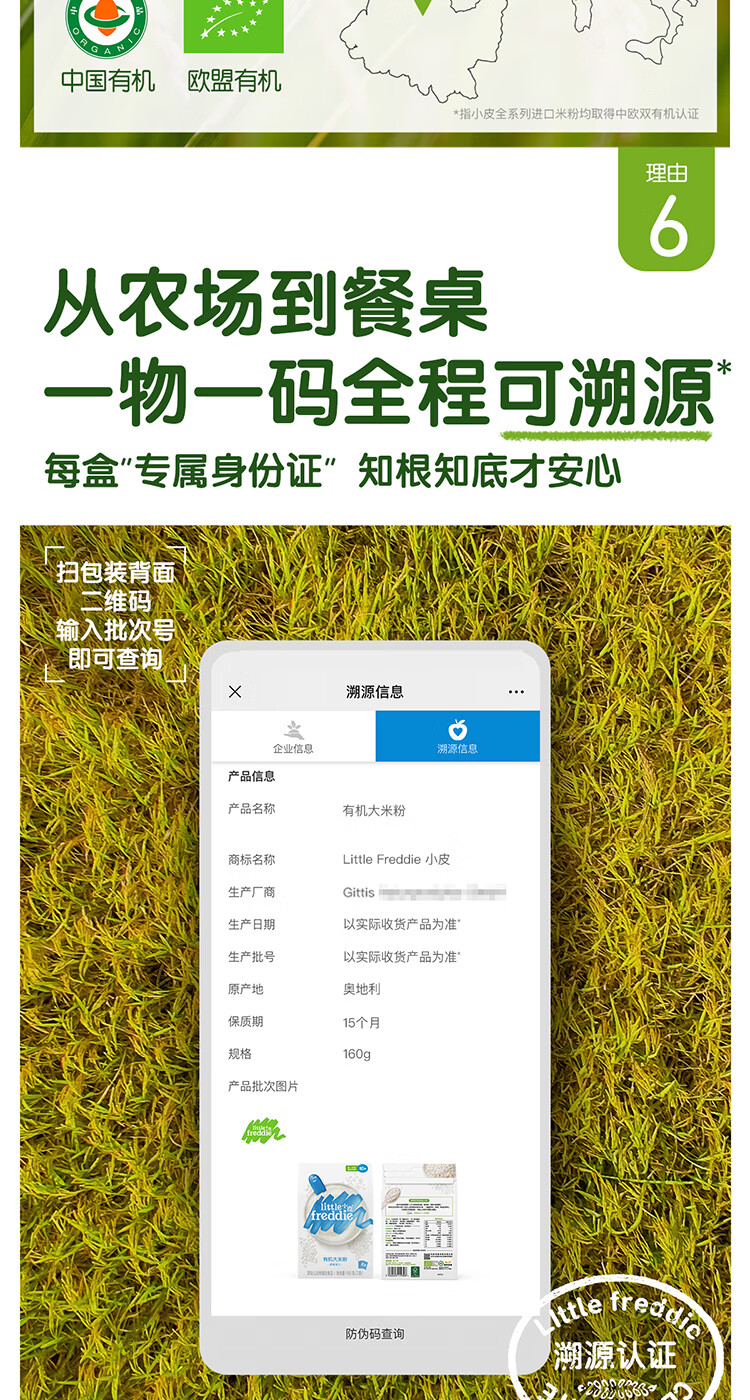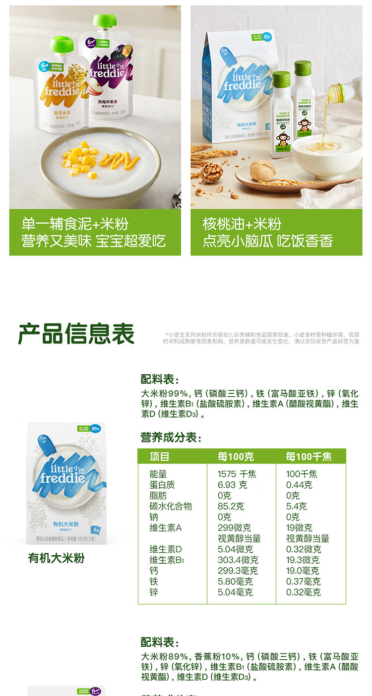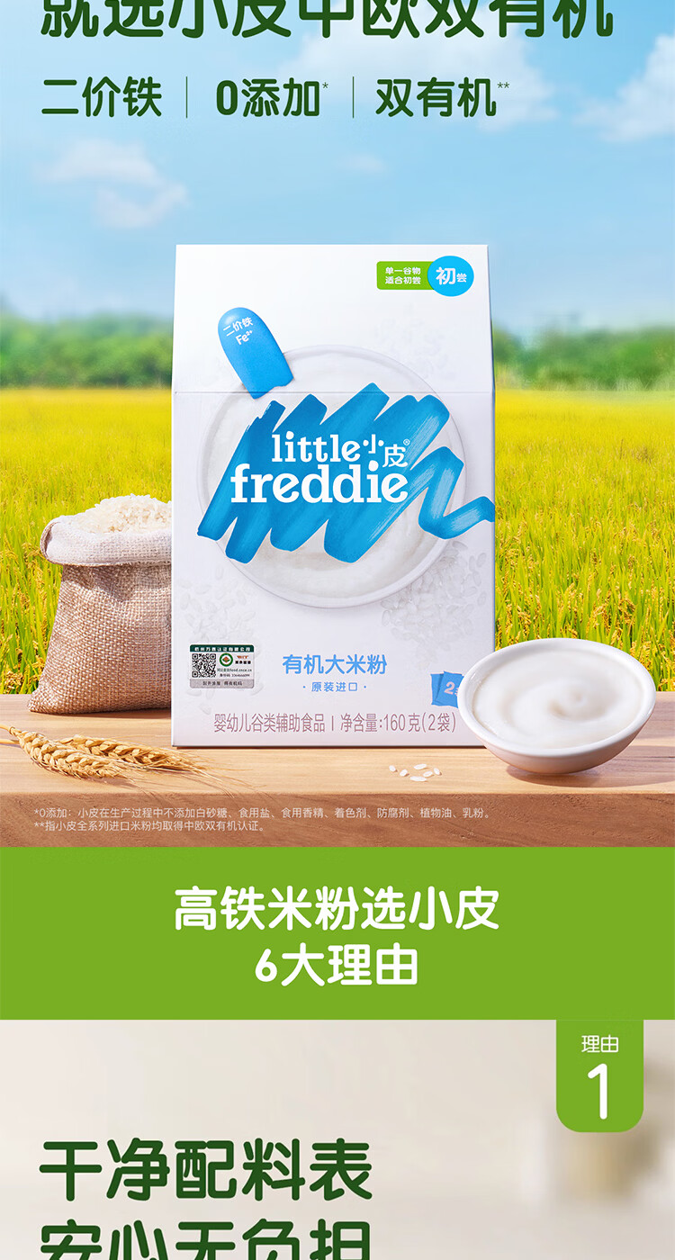 小皮有机高铁婴幼儿米粉160g 欧洲原装进口营养宝宝辅食米糊6月+ 【两盒装】 原味有机大米粉160g