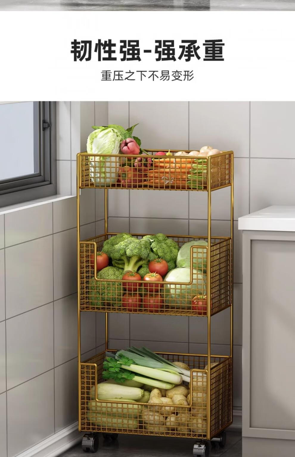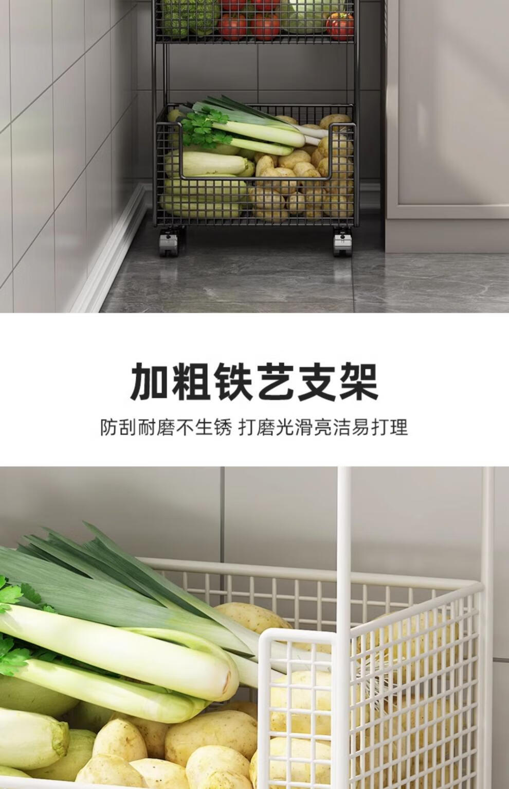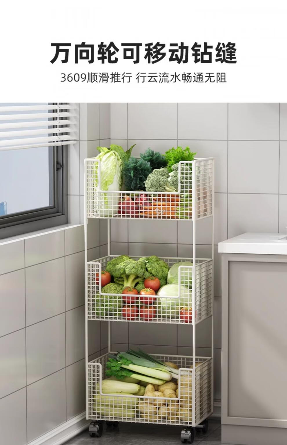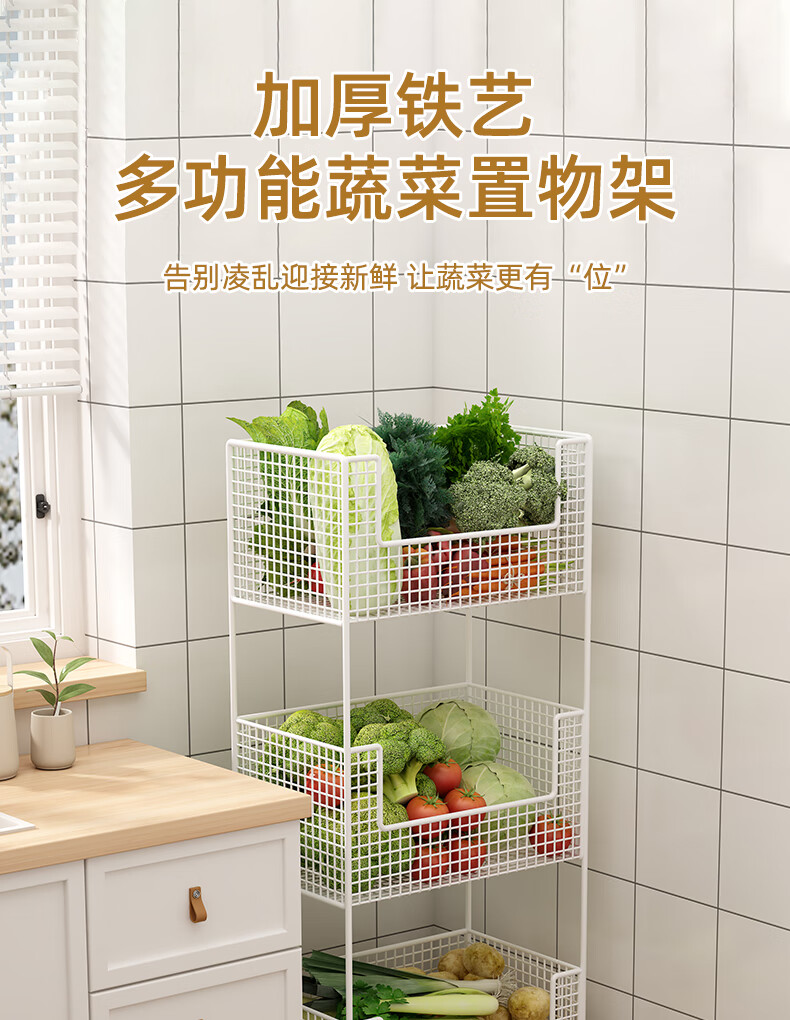 蔬菜篮子置物架厨房蔬菜家用放菜篮子可移动小推车多层水 白色三层【带轮】