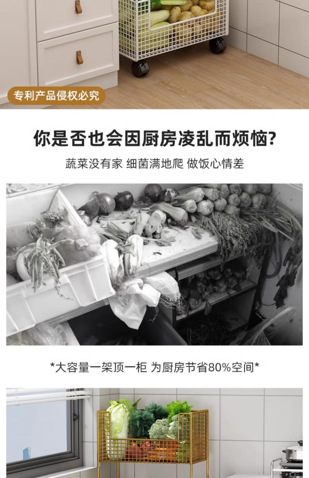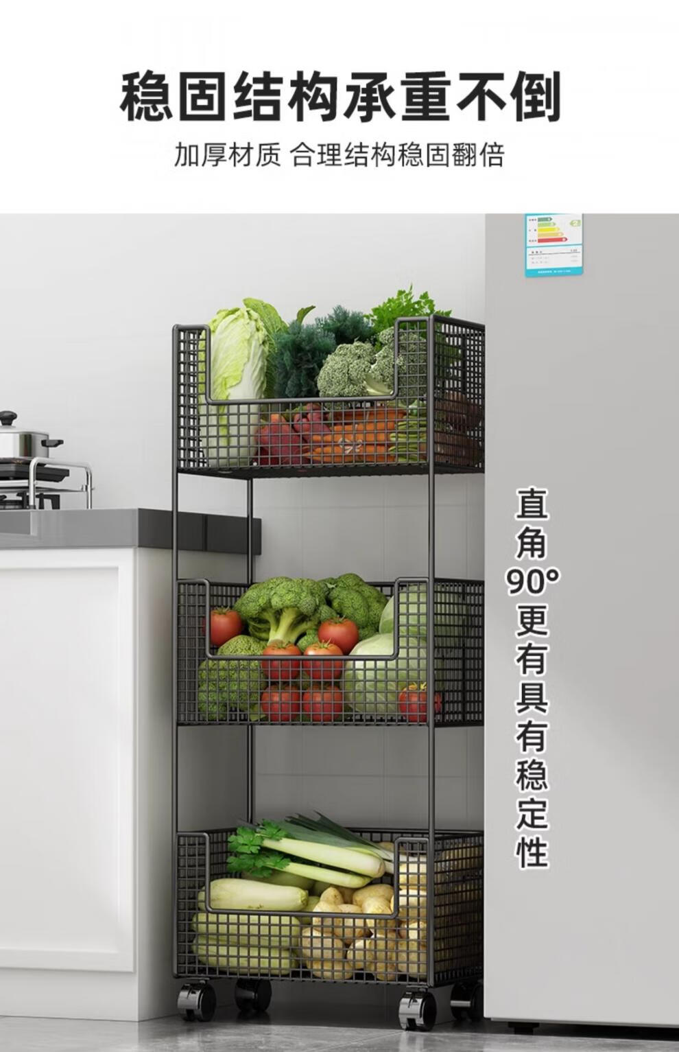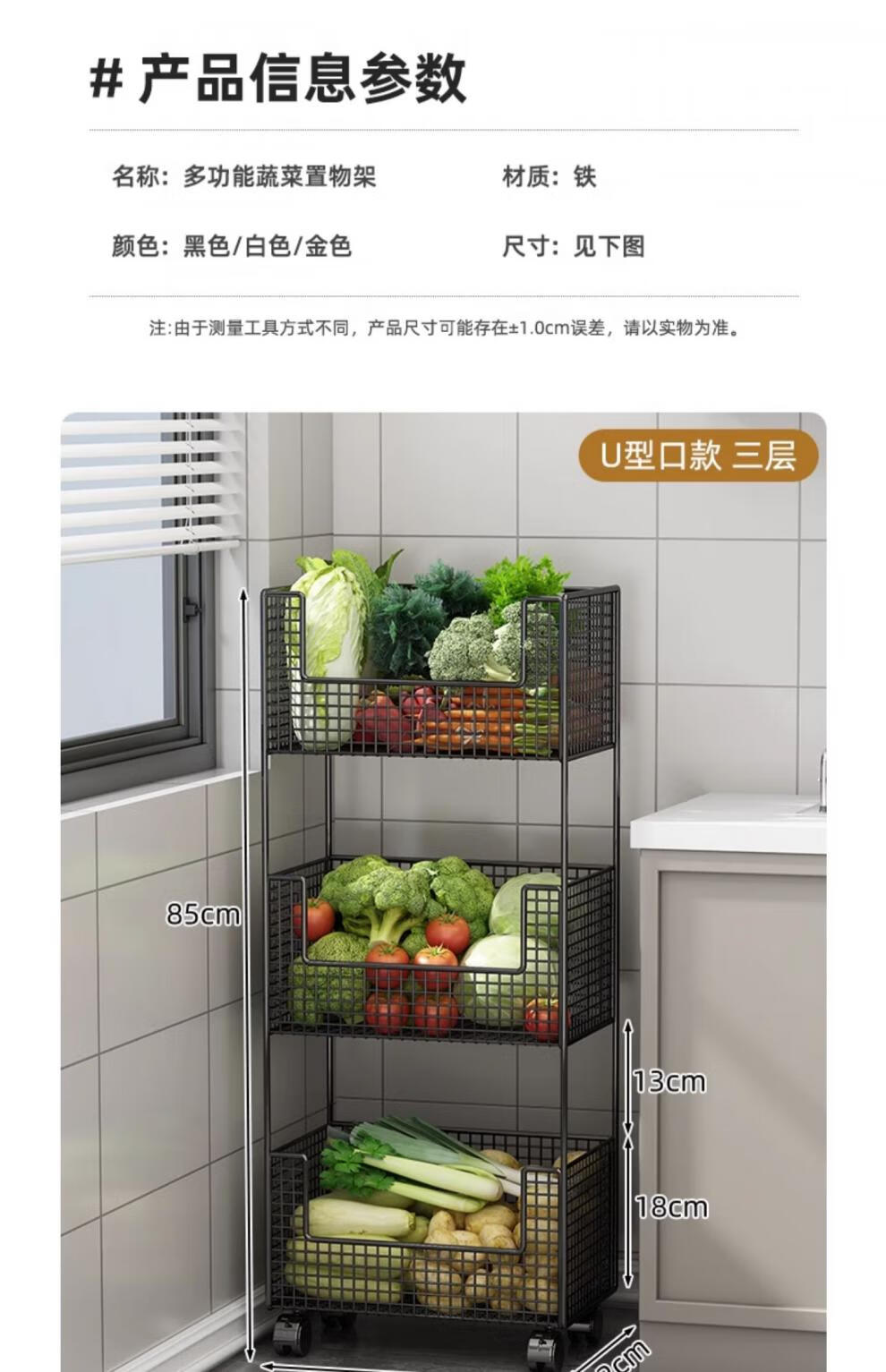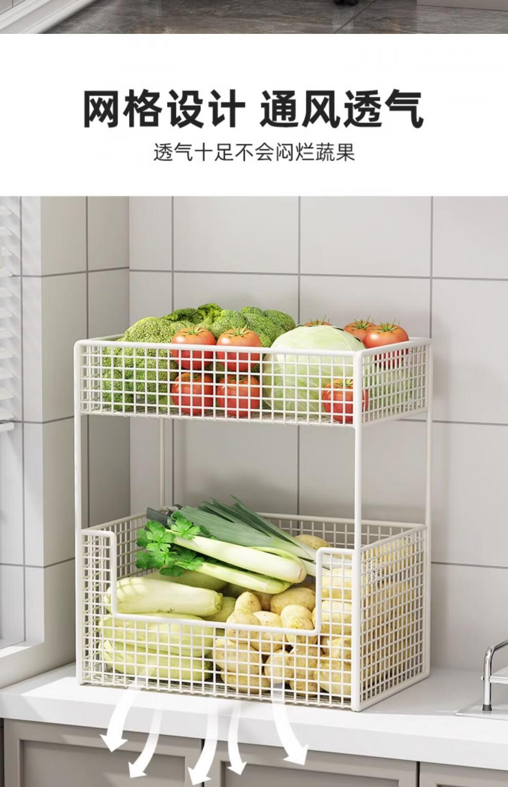 蔬菜篮子置物架厨房蔬菜家用放菜篮子可移动小推车多层水 白色三层【带轮】