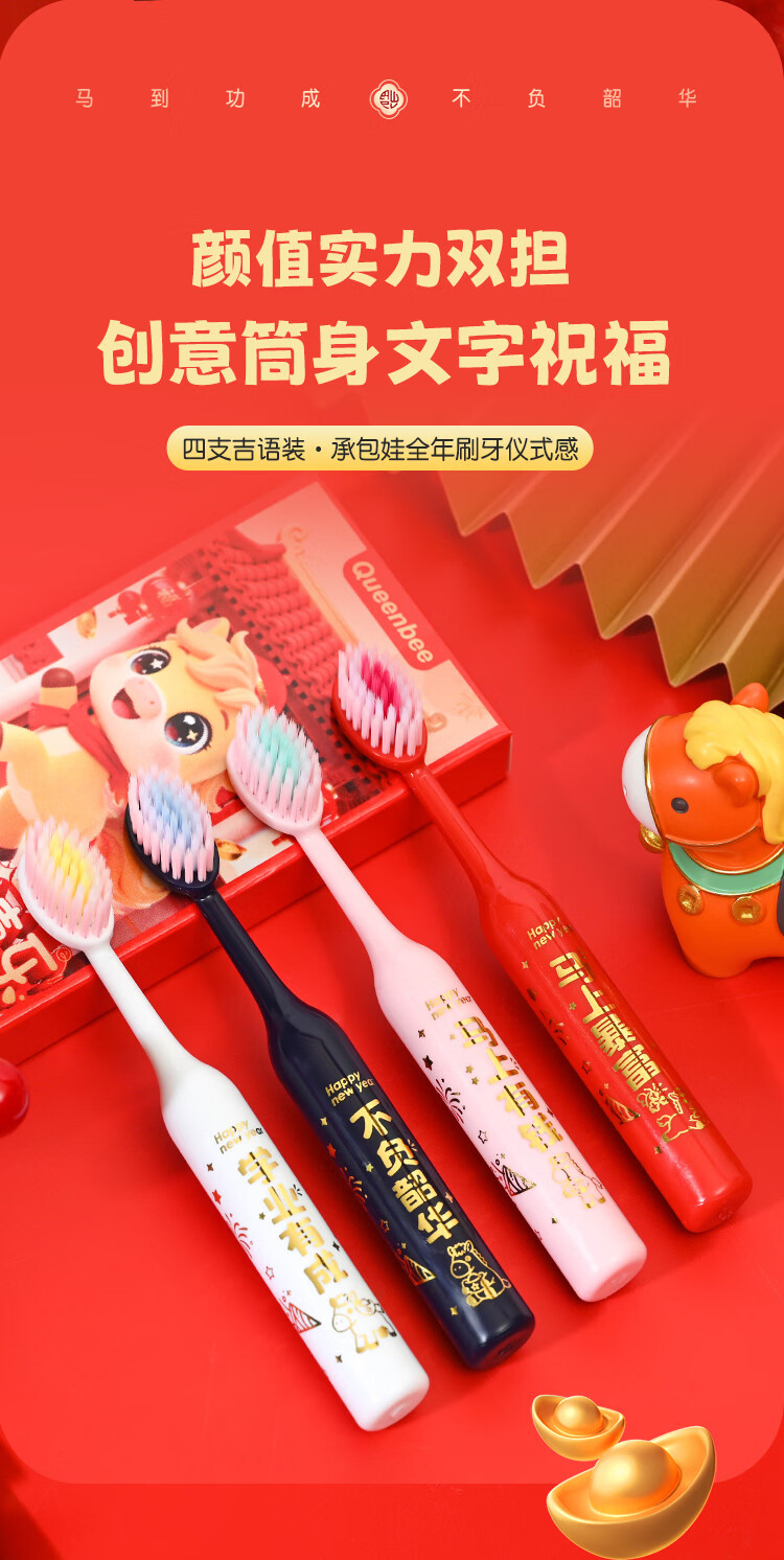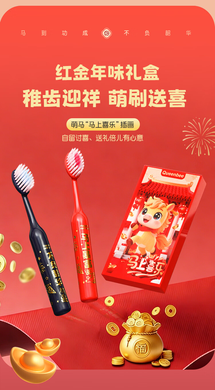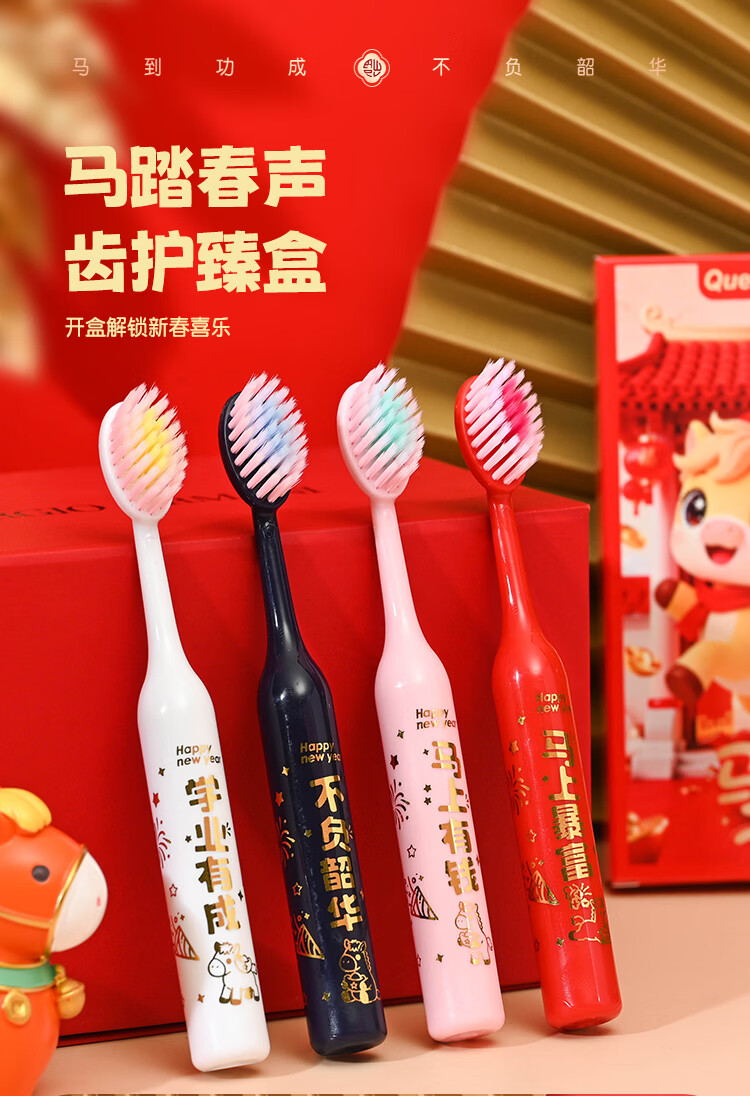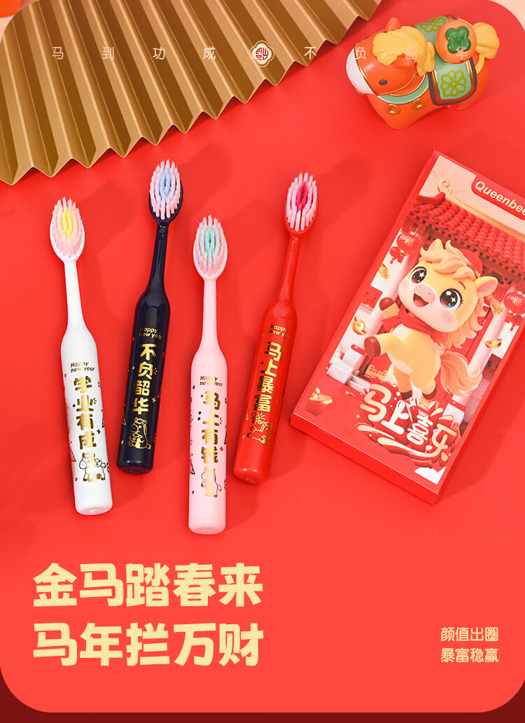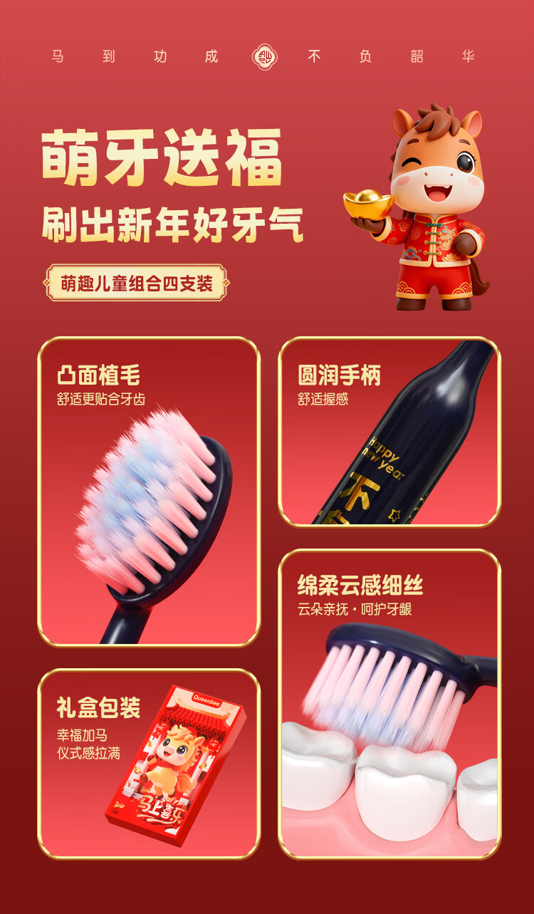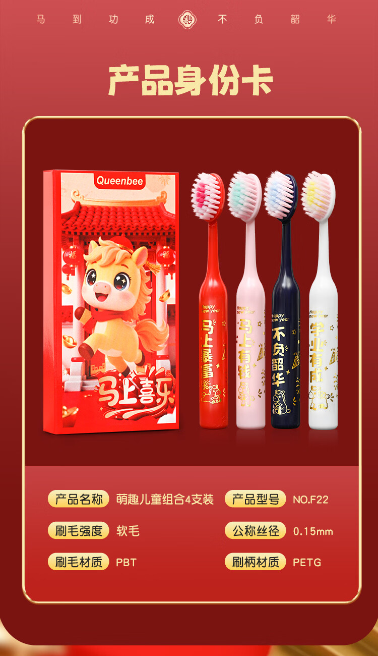 QUEENBEE【马年限量款】萌马送福儿童软毛绵柔护龈3-18岁圆润牙刷礼盒装 【萌马送福】儿童牙刷*8支