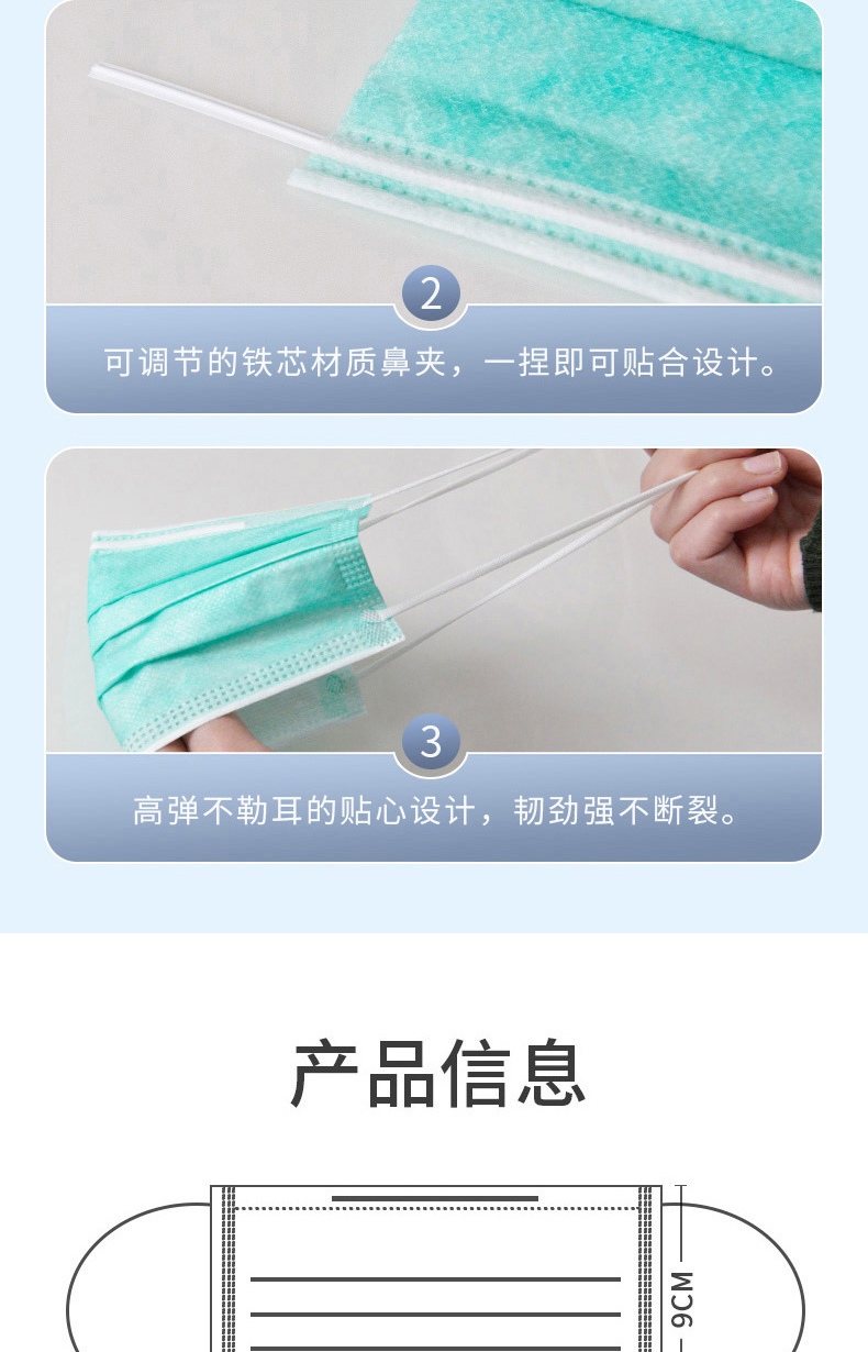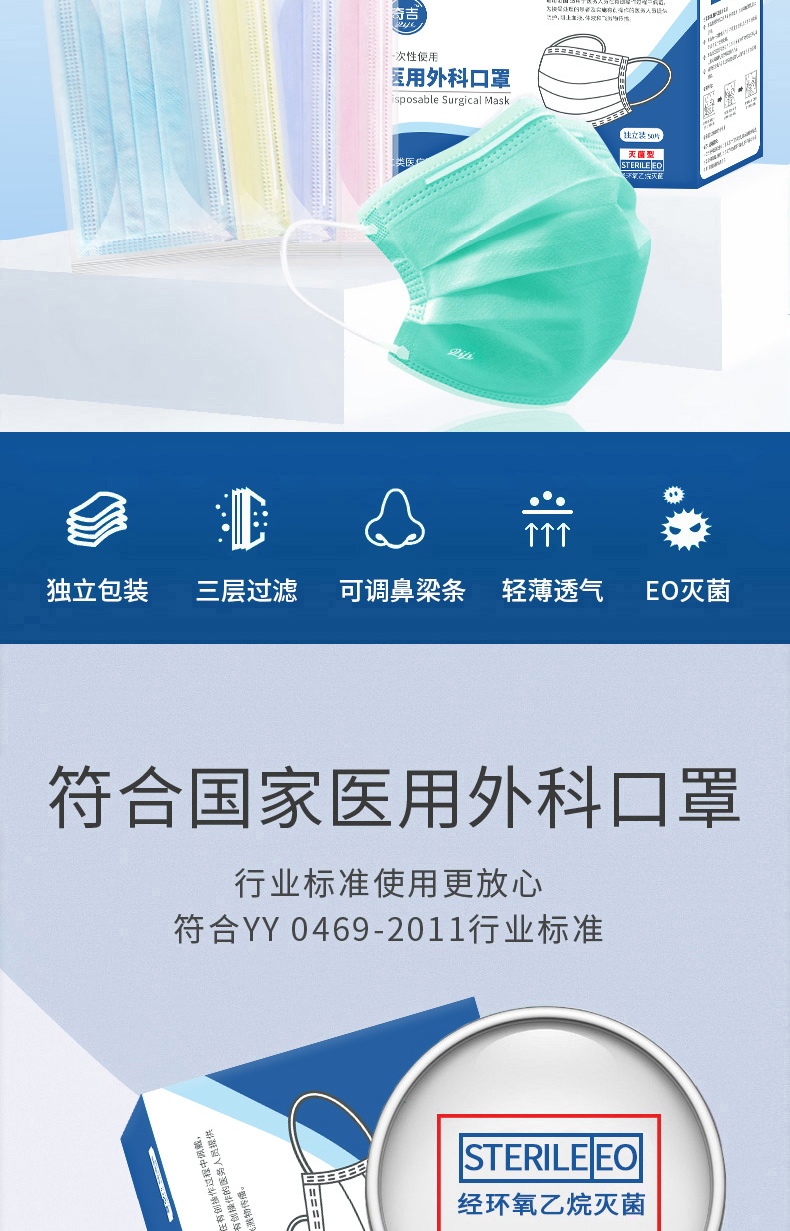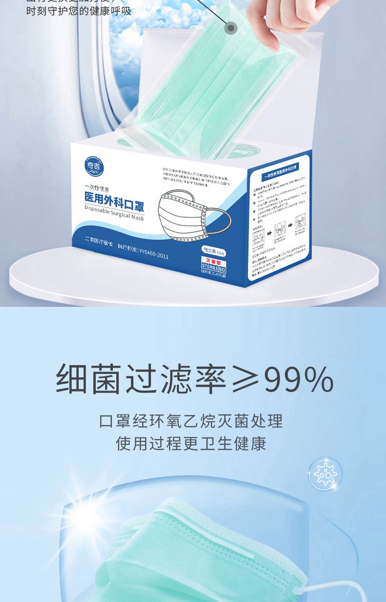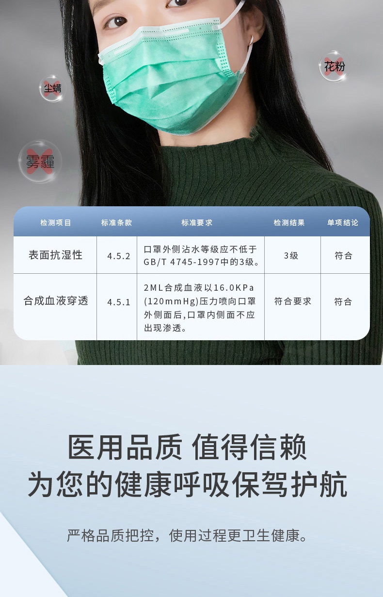 奇吉奥健一次性使用医用外科口罩防护甲流飞沫轻薄透气防晒灭菌型医院 灭菌级医用外科口罩【成人-绿】50片/盒(独立装)