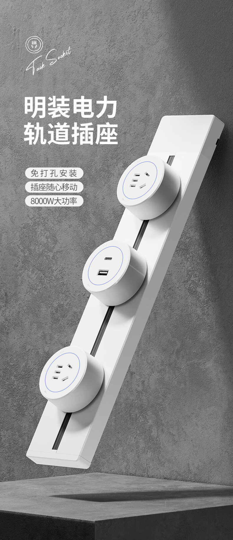 公牛王电器轨道插座德国品质电工可移动轨道插座明装式电力滑动导轨电源 黑色60CM轨道(五孔-带灯*3)黑色 e
