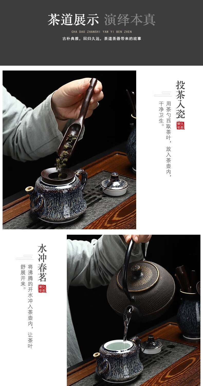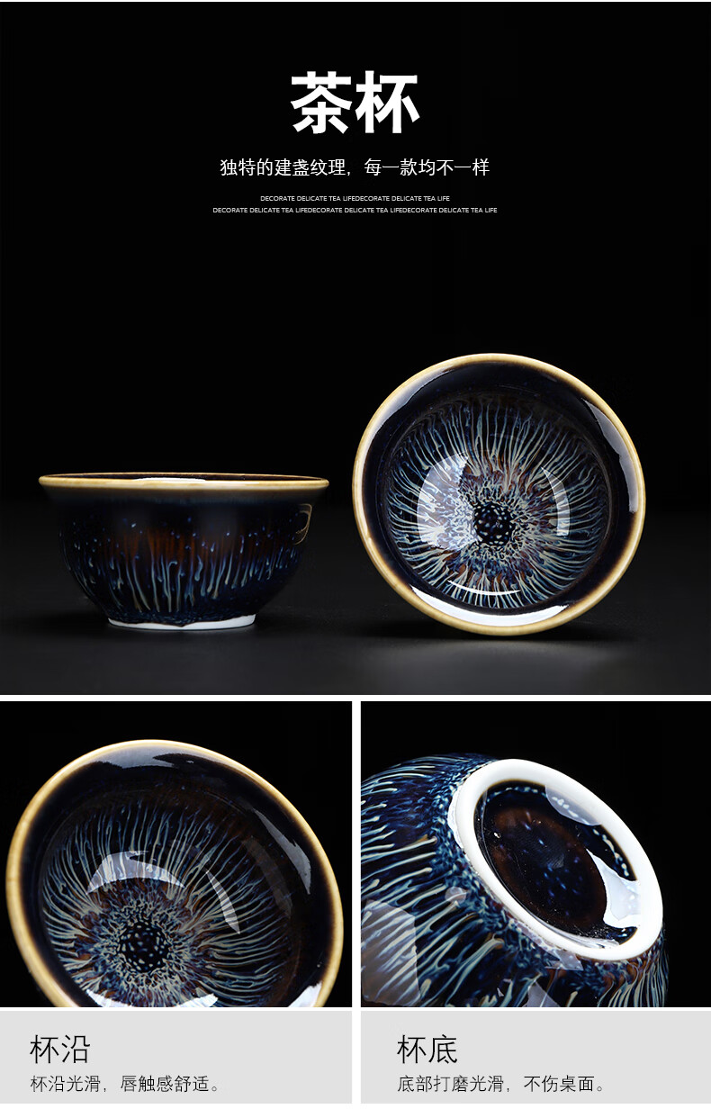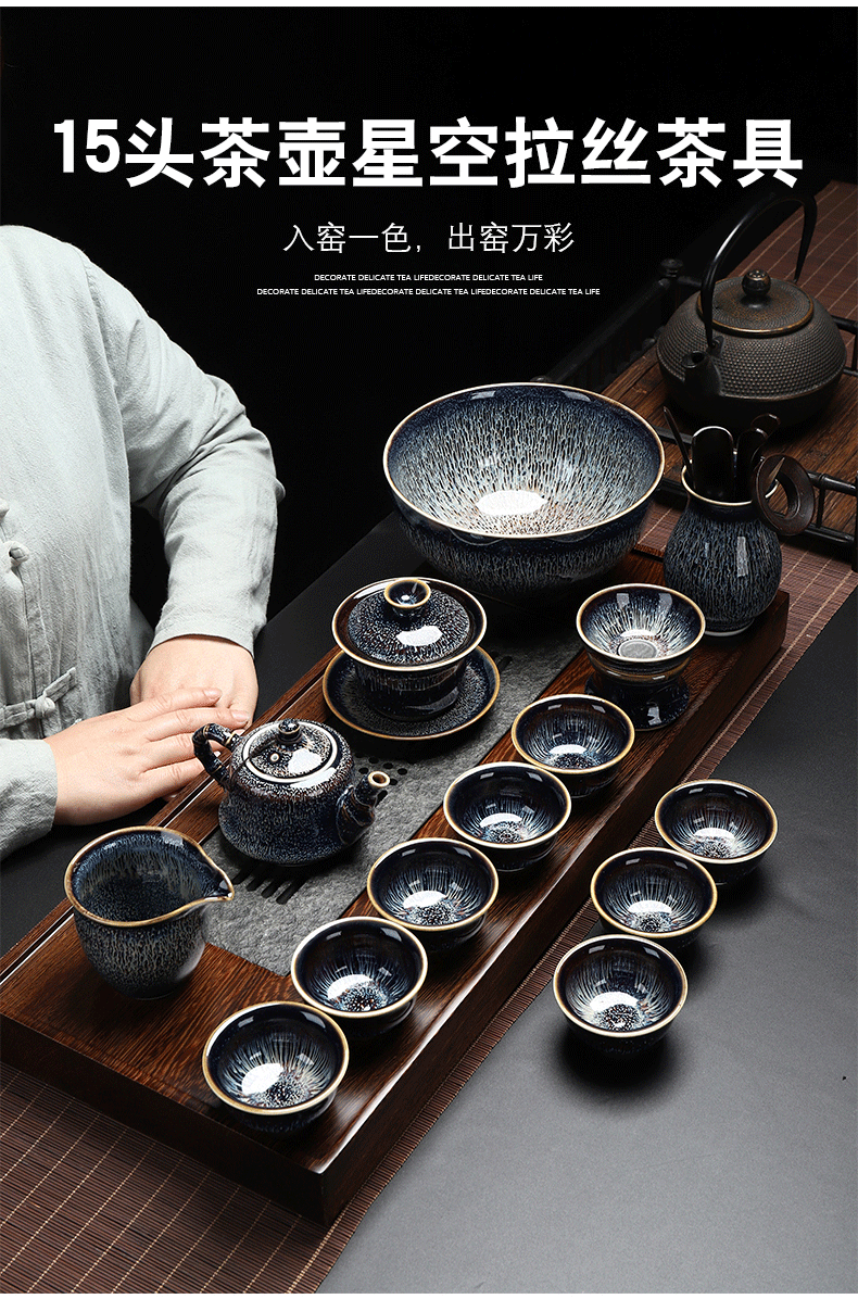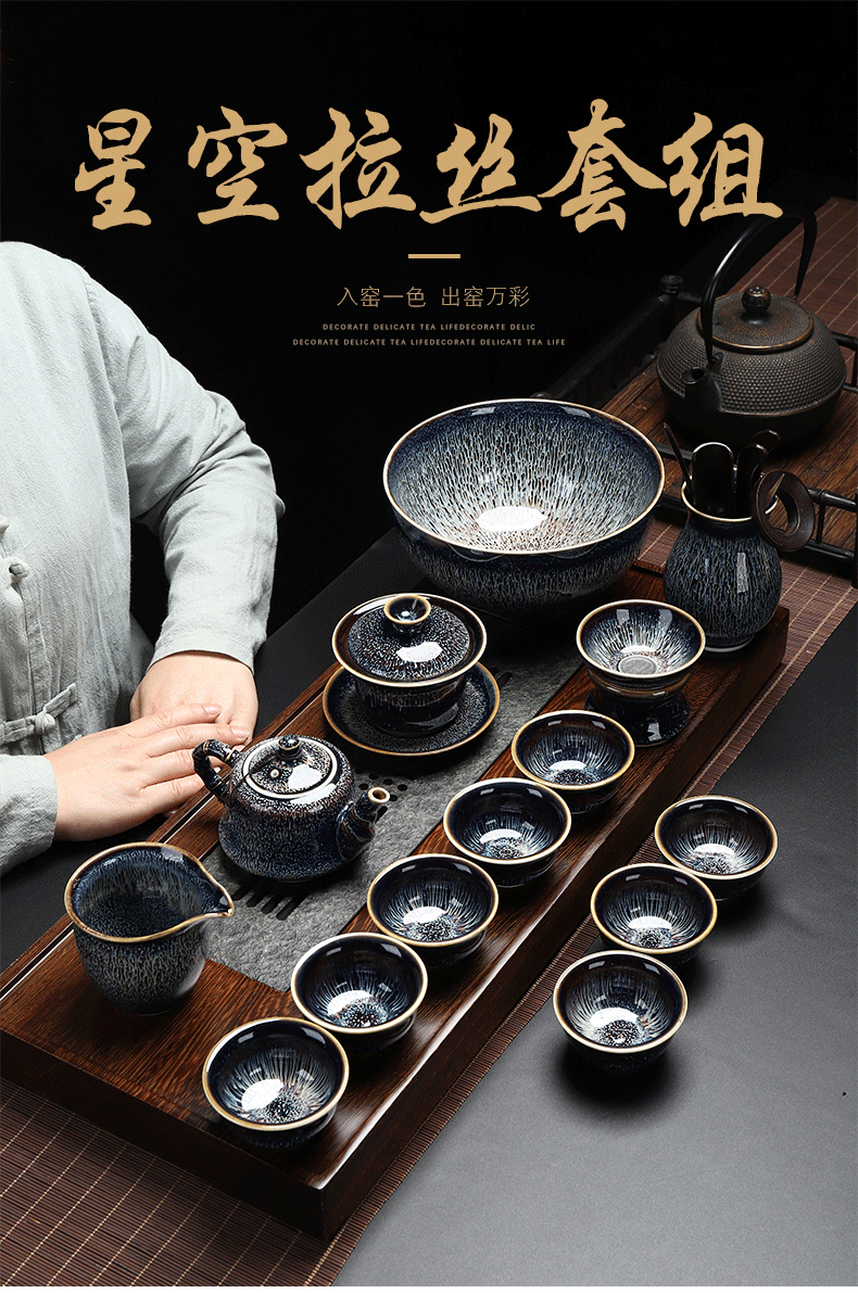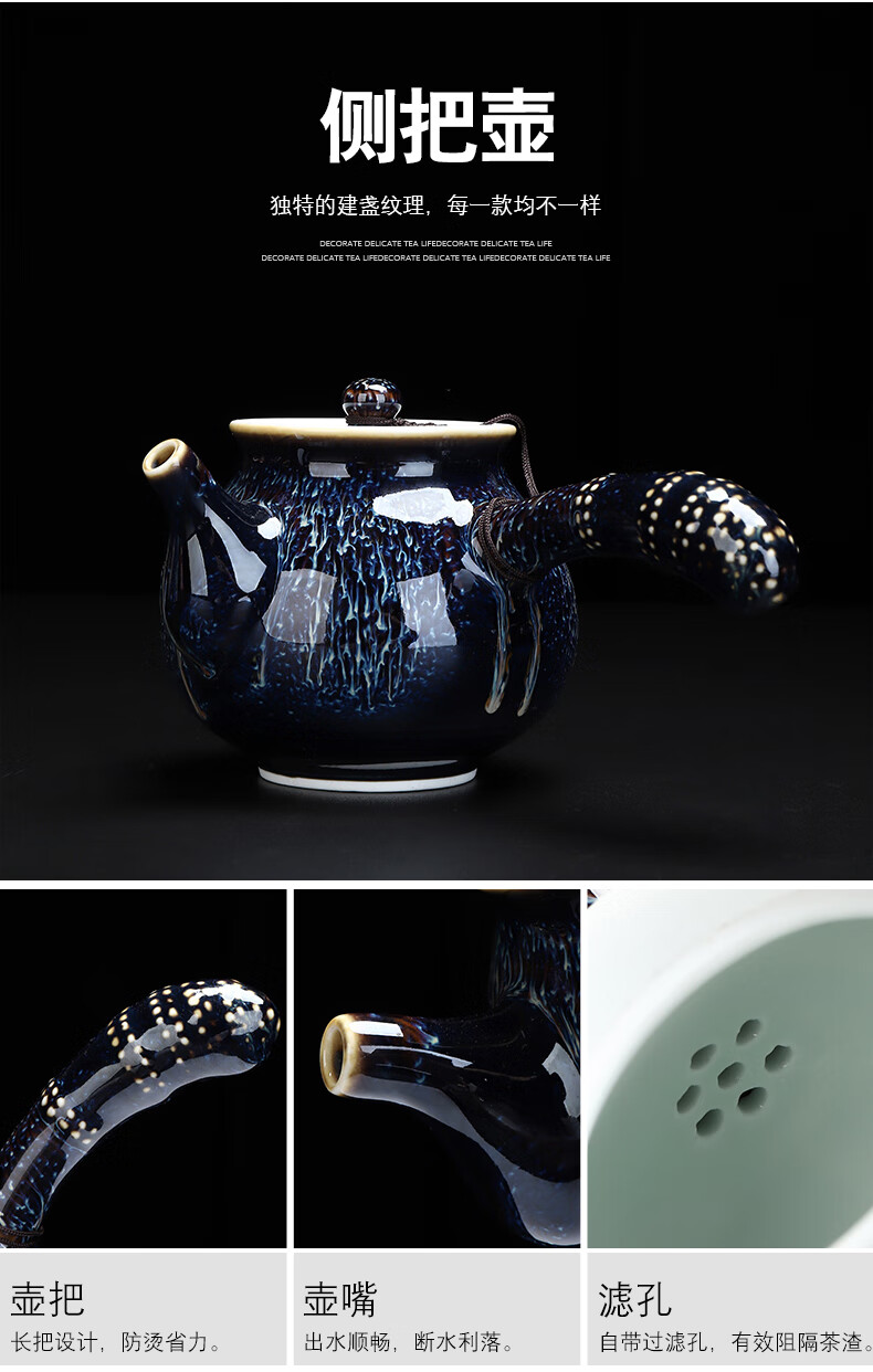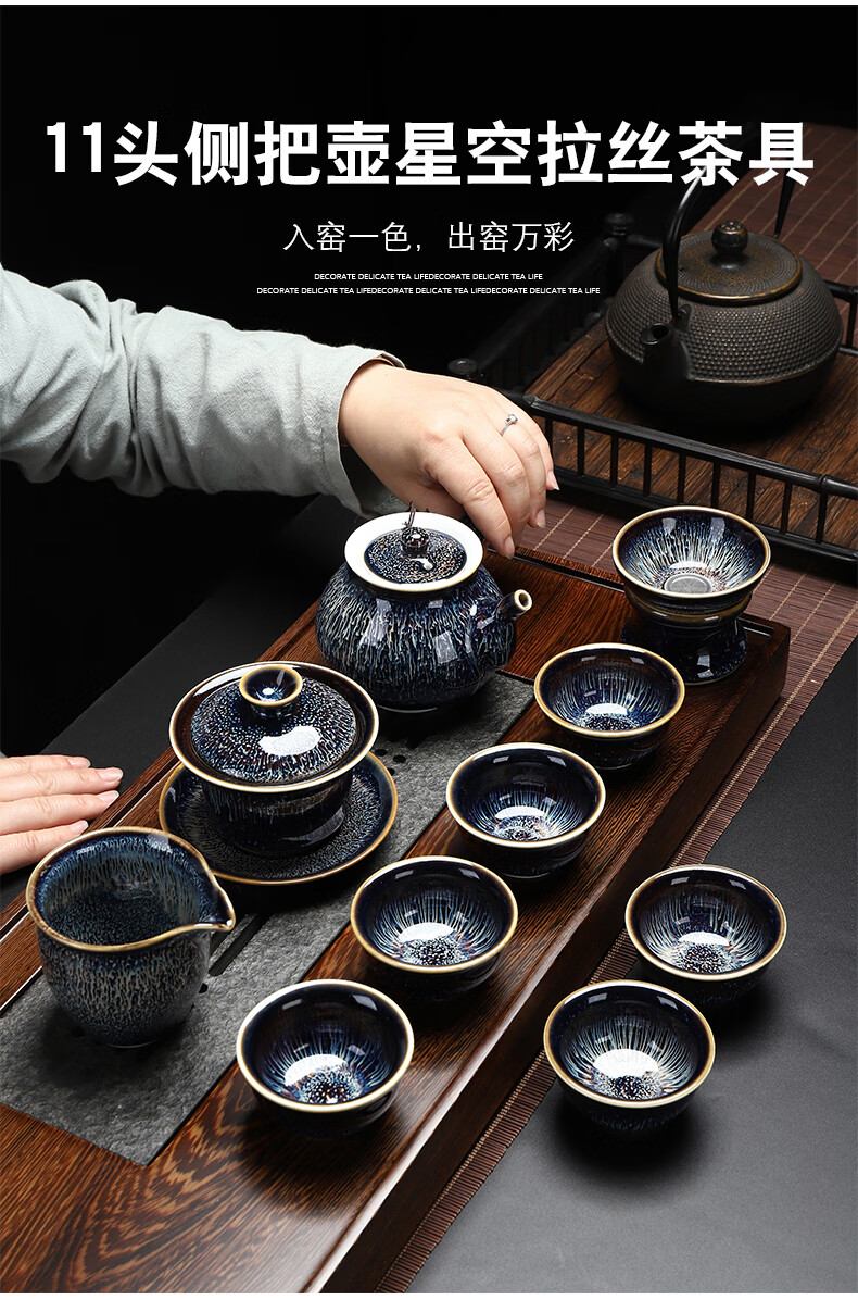 正扬建盏茶具套装家用整套窑变油滴天目铁胎茶壶茶盏杯功夫陶瓷景德镇 15头(璀璨星空)_侧把(竹节壶)