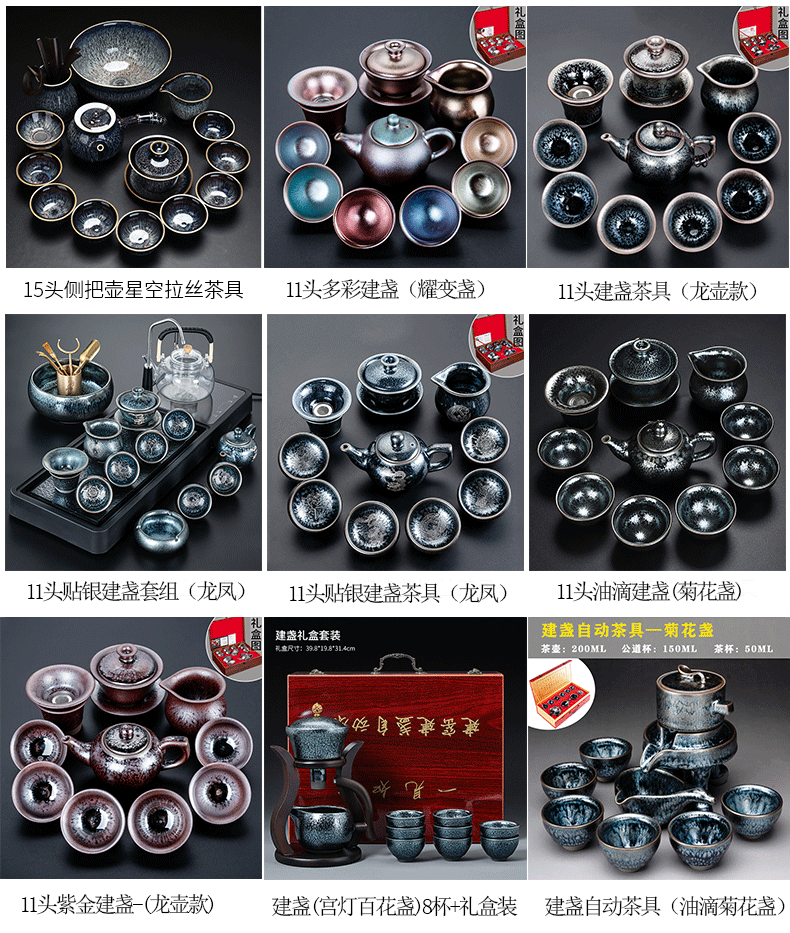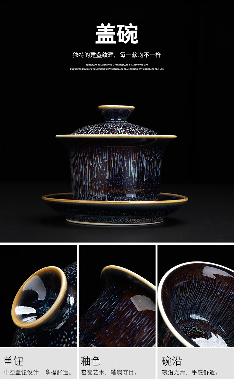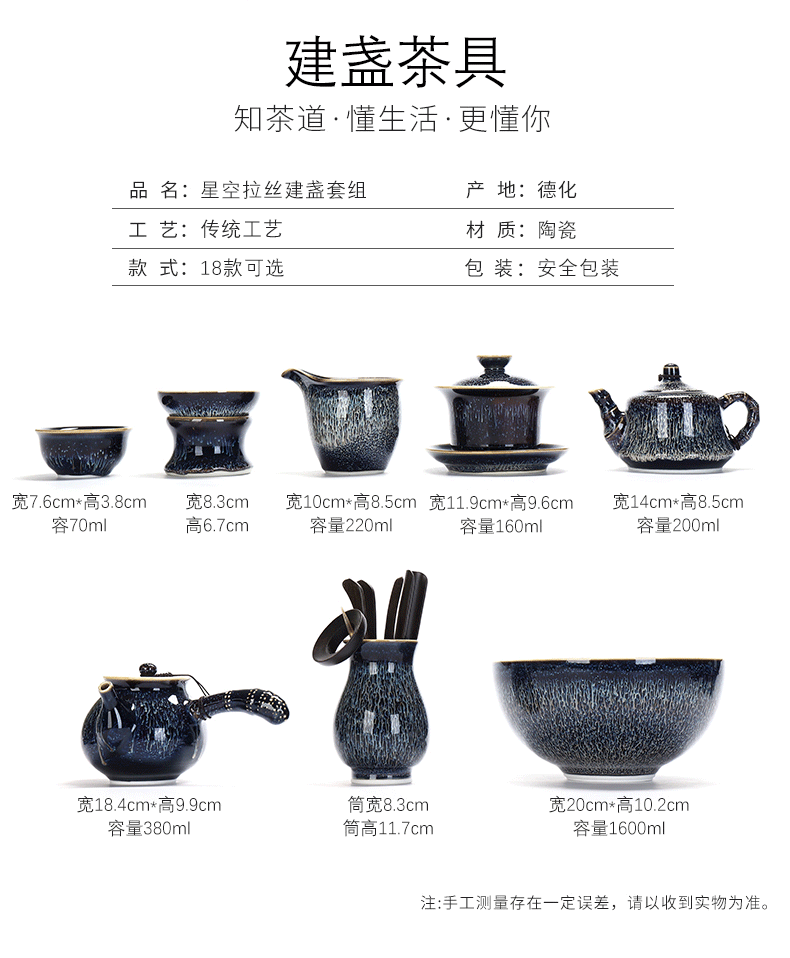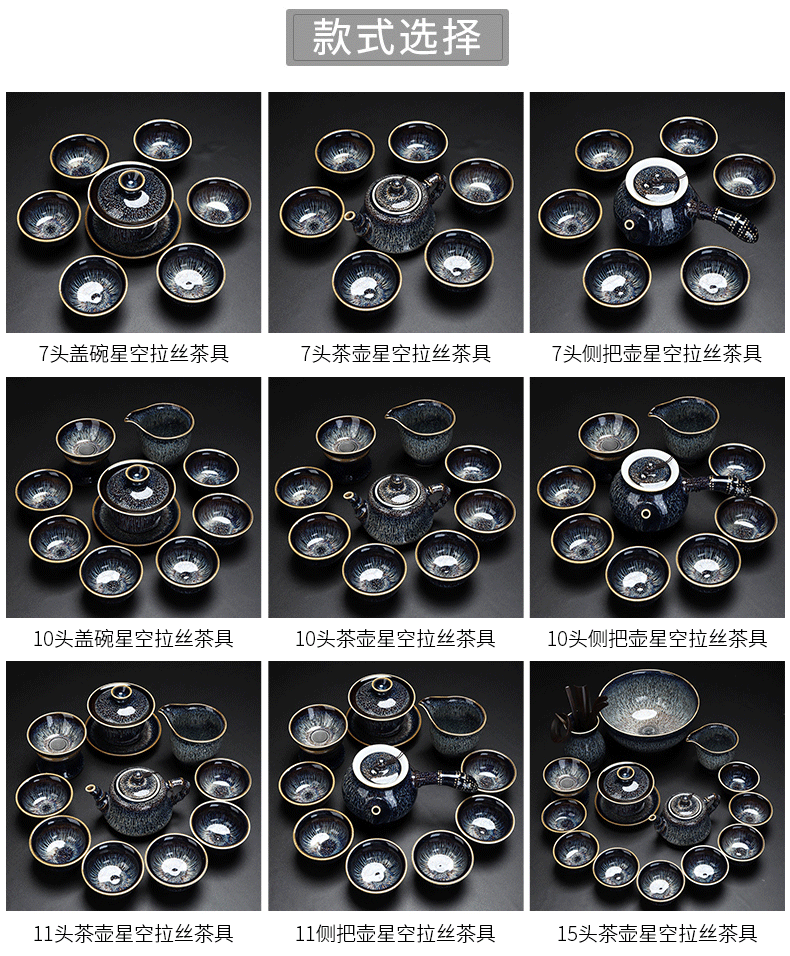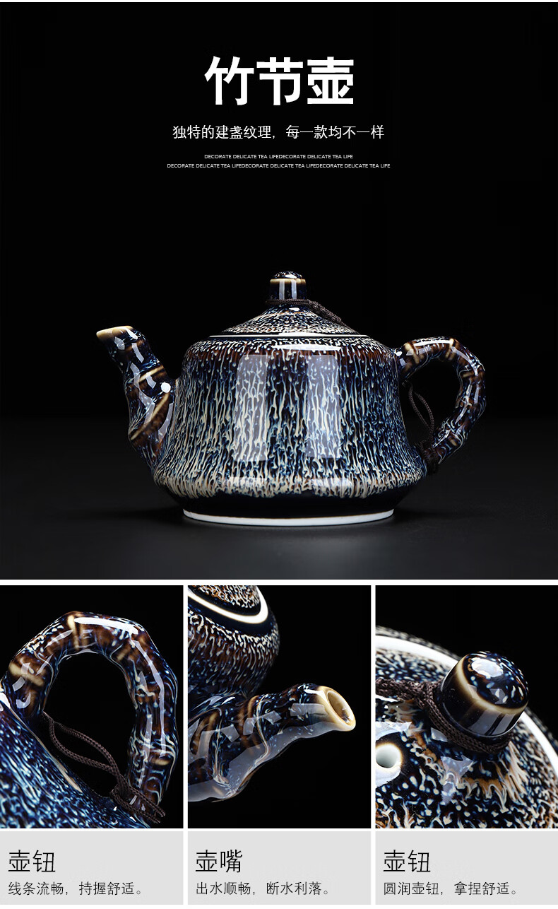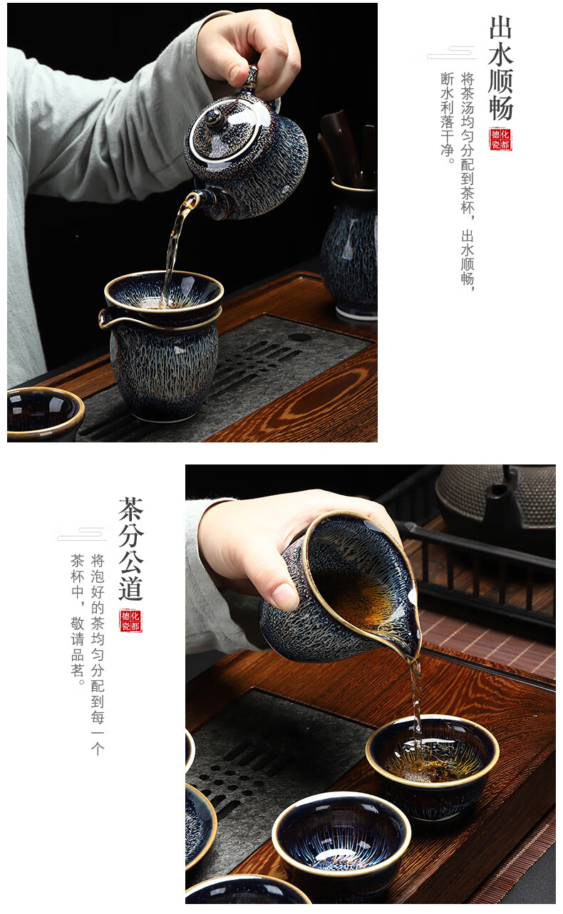 正扬建盏茶具套装家用整套窑变油滴天目铁胎茶壶茶盏杯功夫陶瓷景德镇 15头(璀璨星空)_侧把(竹节壶)