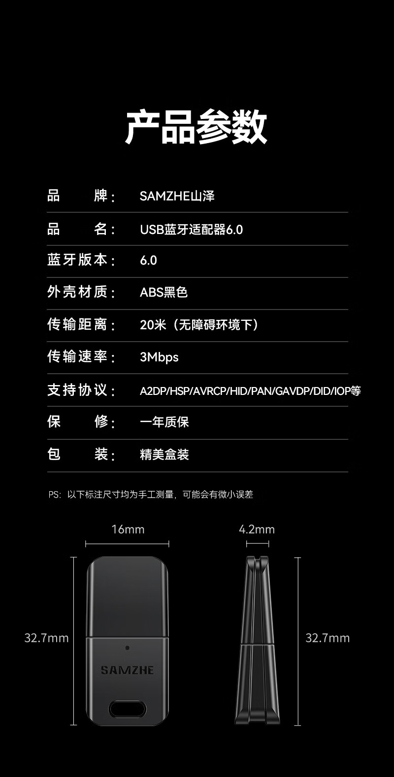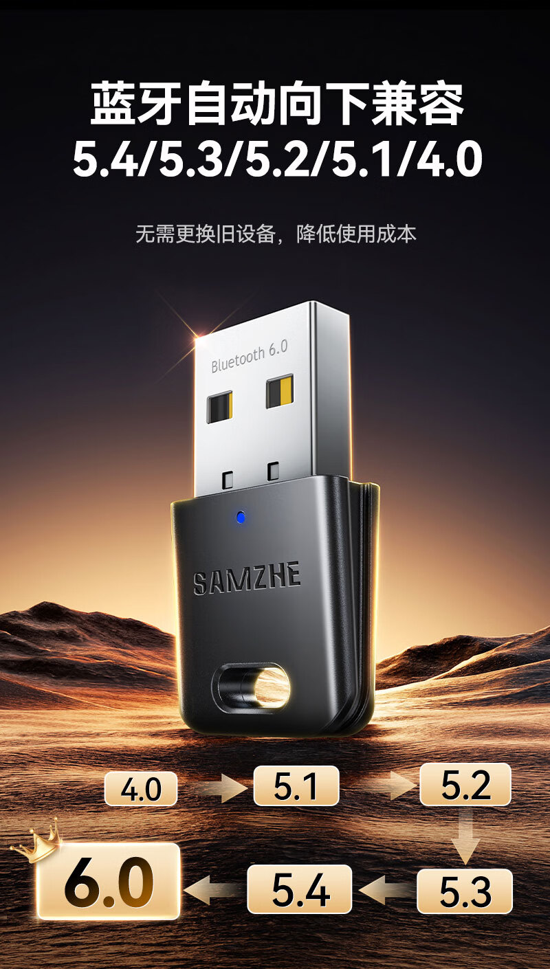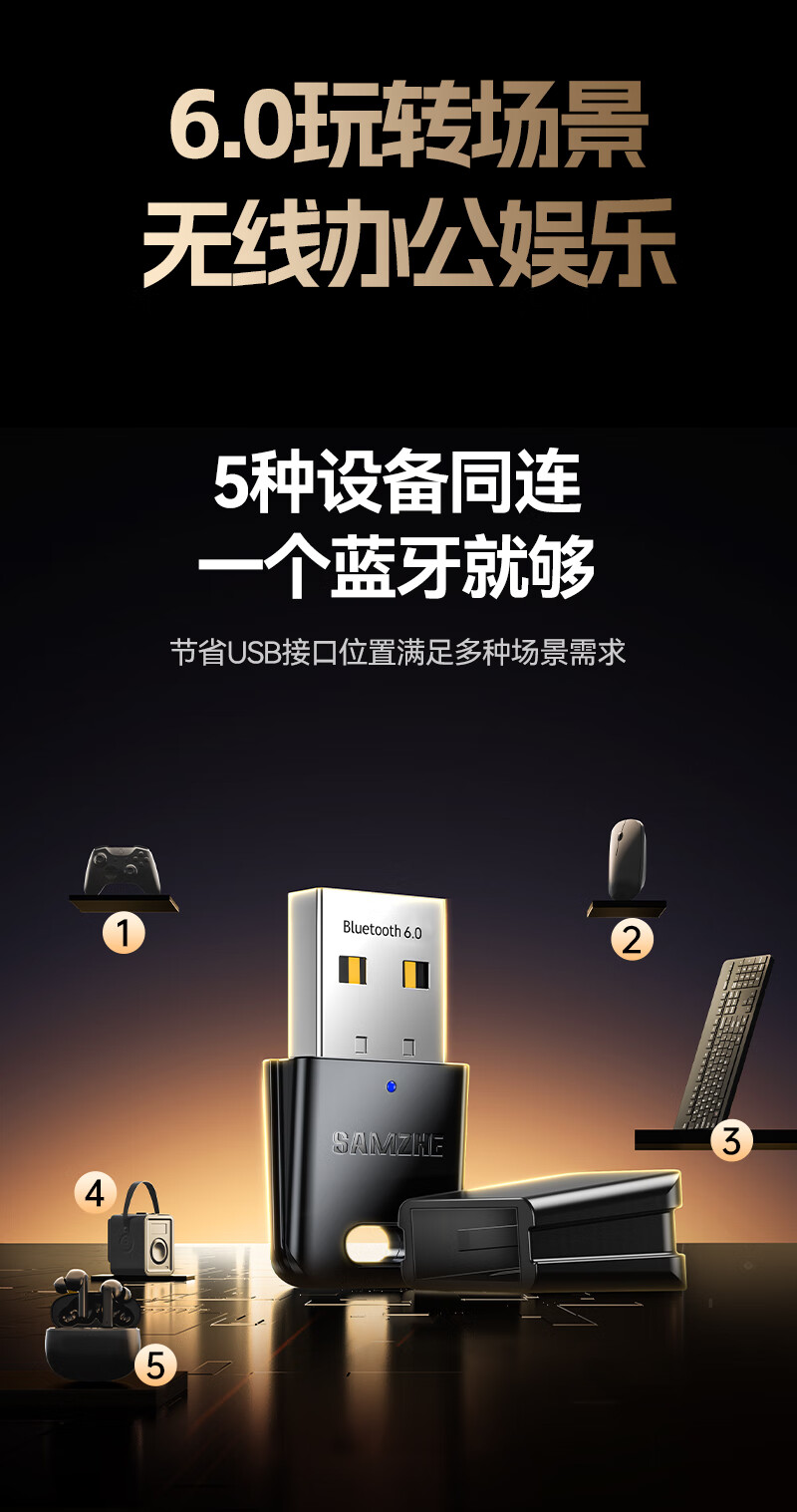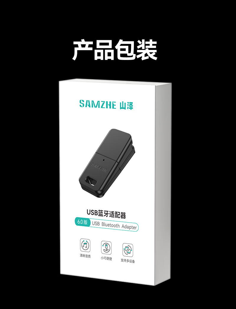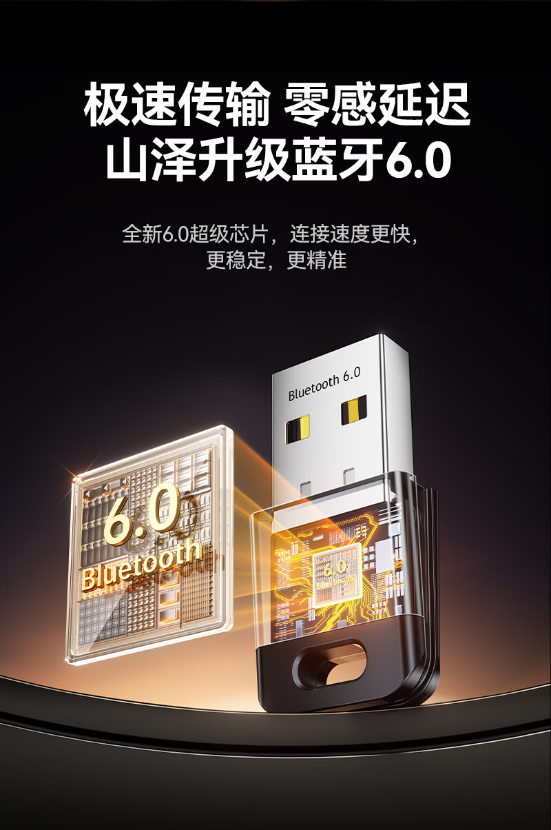 山泽USB蓝牙适配器6.0接收器发射器 电脑台式机键盘鼠标音响音频耳机ps5手柄pc外置无线免驱蓝牙模块