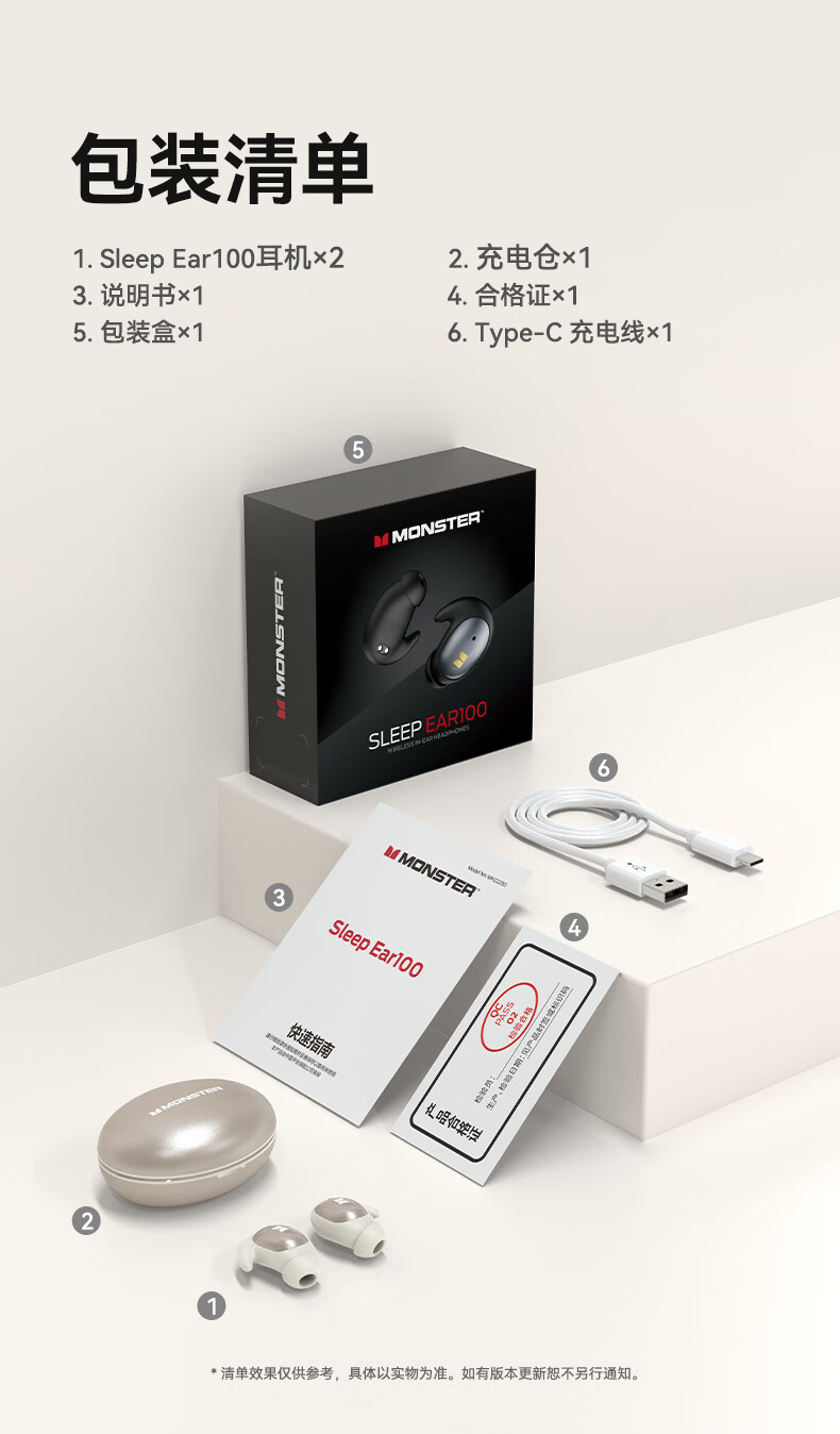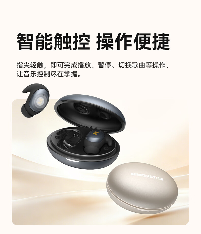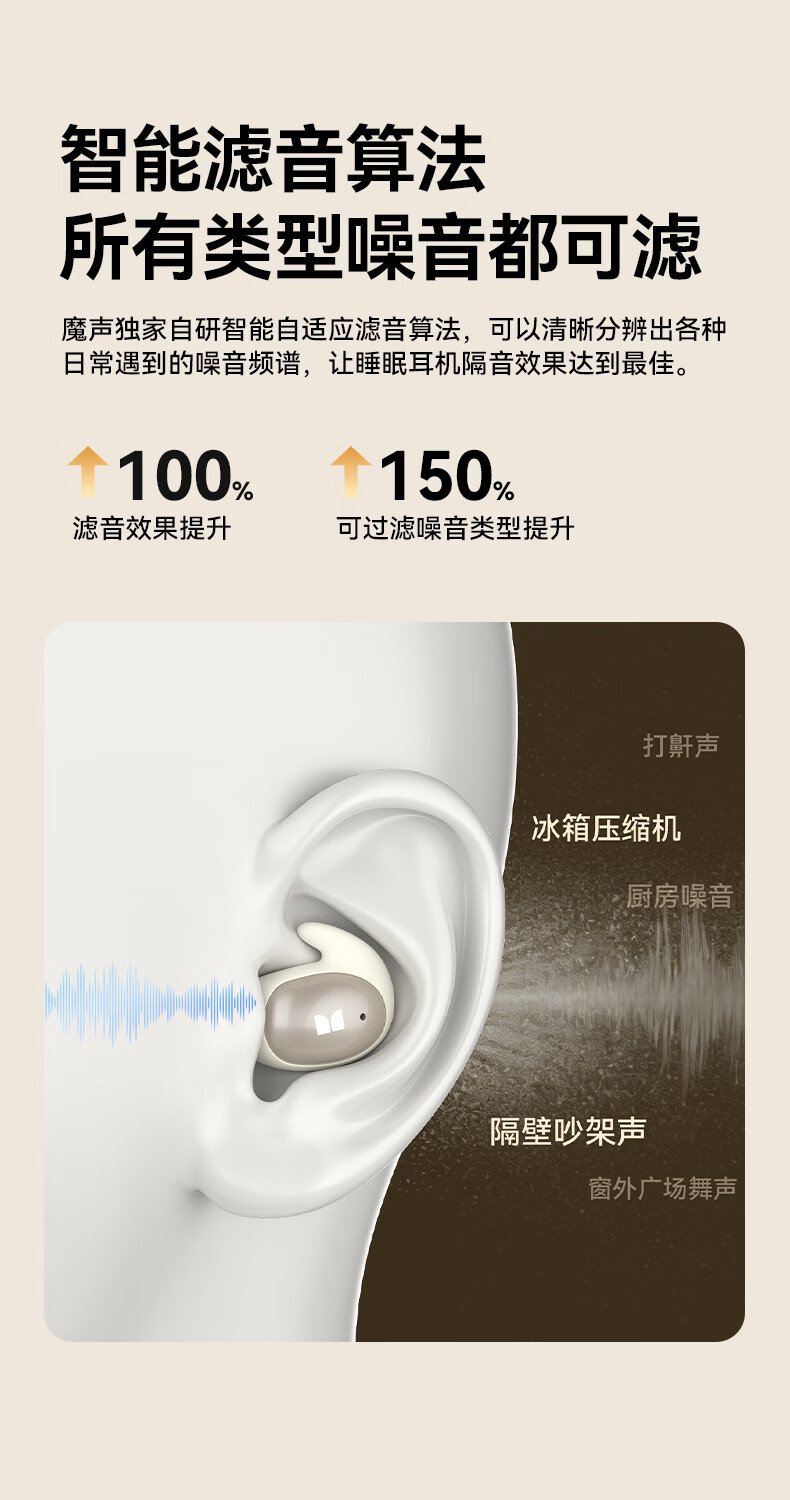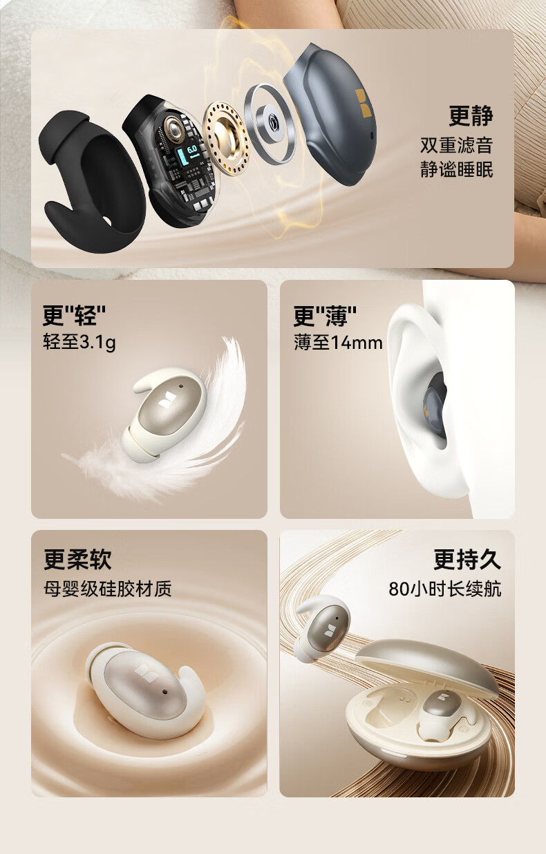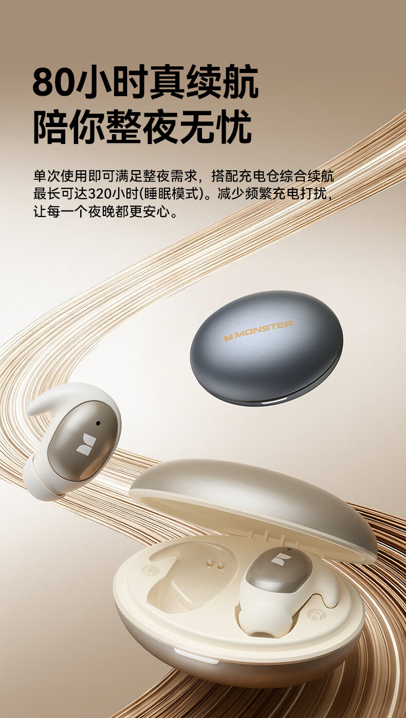 魔声(Monster)Sleep Ear100 睡眠耳机蓝牙降噪隔音耳塞无痛侧睡零压感超薄舒适不压耳助眠入耳式隐形 肤白色【深度降噪助眠+80h续航】