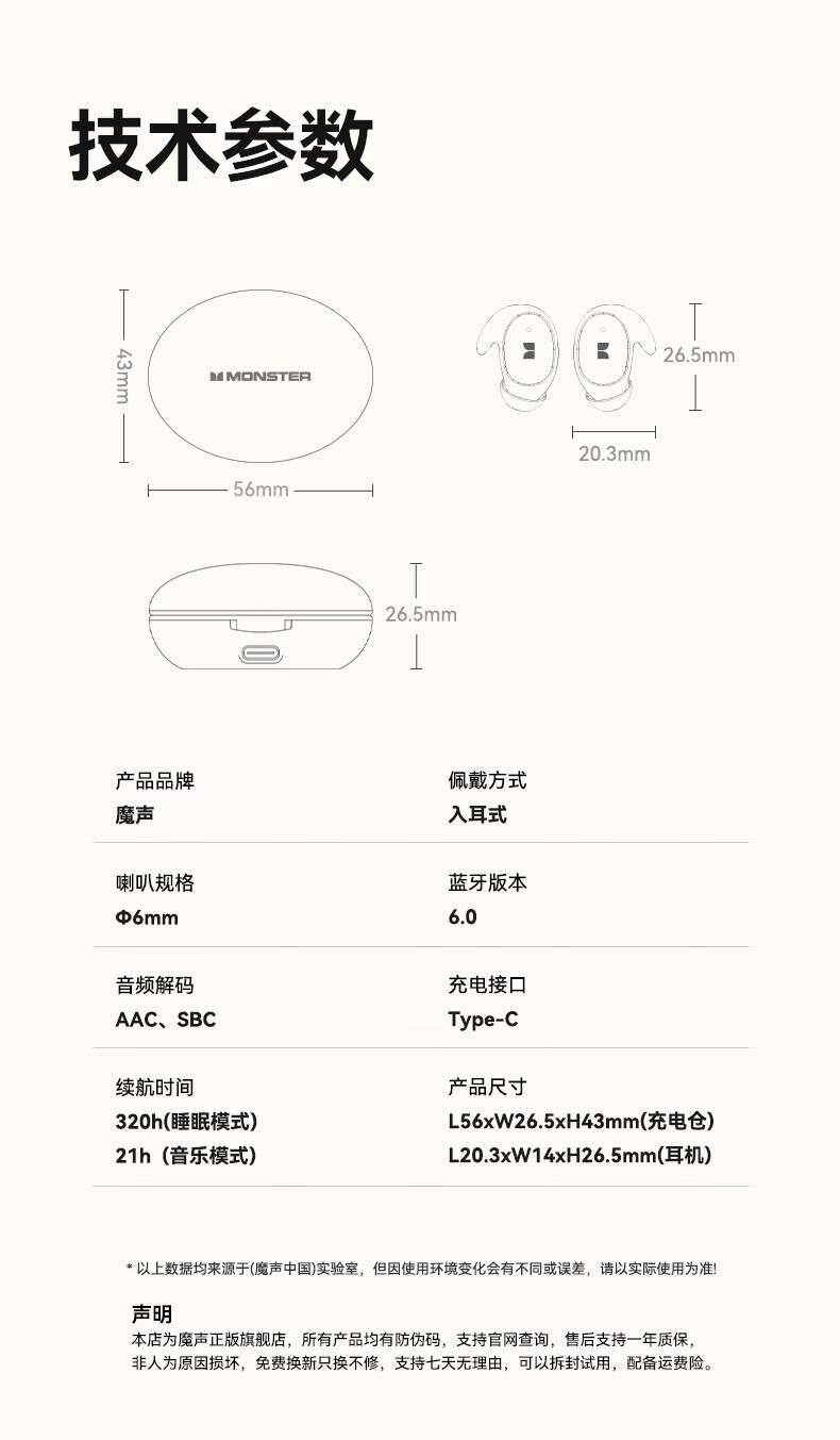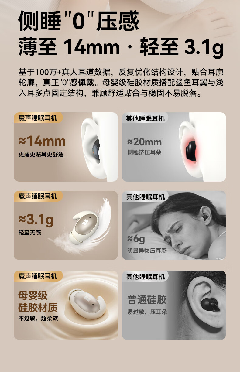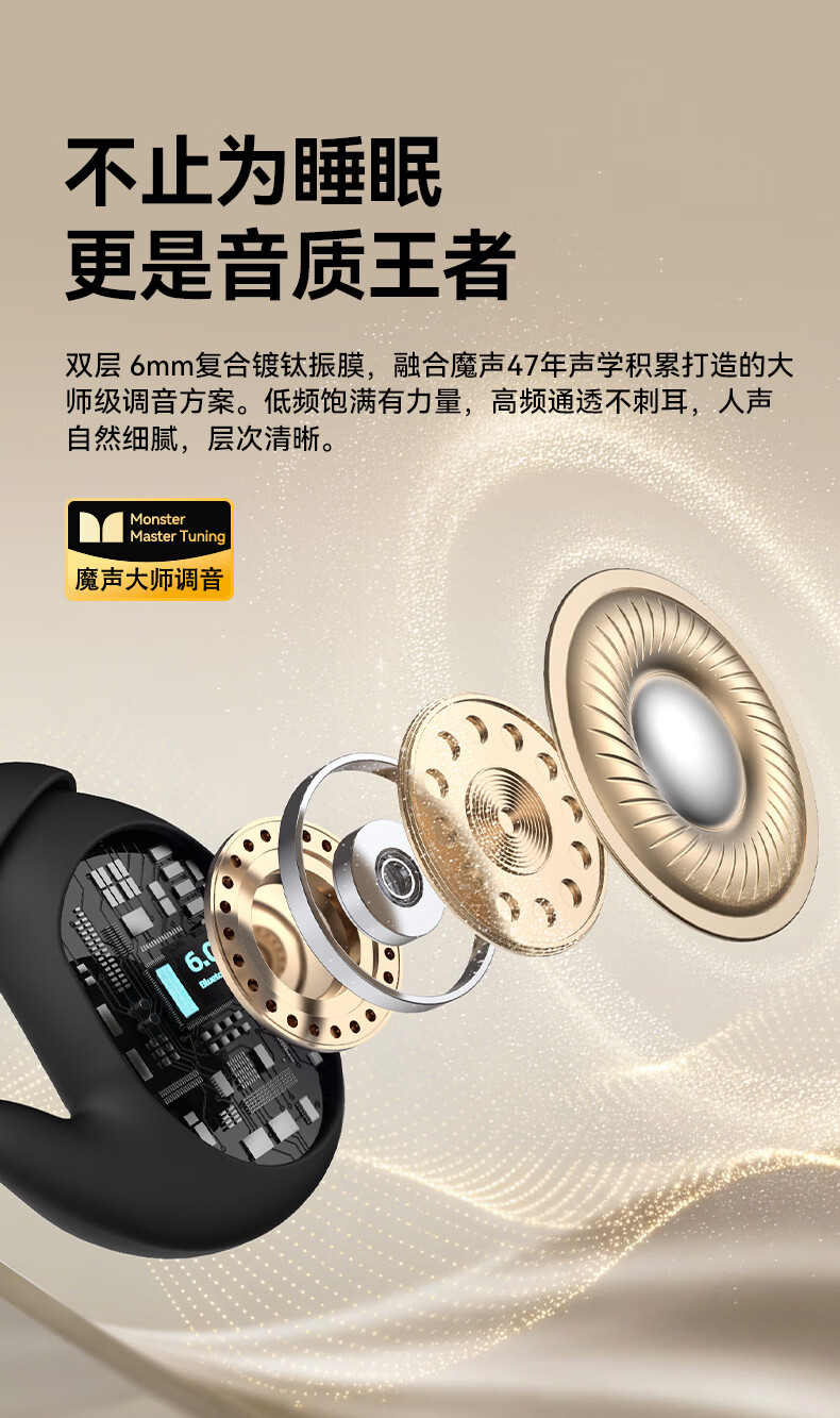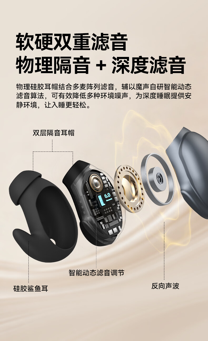 魔声(Monster)Sleep Ear100 睡眠耳机蓝牙降噪隔音耳塞无痛侧睡零压感超薄舒适不压耳助眠入耳式隐形 肤白色【深度降噪助眠+80h续航】