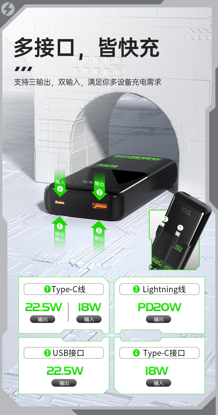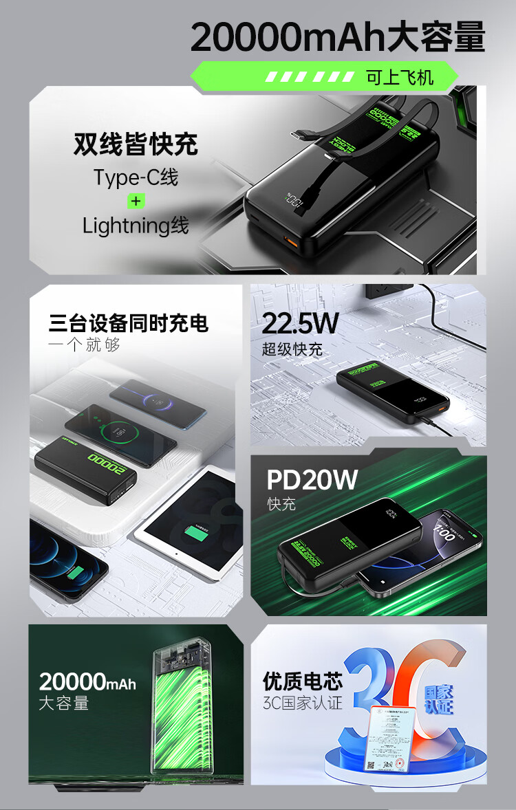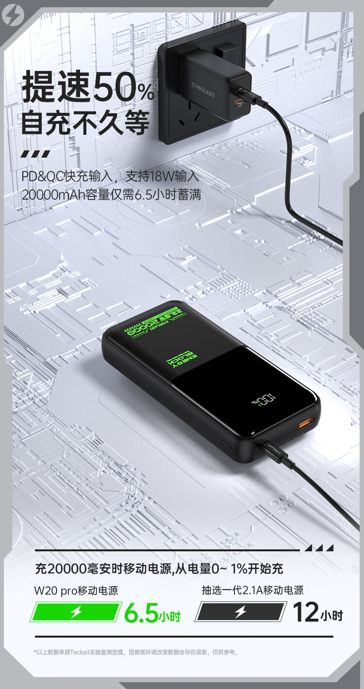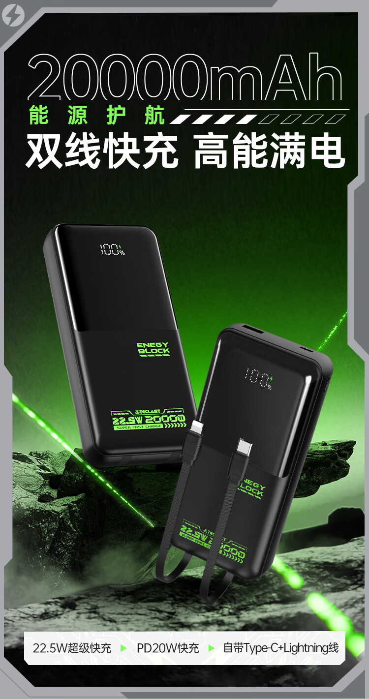台电(TECLAST)充电宝【3C认证】20000毫安时自带线22.5W双向快充可上飞机大容量移动电源 适用小米苹果安卓绿色