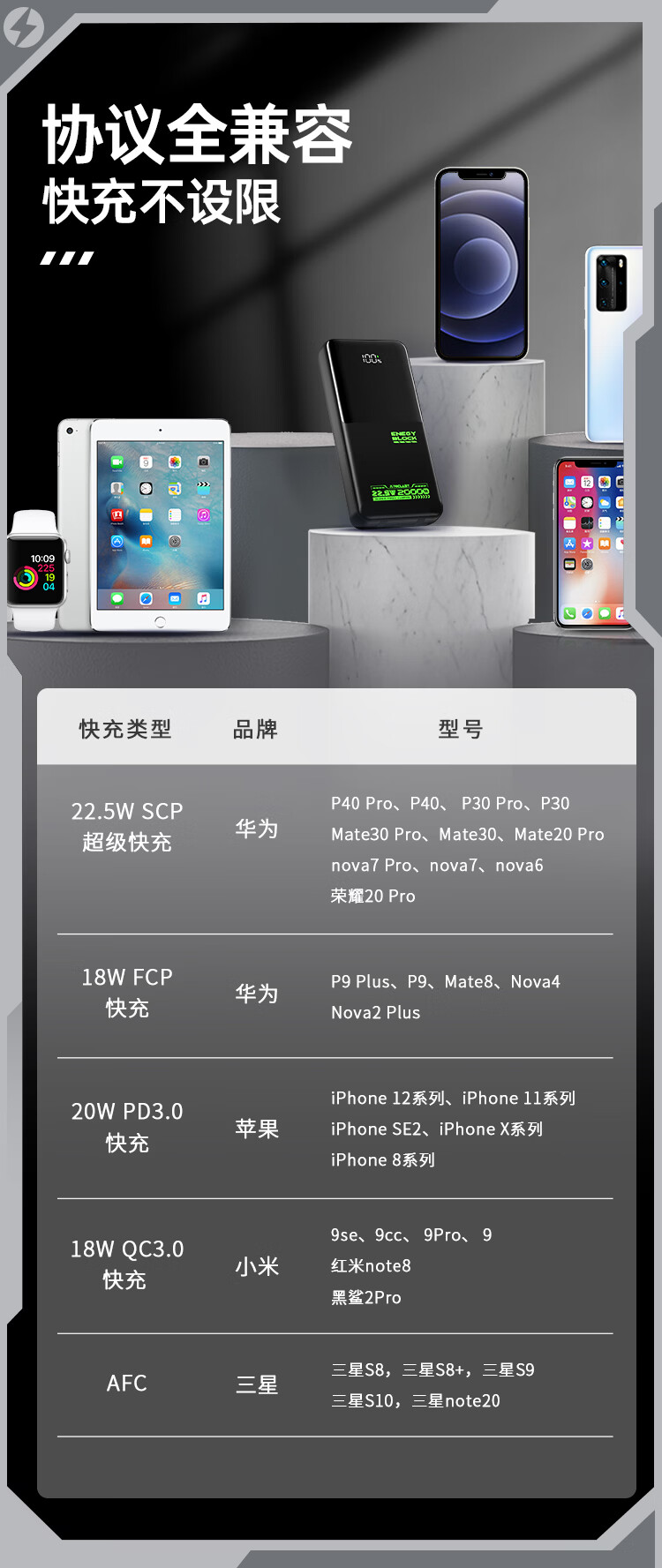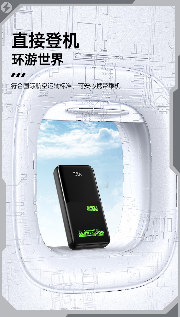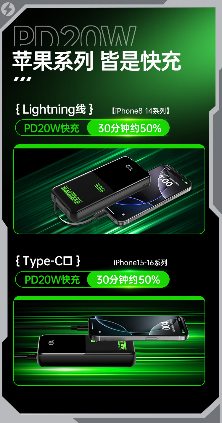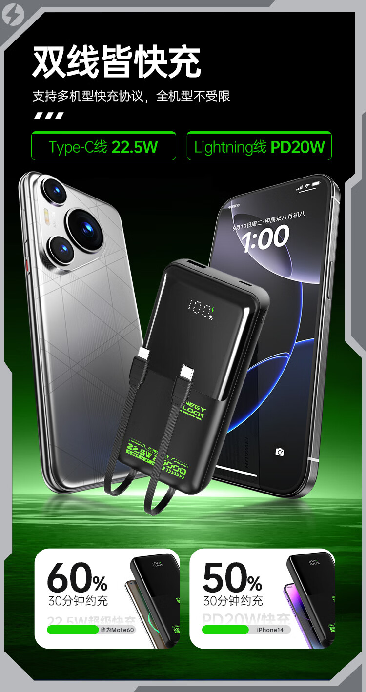 台电(TECLAST)充电宝【3C认证】20000毫安时自带线22.5W双向快充可上飞机大容量移动电源 适用小米苹果安卓绿色
