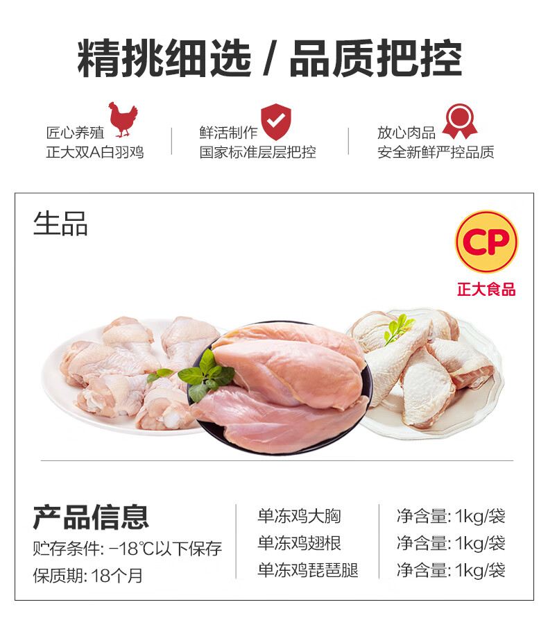 正大食品鸡肉组合净重6斤 琵琶腿+鸡翅根+鸡大胸各2斤 冷冻生鲜